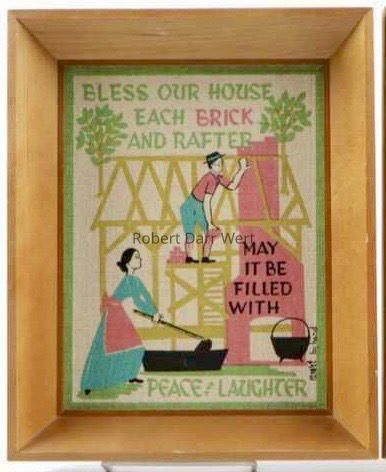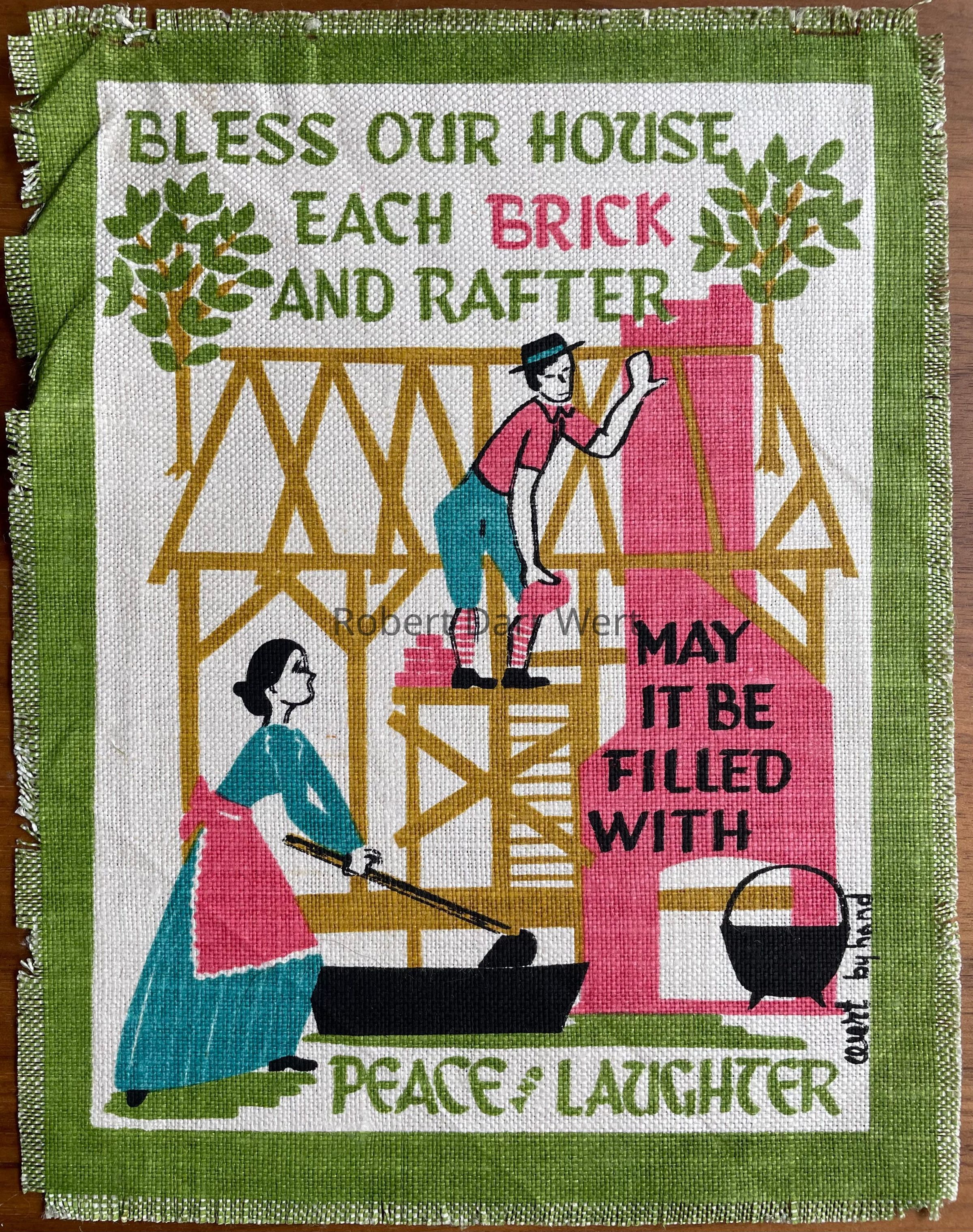 A five-color silkscreen print on off-white linen depicting a Pennsylvania “Dutch” couple building a farmhouse. The man stands within the house framing holding a brick in one hand while reaching toward the unfinished chimney. Below, a woman mixes mortar in a trough with a hoe. The illustration supports a house blessing that reads, “Bless this house, each brick and rafter, may it be filled with peace and laughter”.