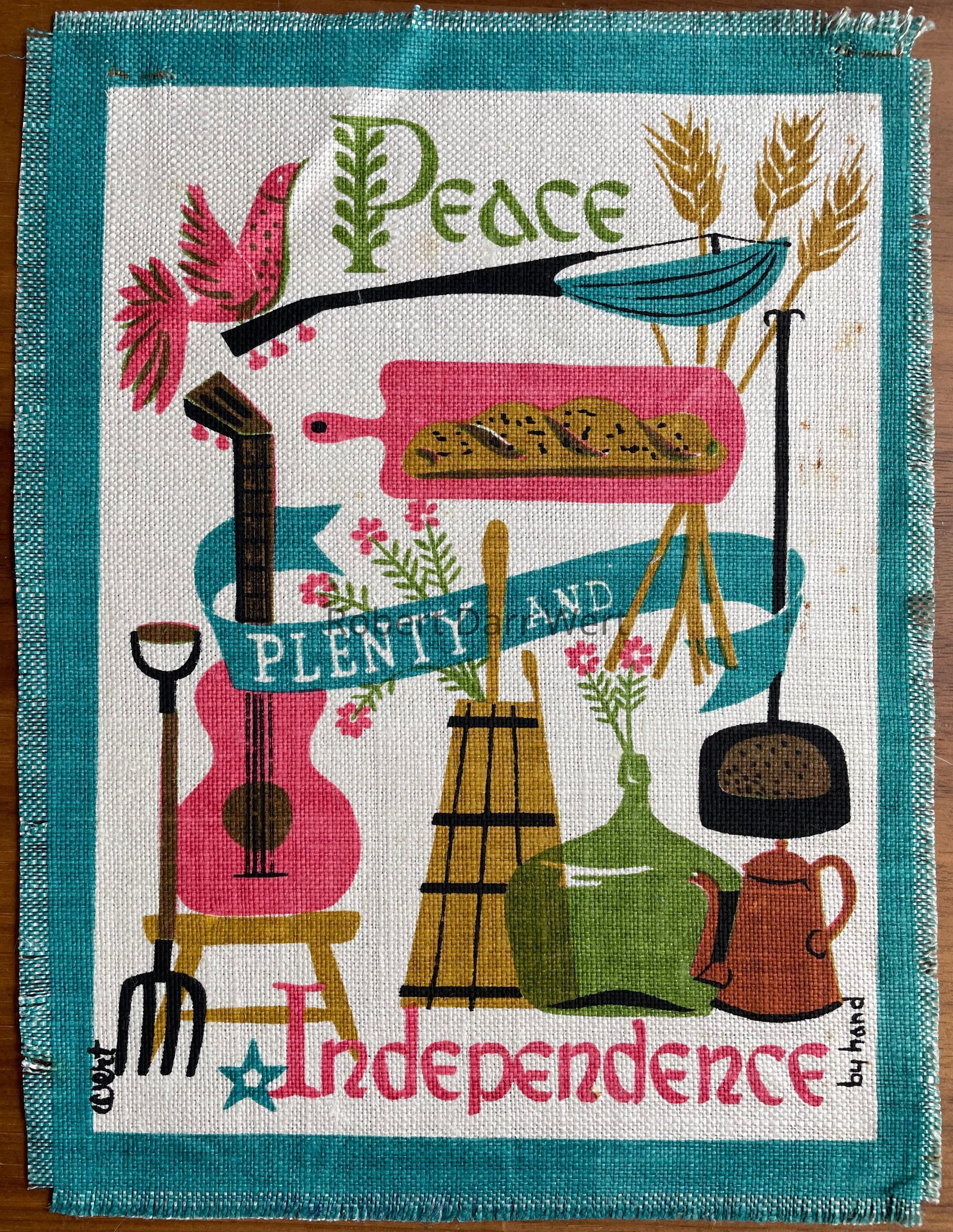 A silkscreen print on off-white linen depicting musical instruments, farm tools, and cooking implements illustrating the words, “Peace, Plenty, Independence”.