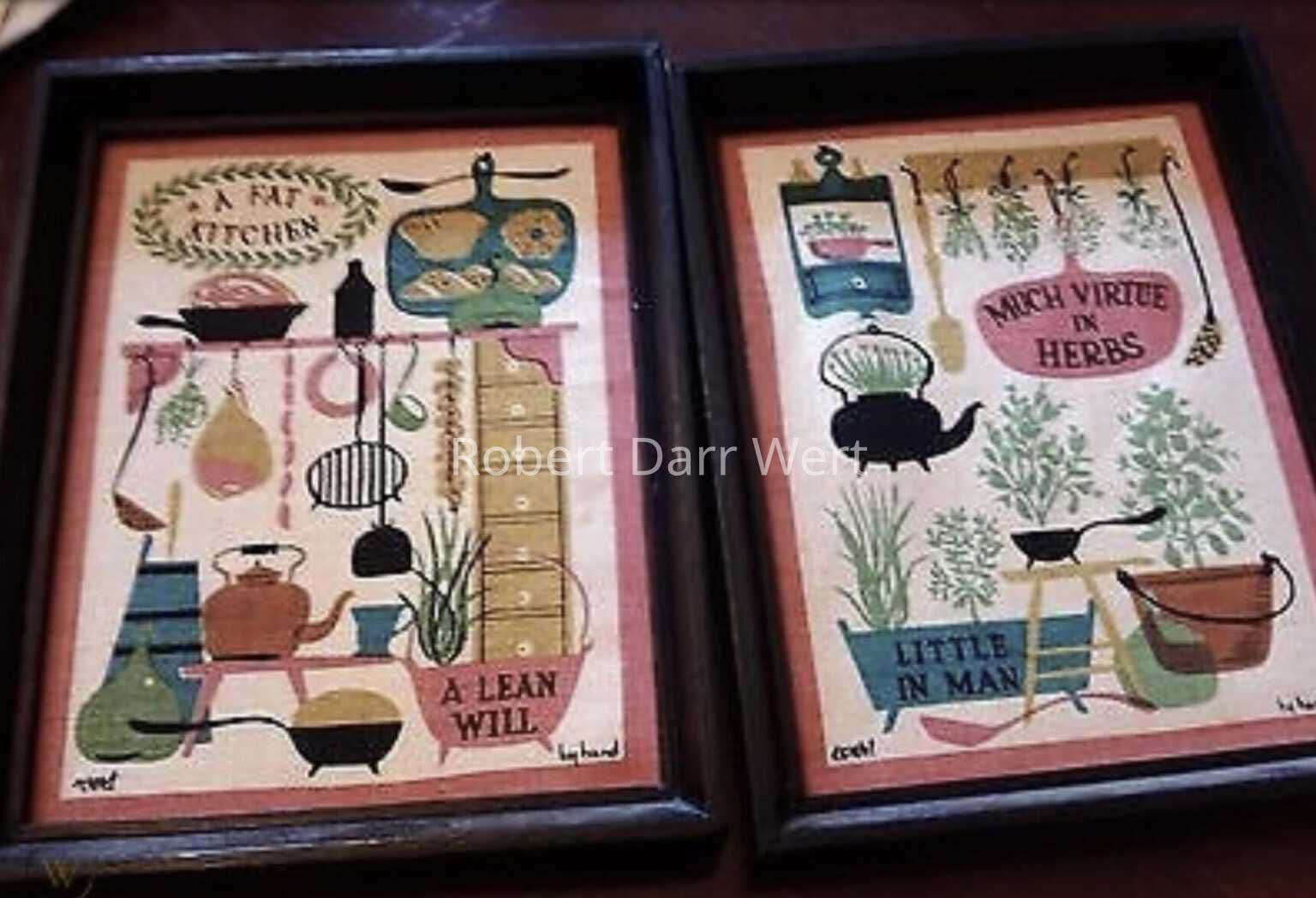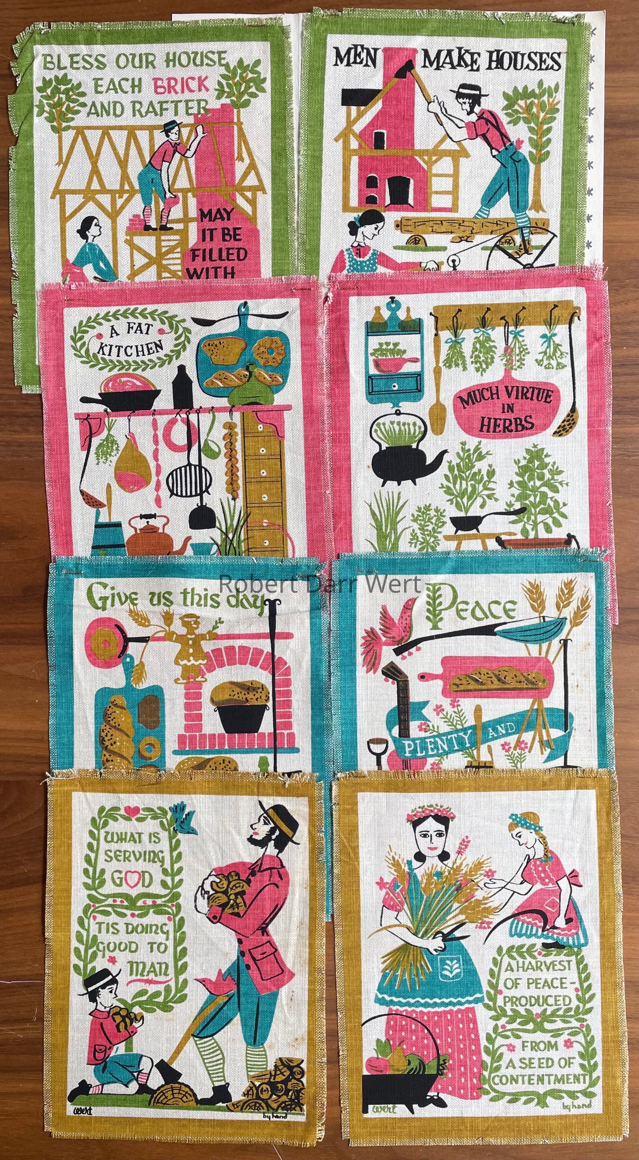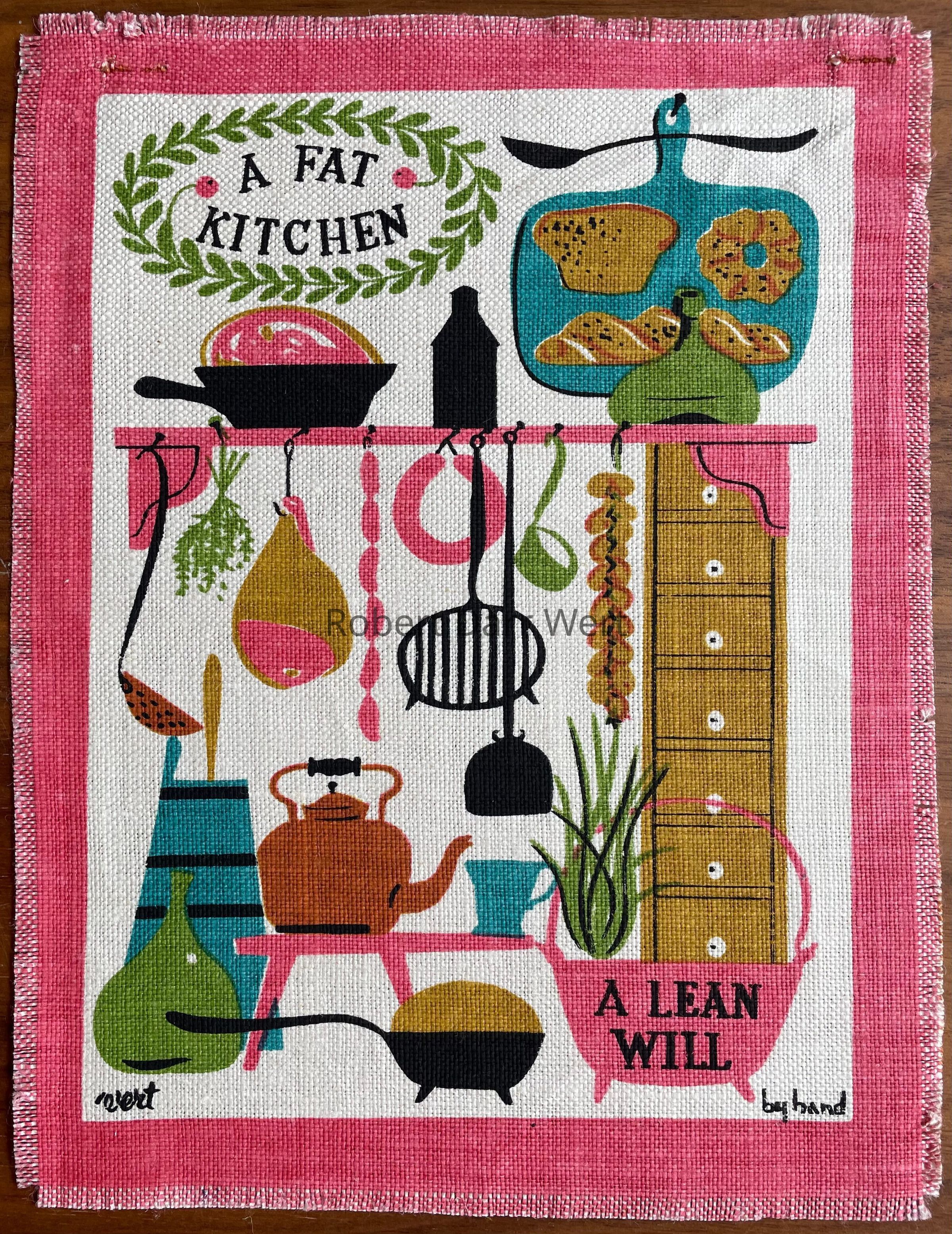A five-screen/six-color silkscreen print on off-white linen depicting foods and early American cooking implements illustrated in support of the maxim from Poor Richard’s Almanac by Benjamin Franklin, “A fat kitchen, a lean will”.