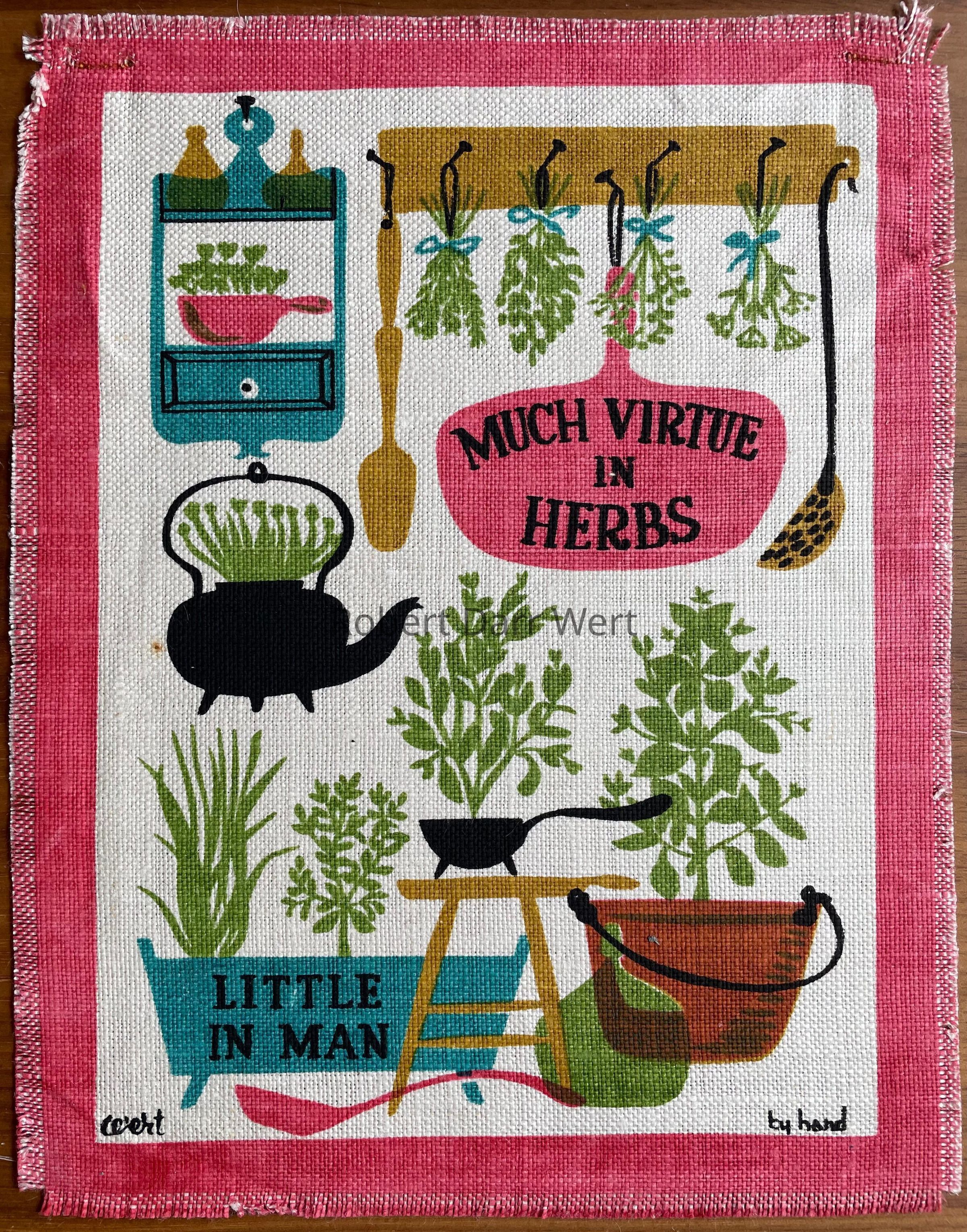 A five-screen/six-color silkscreen print on off-white linen depicting fresh and dried herbs along with tools used in an early American kitchen. This example was trimmed to fit a third party frame.