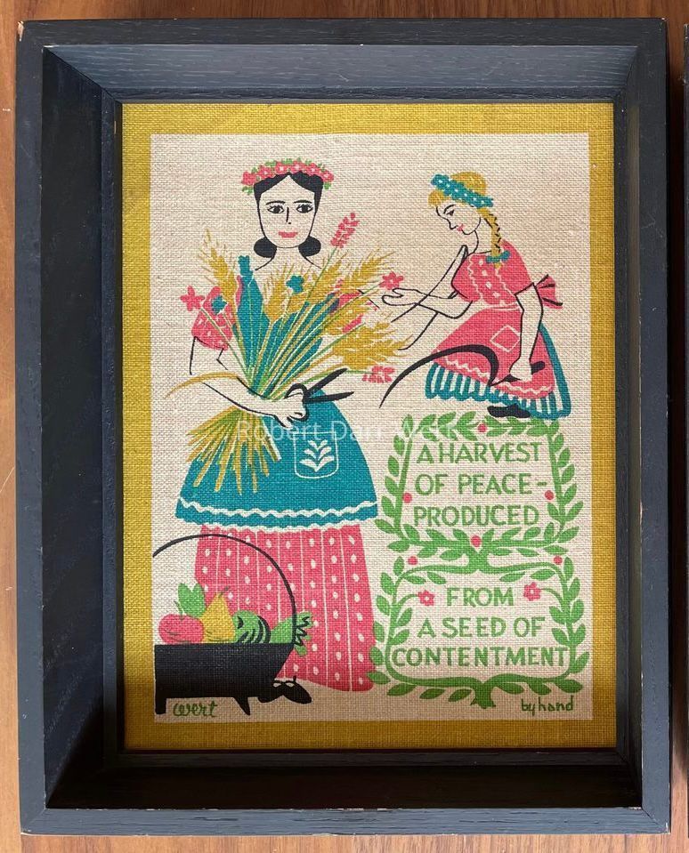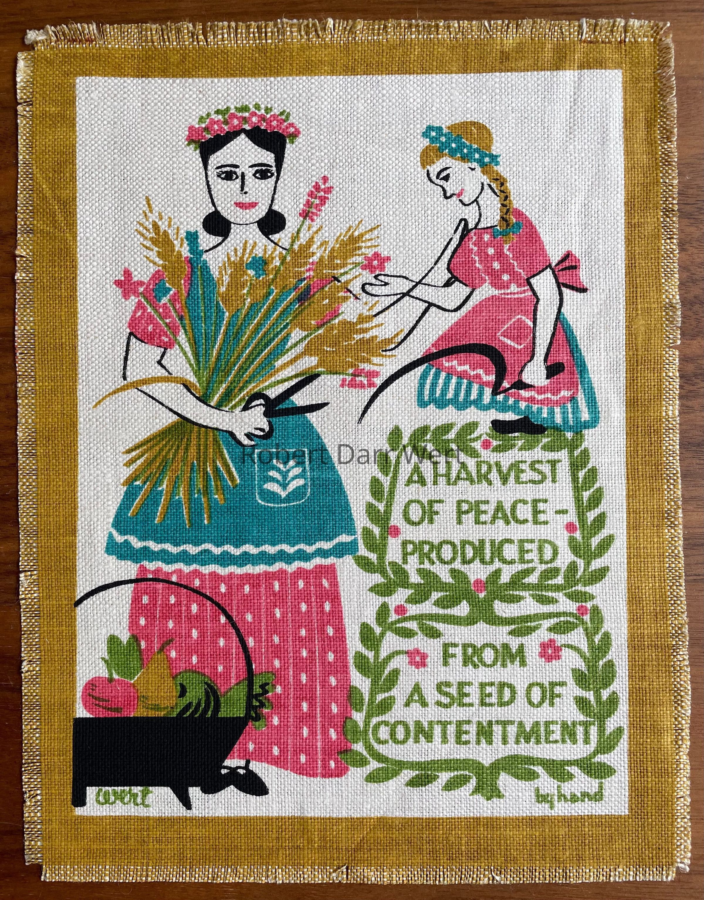 A five-color silkscreen print on off-white linen depicting a woman and young girl in long dresses gathering wheat and flowers. Picked fruit sits within a footed cast iron pot at the woman’s feet. A quote from Poor Richard’s Almanac appears within a topiary shrub, “A harvest of peace produced from a seed of contentment”. Note: this quote is also attributed as a north American or Kashmiri proverb depending on which website is sourced.