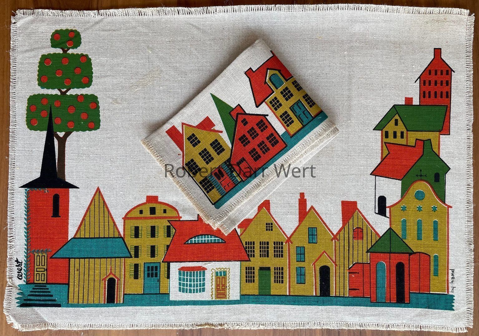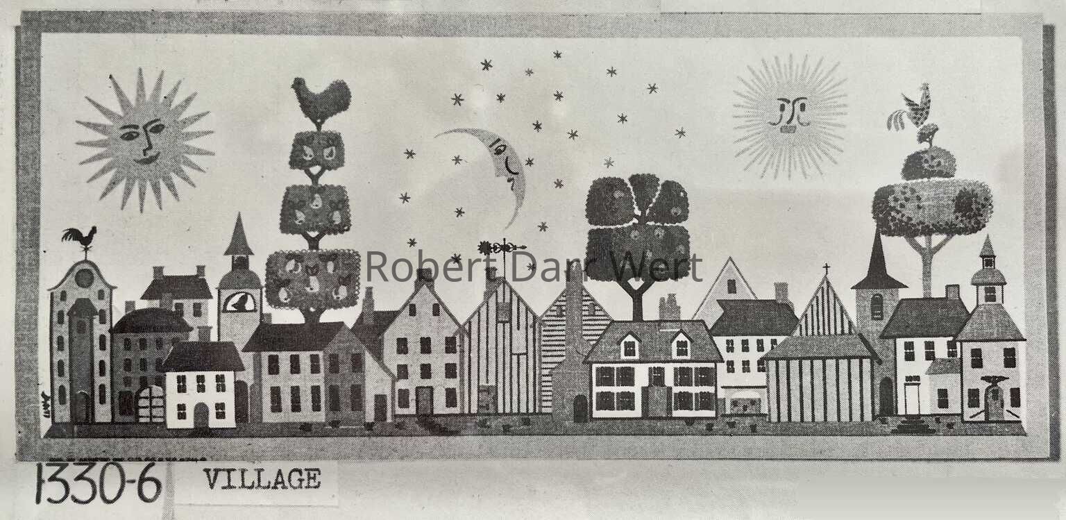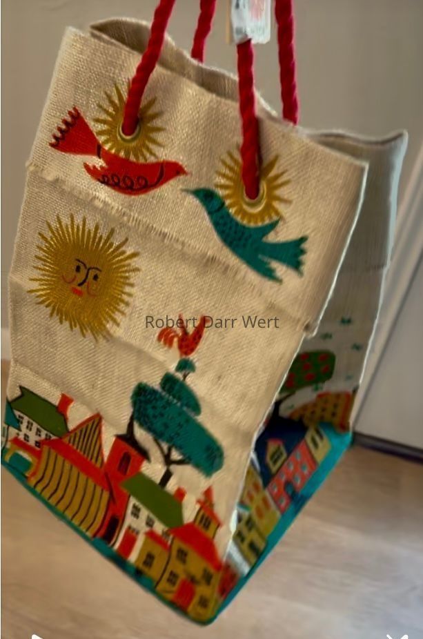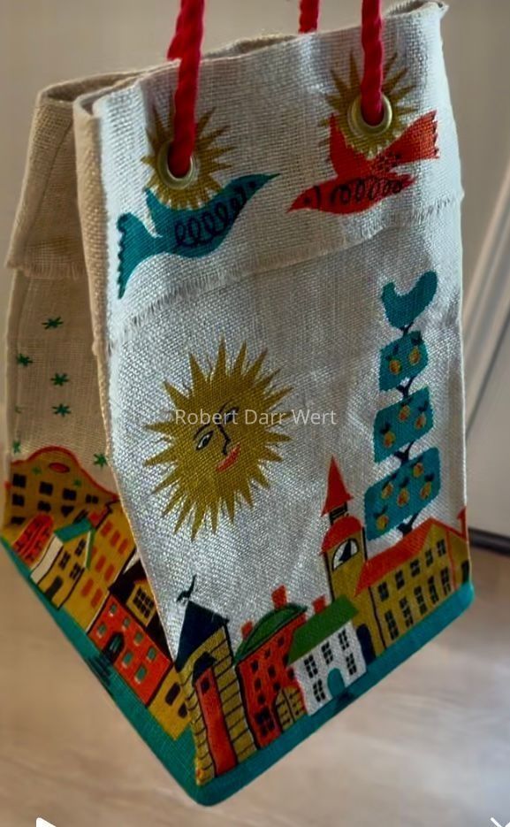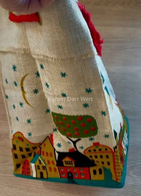 A small tote in a multi-color silkscreen print on natural linen. The tote has grommeted red rope handles, a folded top, and a wooden bottom. The print is based on Wert’s c.1957 placemats, table runners and framed prints of village and farm scenes. As confirmed in an article in the Greenfield Recorder-Gazette in 1957, the Country Pokes line of bags was introduced that year.Made/Created