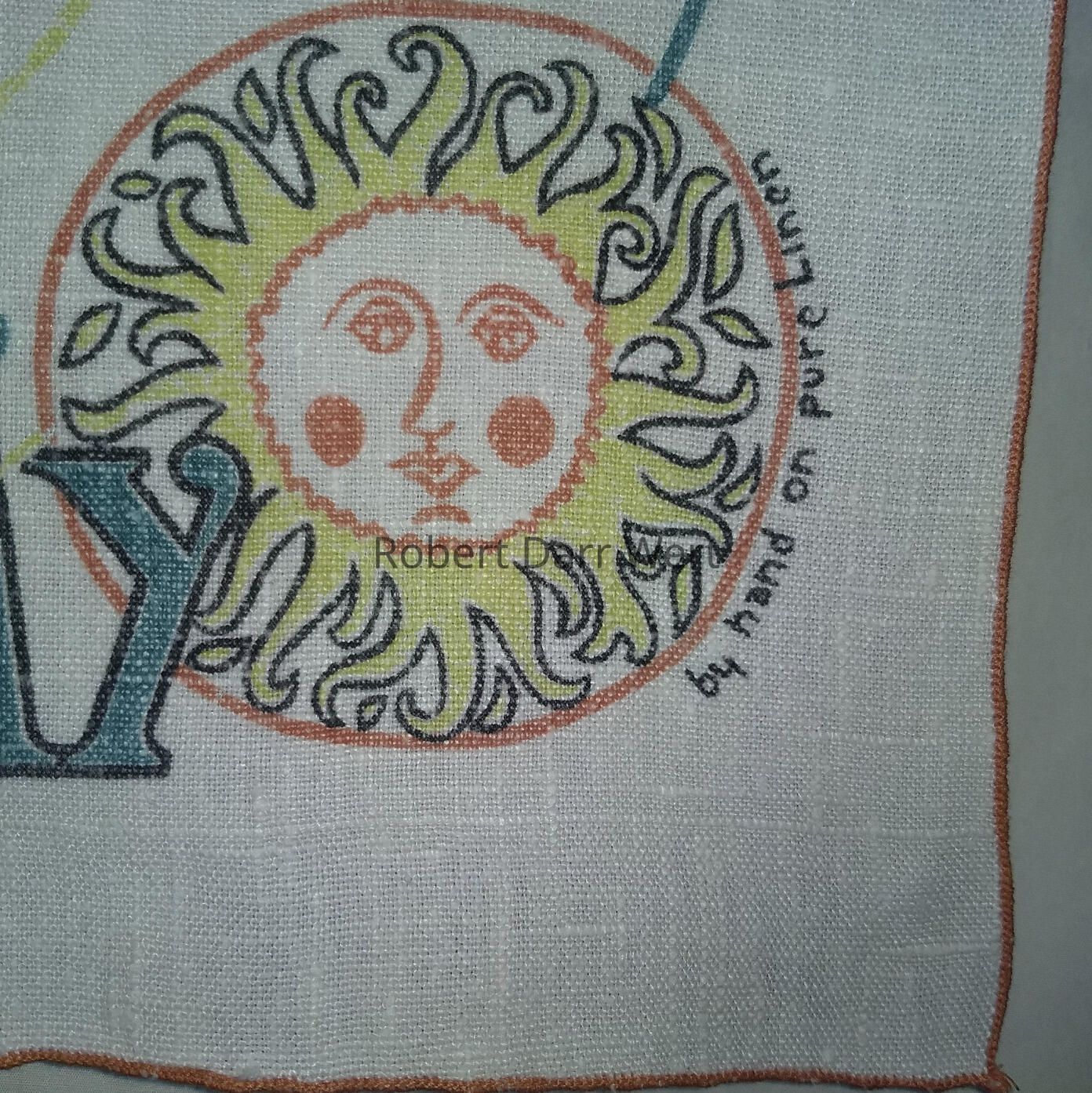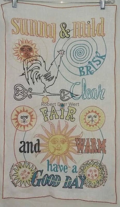 A four-color silkscreen design on bleached linen depicting five radiant suns and a rooster weathervane greeting the new day. Playful text enlivens the composition: forecasts of “Fair & Warm”, and “Sunny & Mild”, along with the expression, “Have a Good Day”.