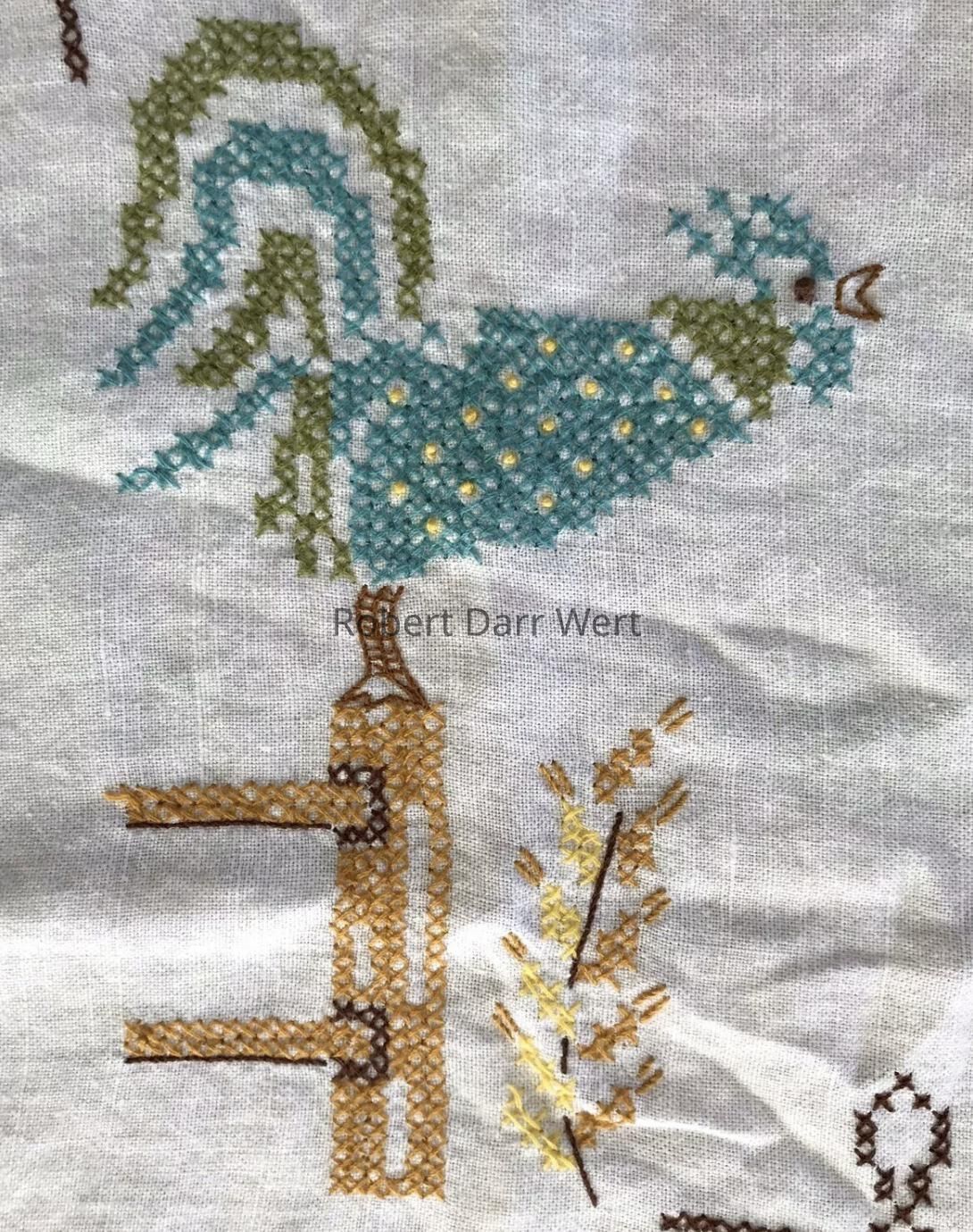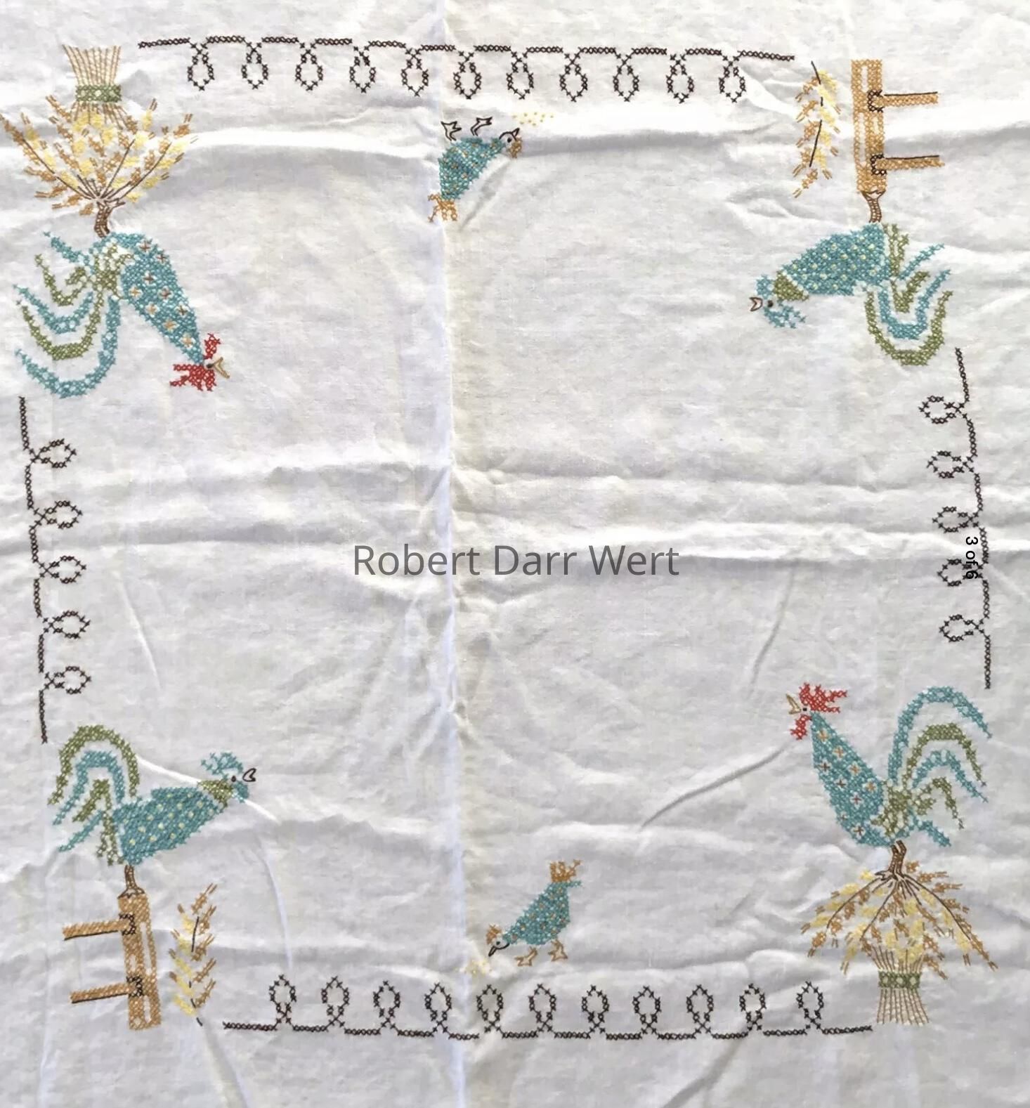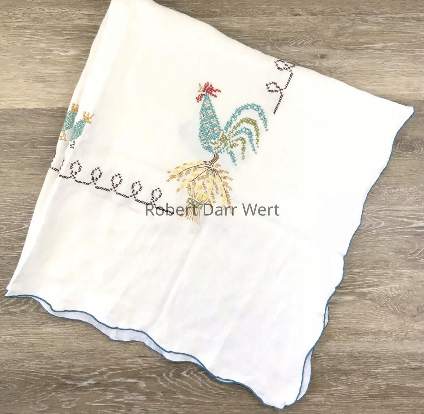 A completed tablecloth from the Bucilla cross stitch kit series, “Country Morn”, based on Country Prints’ “Good Morning U226” towel/wallhanging; see images. This kit was offered in red and turquoise colorways. This example is turquoise.Made/Created