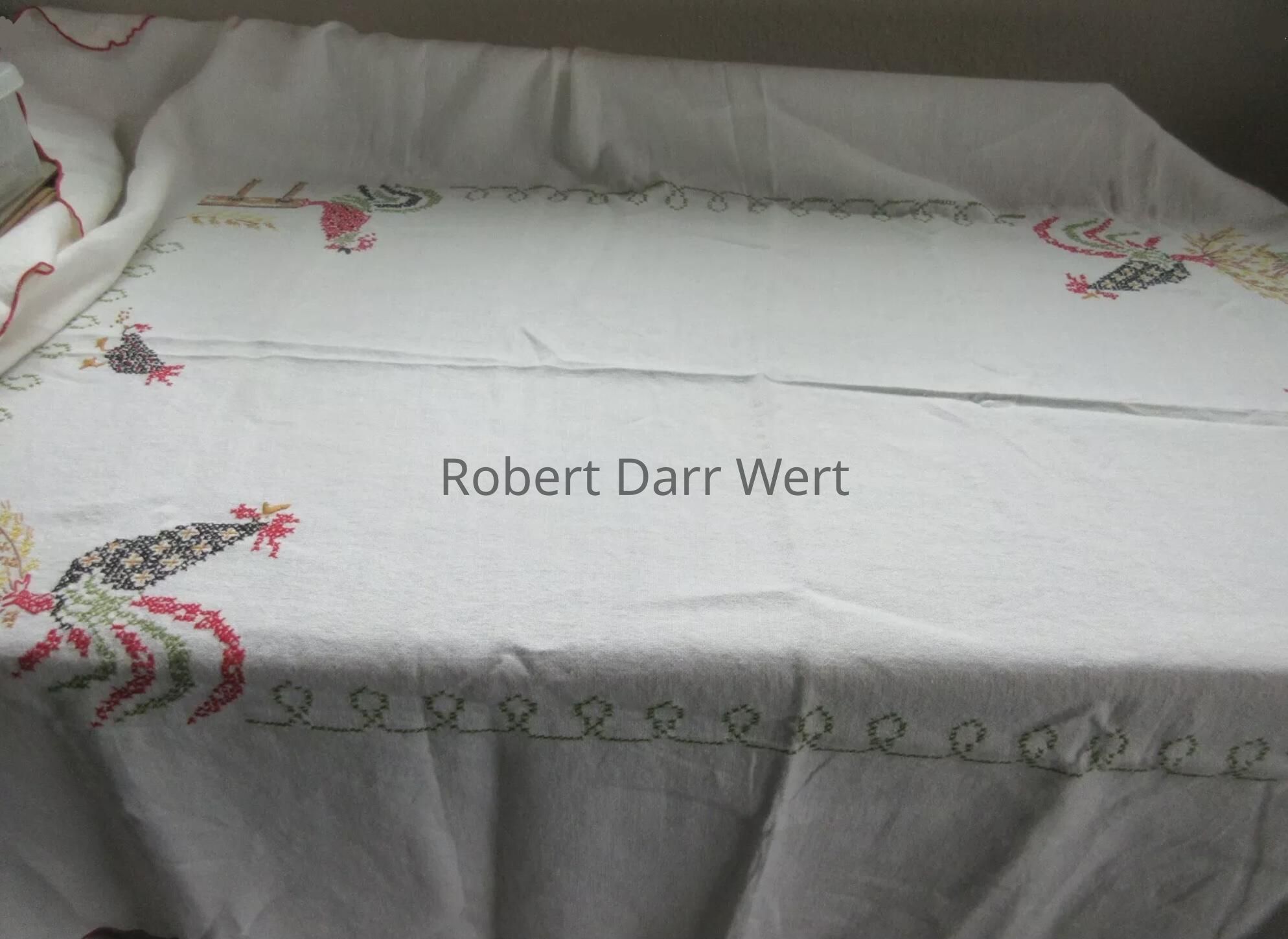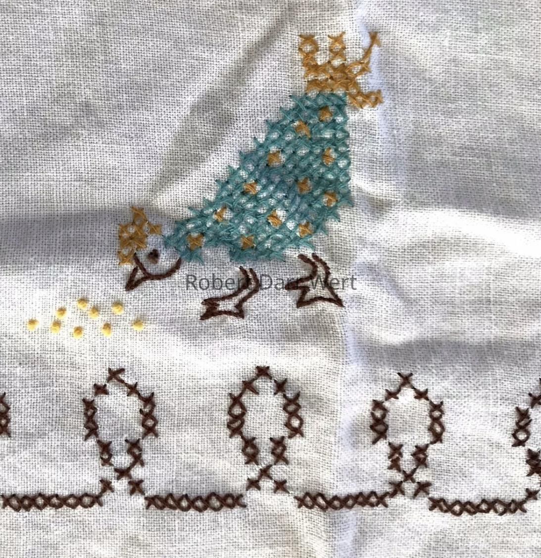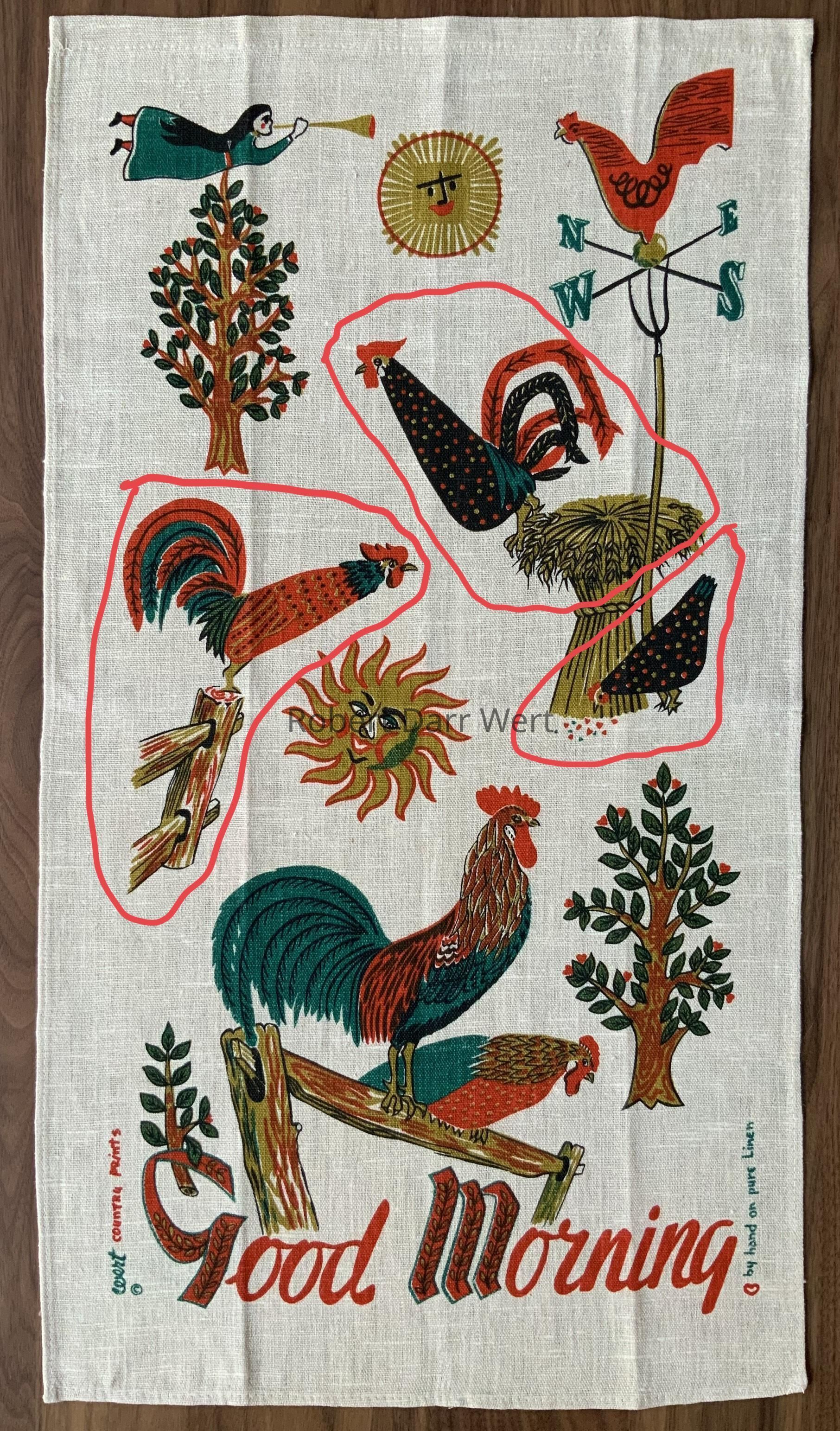 A completed tablecloth from the Bucilla cross stitch kit series, “Country Morn”, based on Country Prints’ “Good Morning U226” towel/wallhanging; see images. This kit was offered in red and turquoise colorways. This example is turquoise.Made/Created