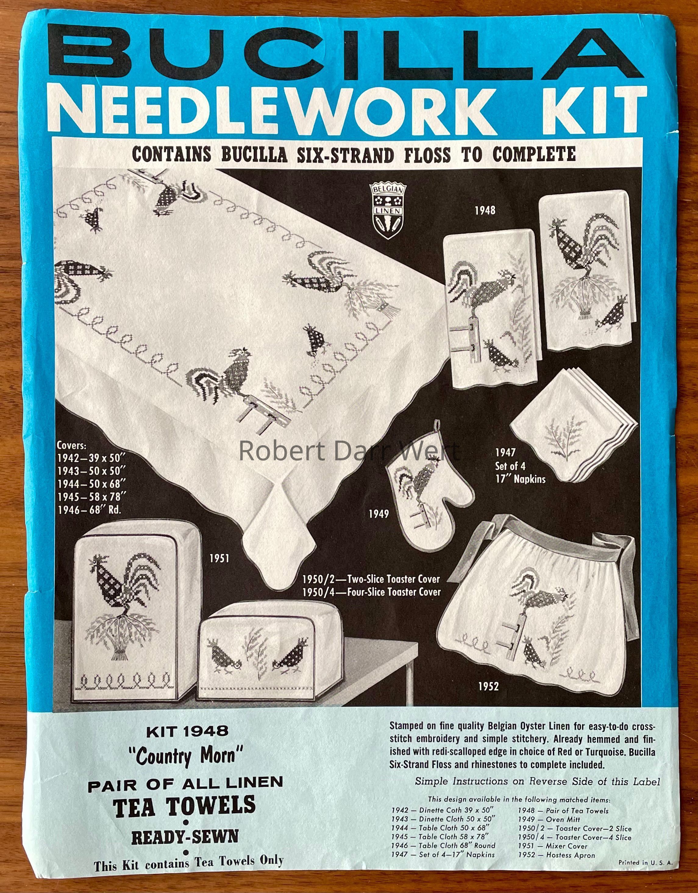 A Bucilla cross stitch kit of four napkins based on the artwork of Robert Darr Wert. This kit was offered in red and turquoise colorways.Made/Created