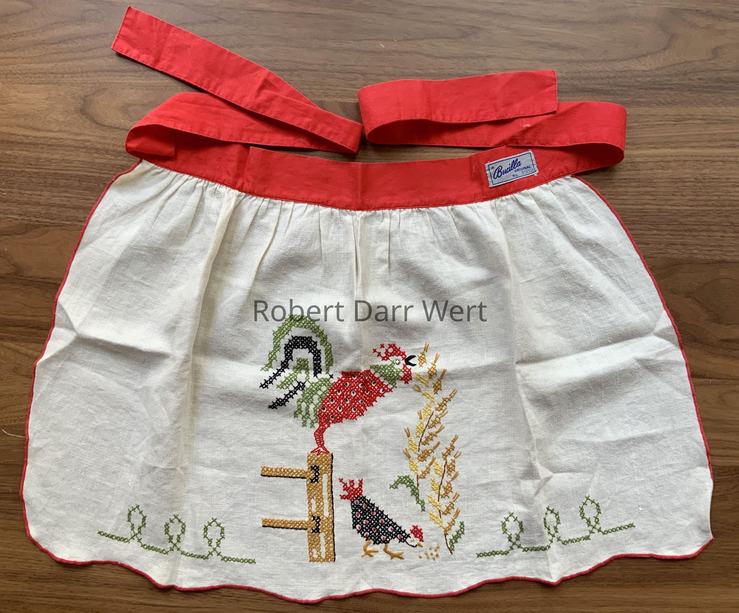 A completed apron from the Bucilla cross stitch kit series, “Country Morn”, based on a Country Prints towel/wallhanging. This is one in a suite of eight kits offered in both turquoise and red colorways. This example is in red.