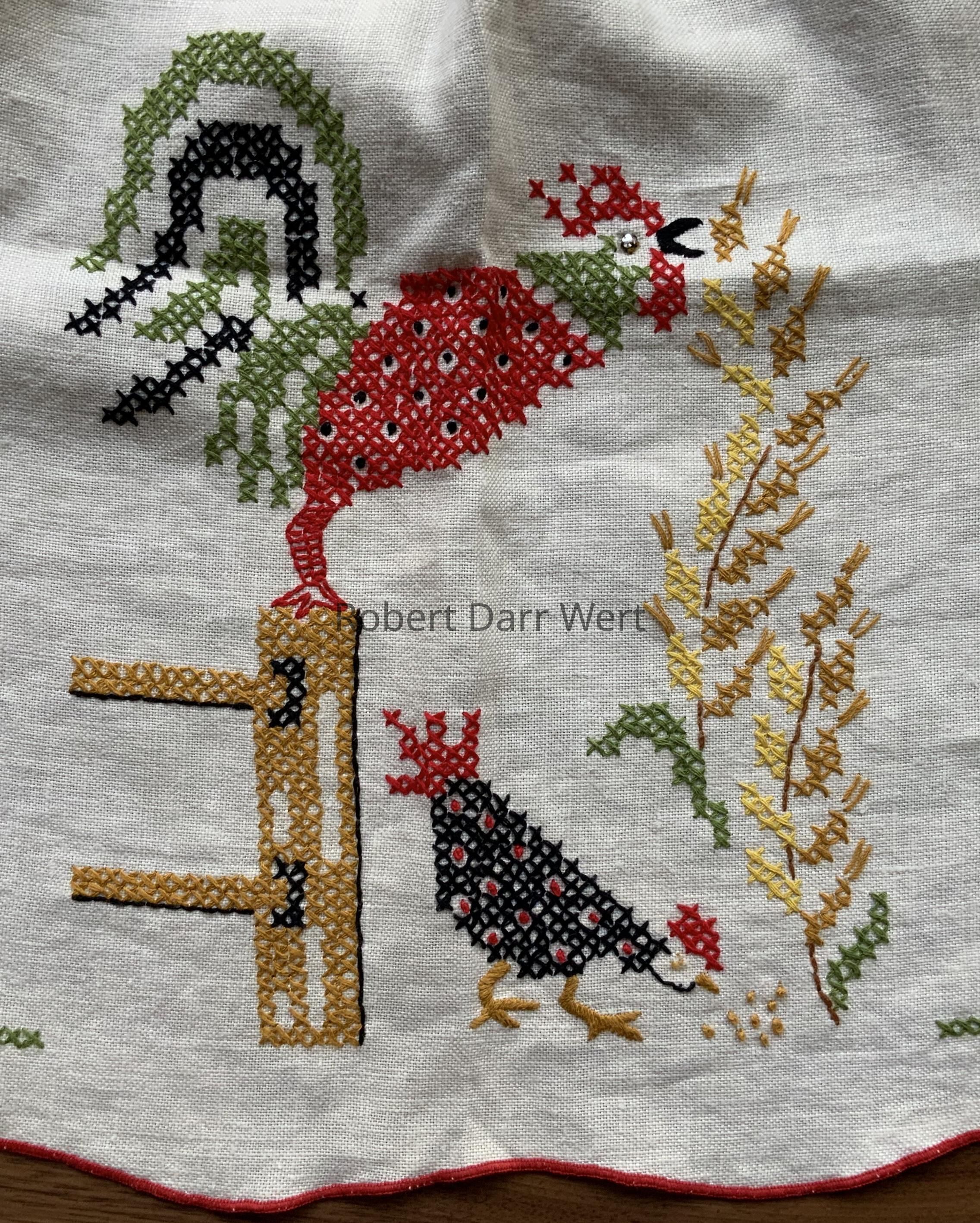 The rooster and hen are taken from Wert’s “Good Morning U226” wall hanging; see images. The scrolled lines are a design element Wert often used to fill space or unify a composition.