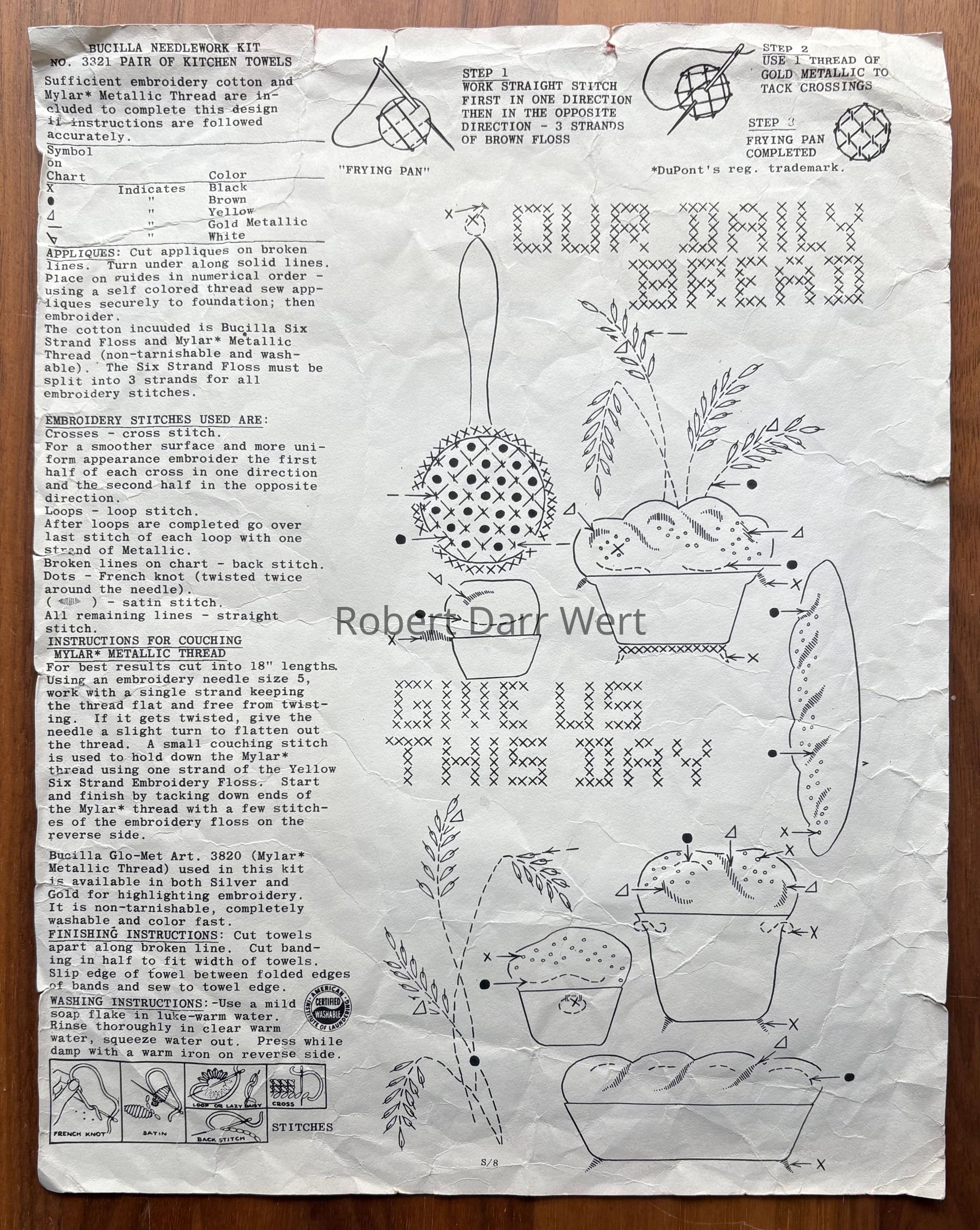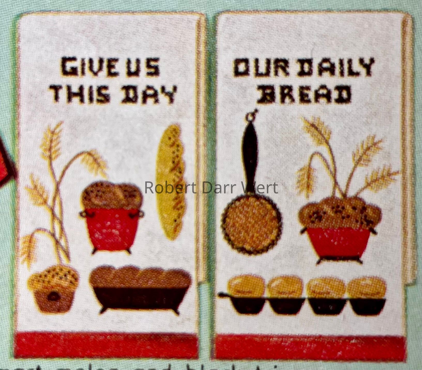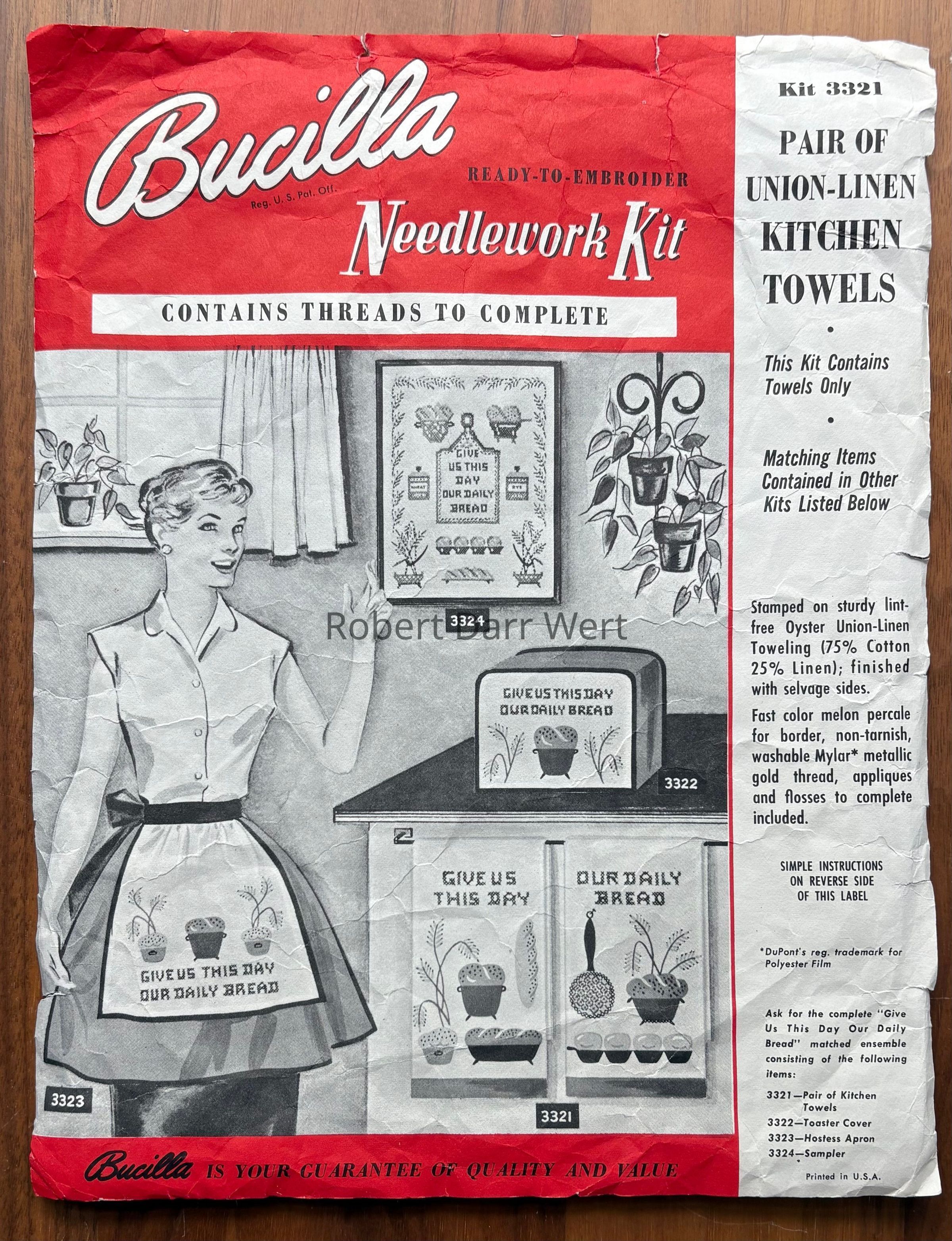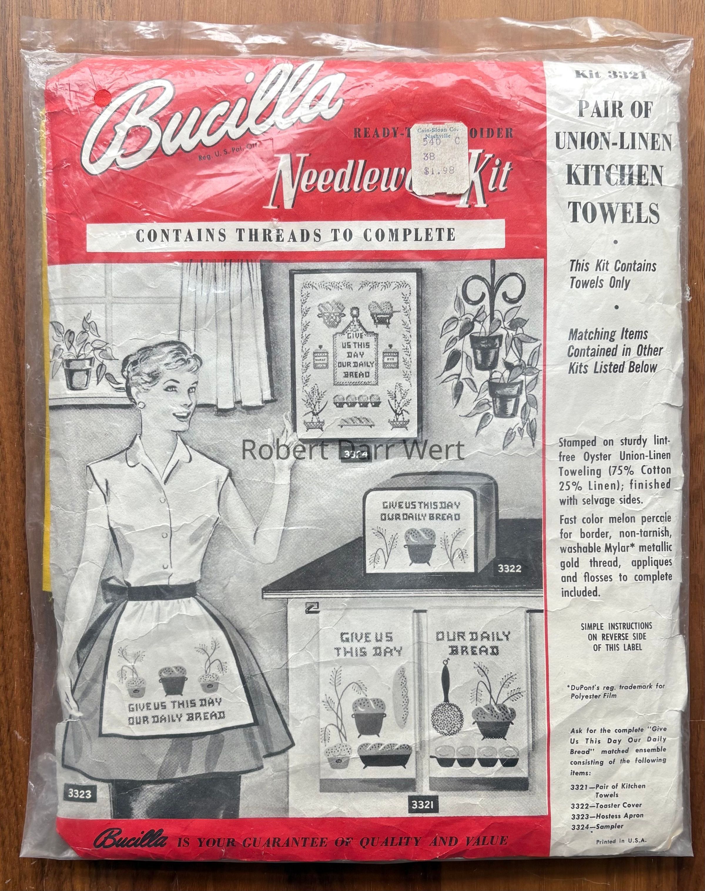 A Bucilla cross stitch and appliqué kit for a pair of kitchen towels featuring imagery from Country Prints’ “Daily Bread” silkscreen prints. This is one of a suite of cross stitch kits based on this theme.