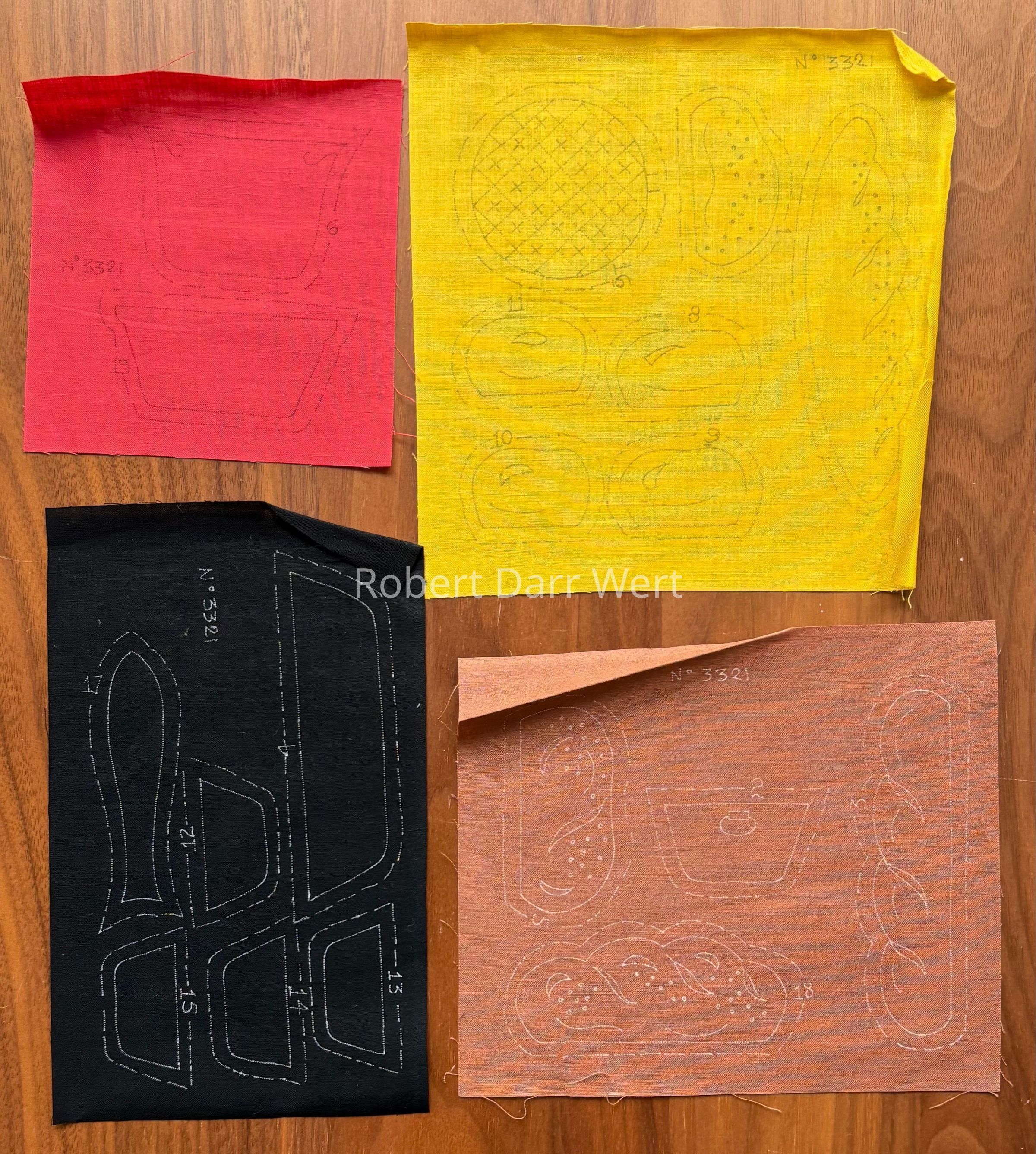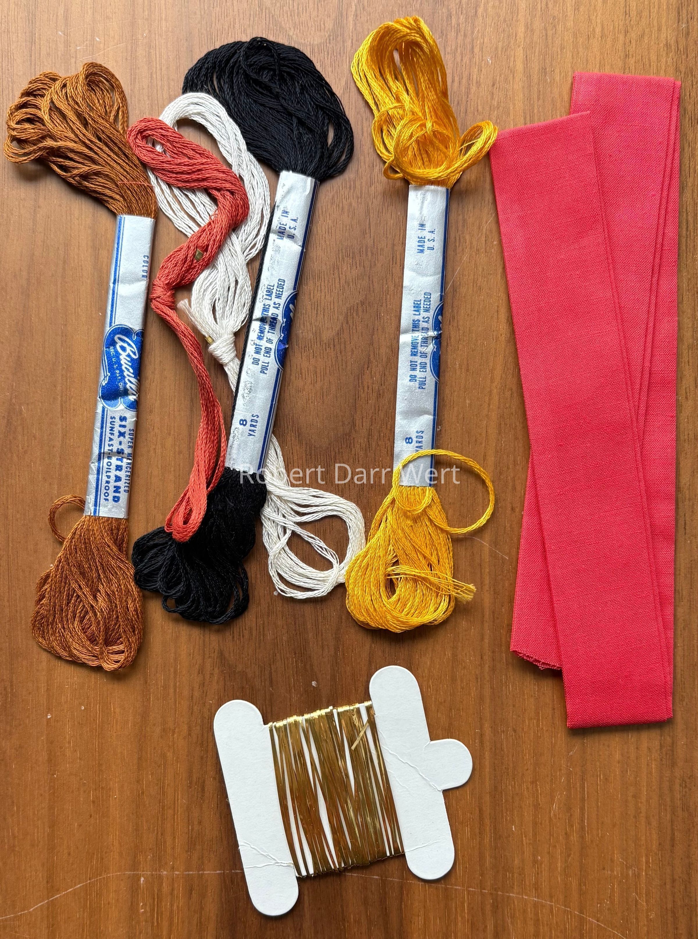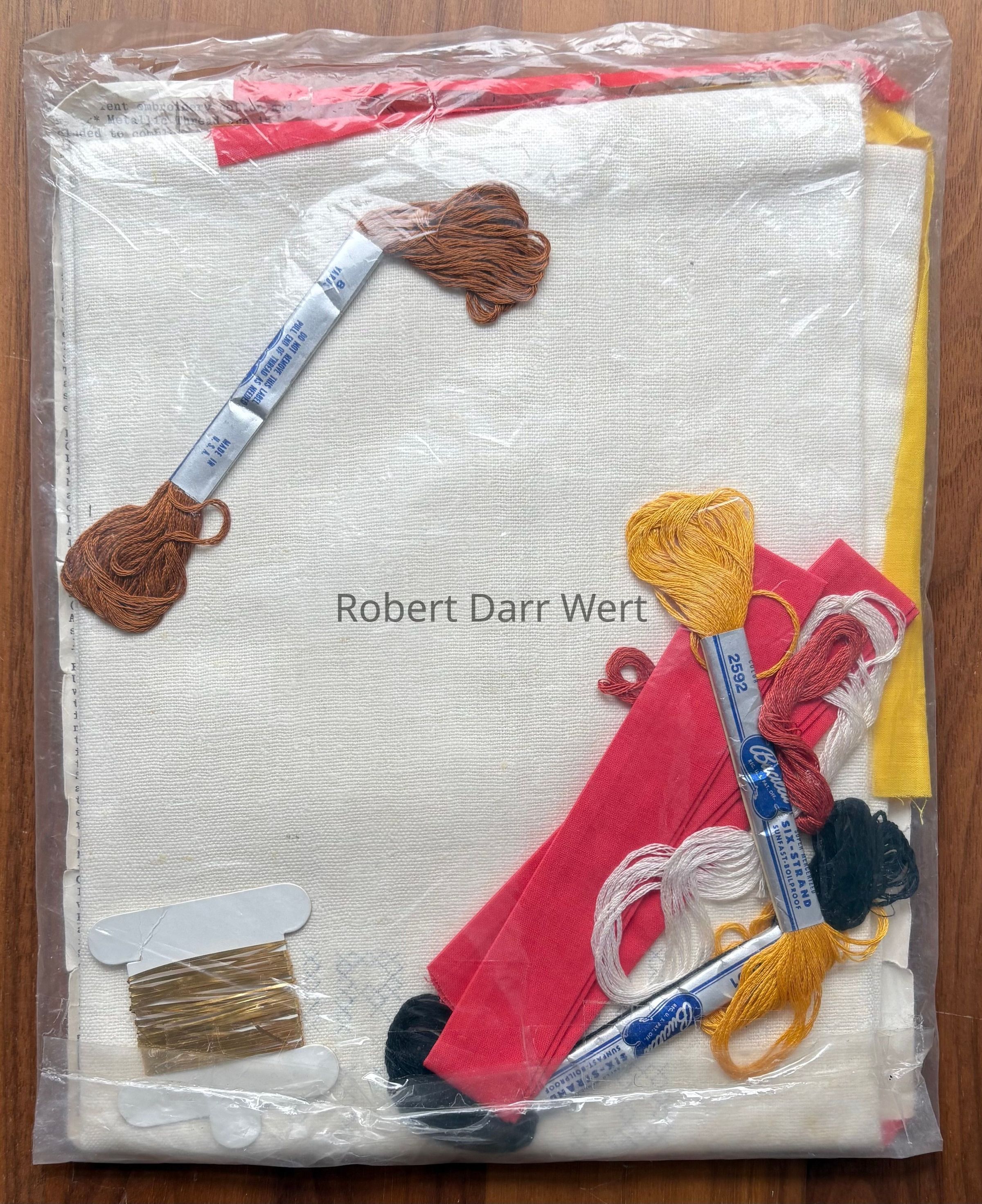 The kit includes linen, applique fabric in four colors, embroidery floss, and instructions for completing the project.Made/Created