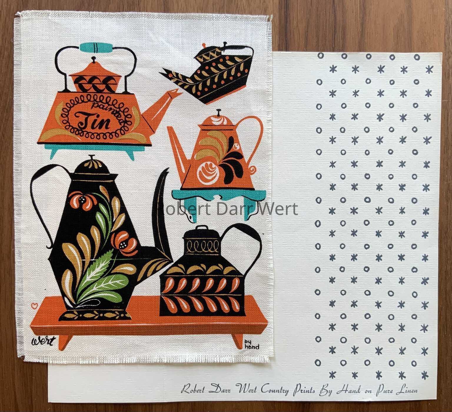 This kit appears in the c.1955 brochure “I-Did-It-Myself Aprons by Robert Darr Wert/Country Prints”. A matching Gift Greeting, framed print and tile were also produced; see images.