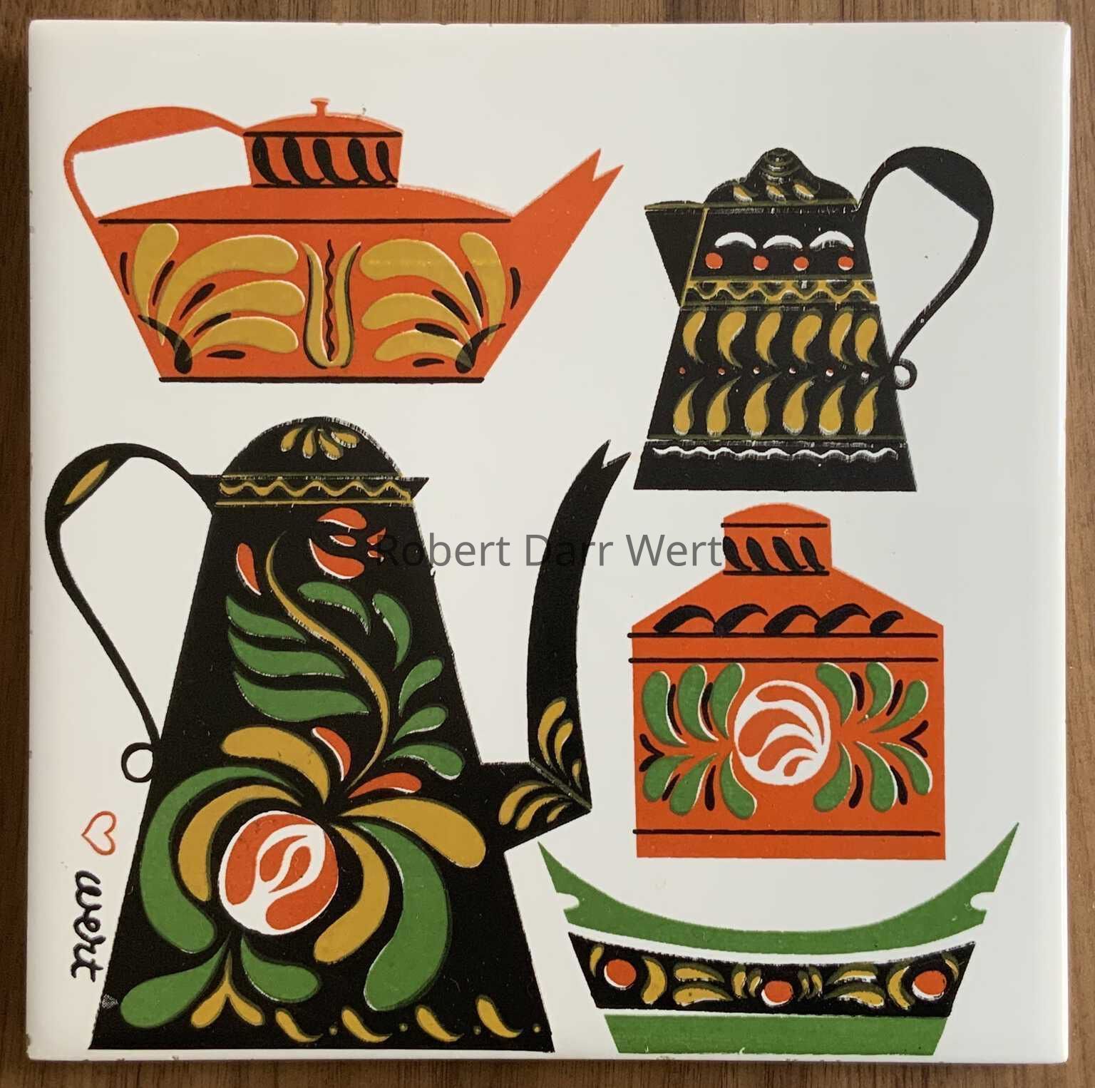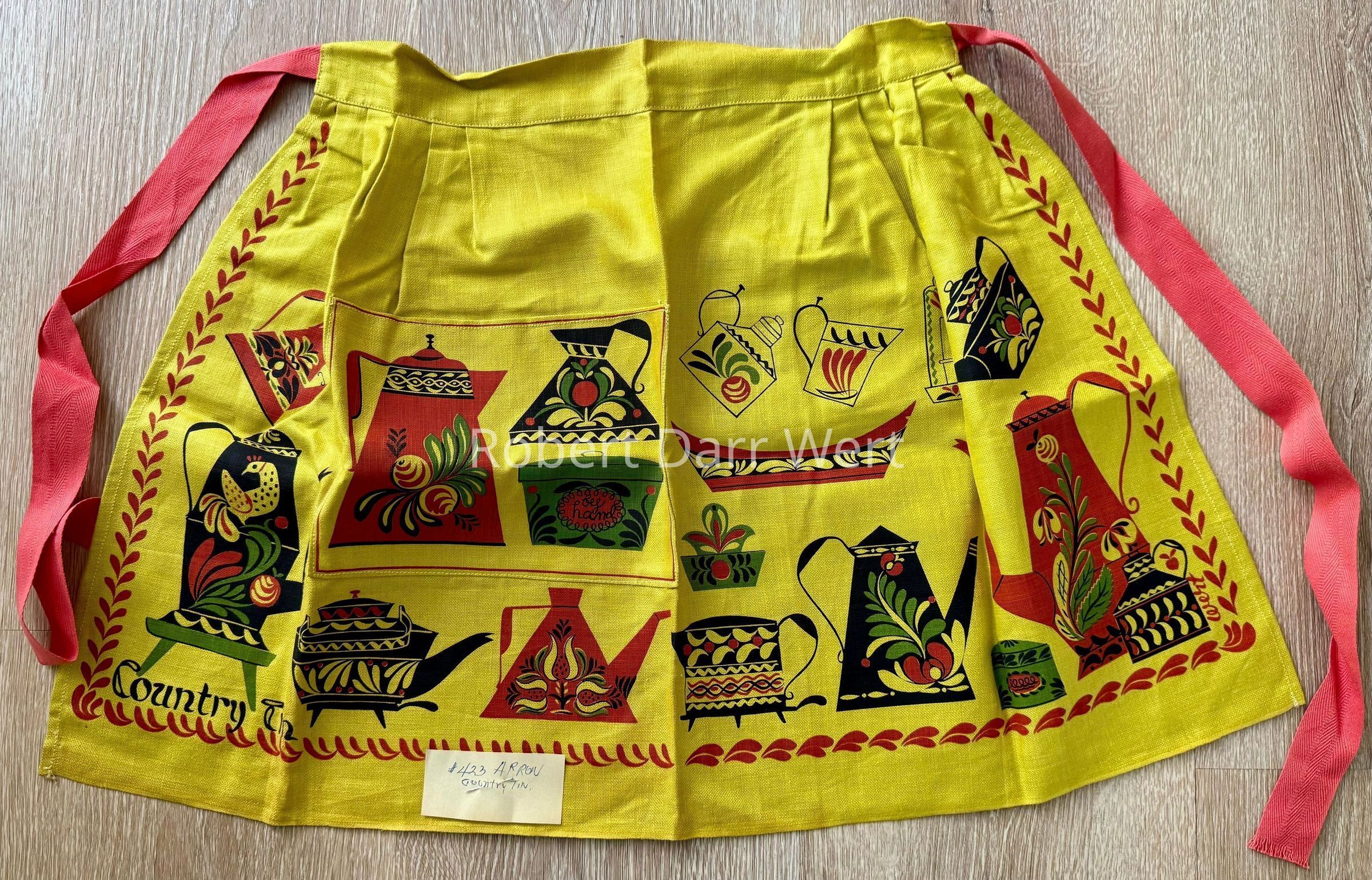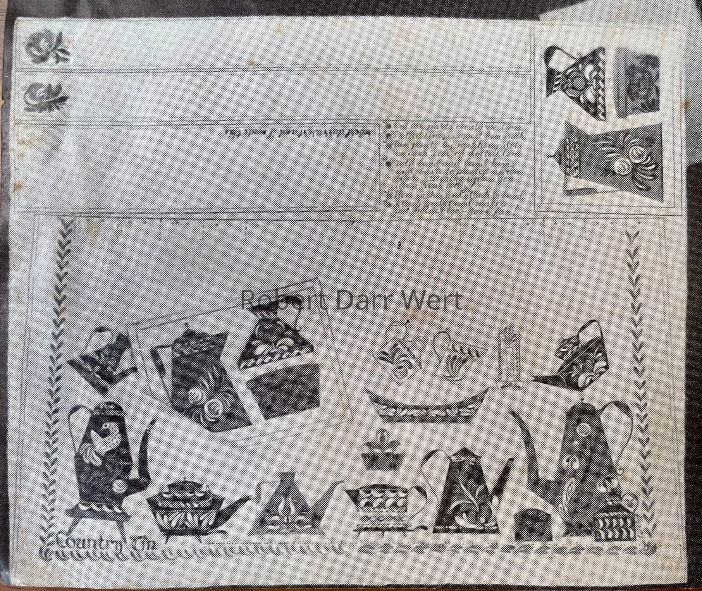 A do-it-yourself apron kit with a three-color silkscreen print. The kit is printed in red, black and green on one sheet of yellow linen (it may also have been offered on white linen). More than twenty examples of painted tin, or toleware, are illustrated. Instructions are printed amongst the kit parts. The kit included two additional pieces of unprinted linen intended for the apron ties and potholder back.