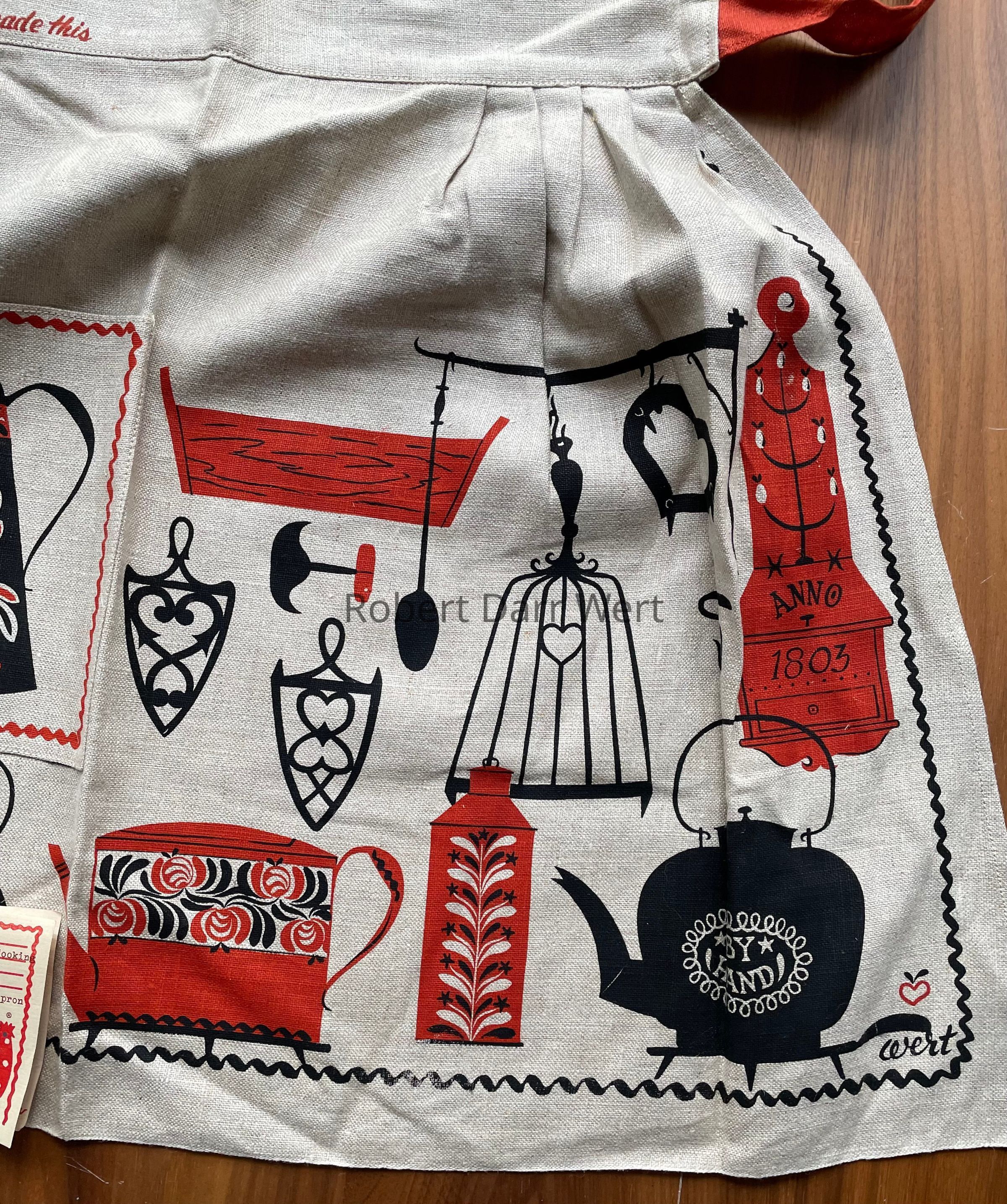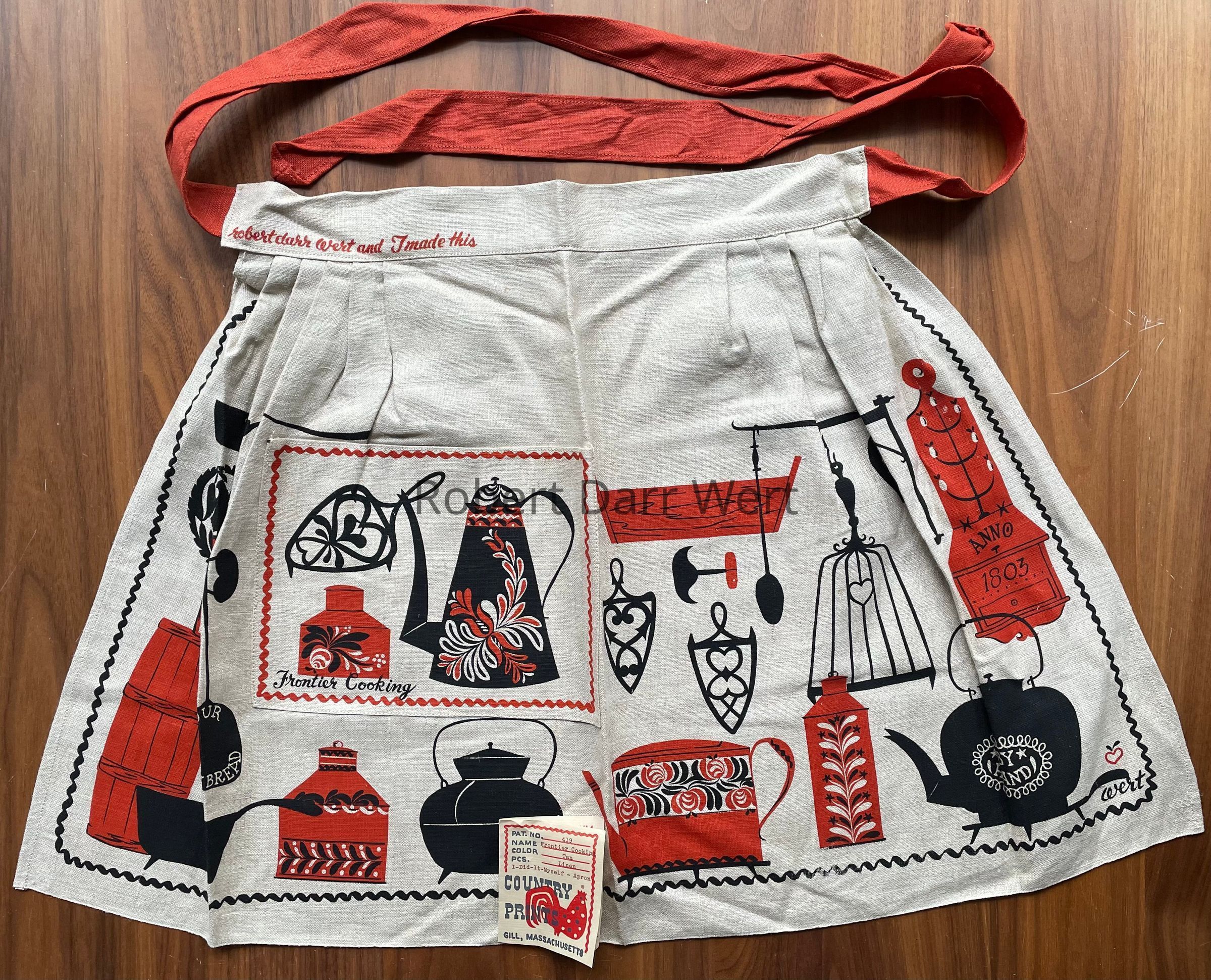 This apron is described in a c.1955 Country Prints price list, “Wrought Iron motifs in Black on natural with Brick Red Accents and sash.”Made/Created