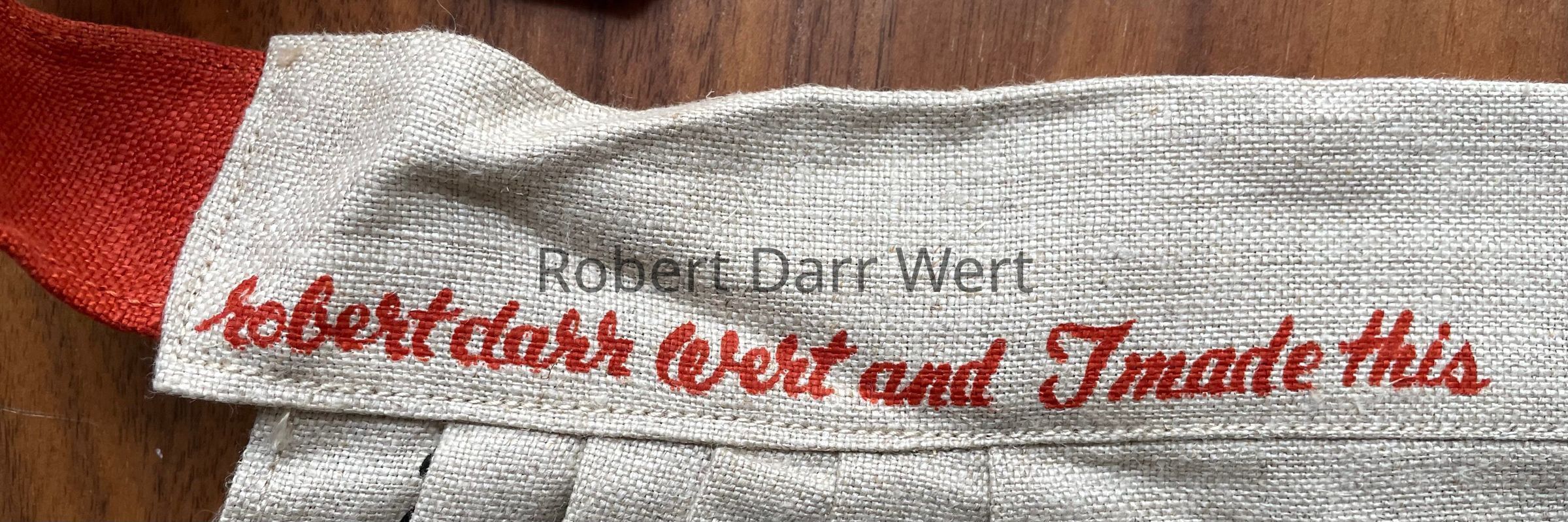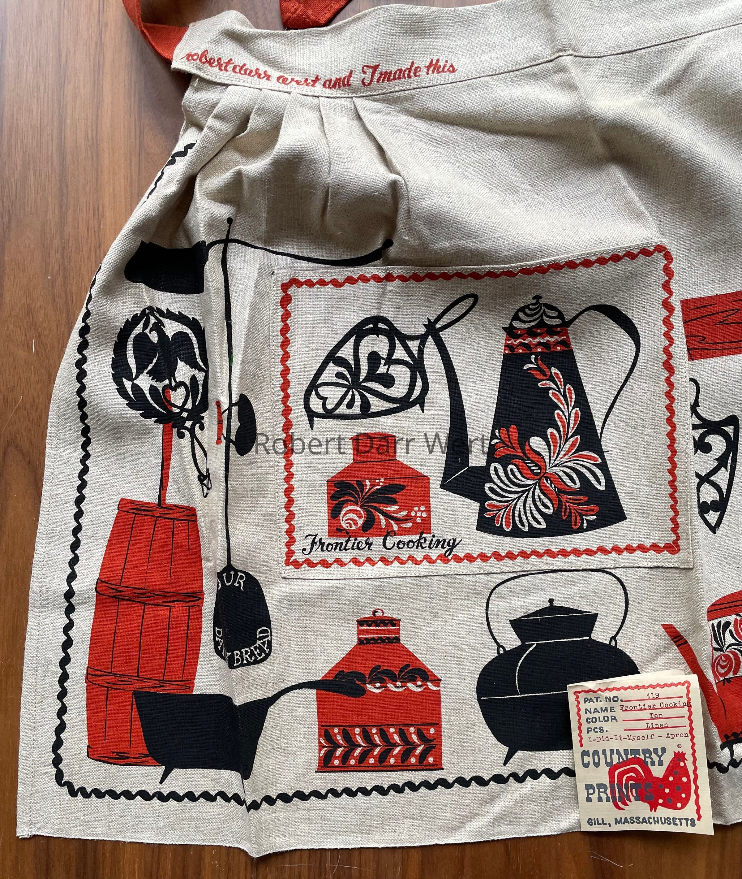 “Frontier Cooking”, on patch pocket, and “wert” with apple heart, lower right corner.Dimensions