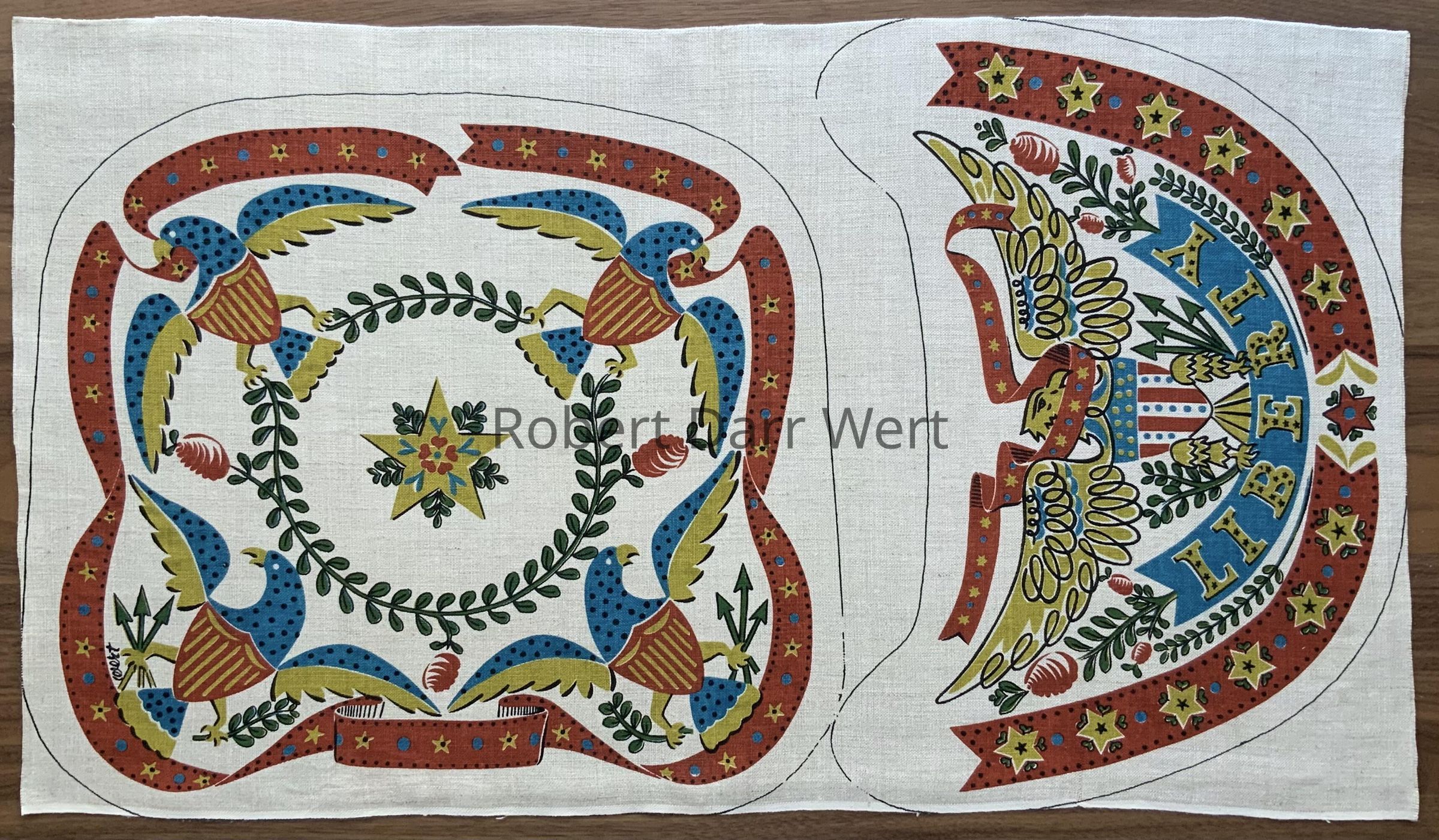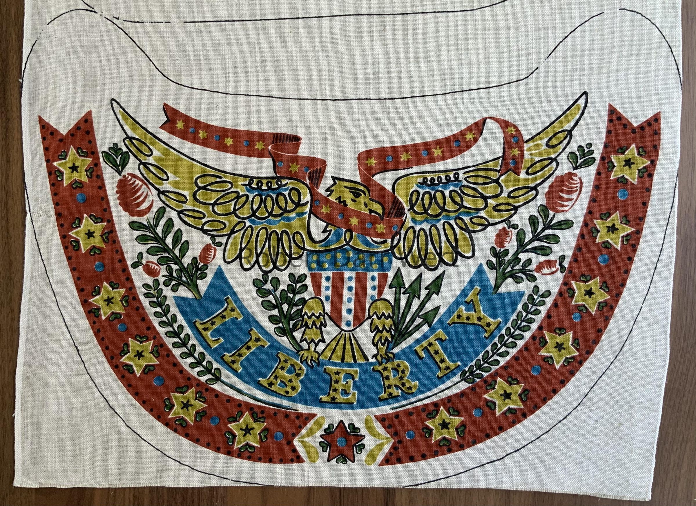 A partial cut-and-sew chair cushion kit with a four-color silkscreen print on natural linen depicting symbols of the American Republic. Kit is missing backing fabric and instructions.