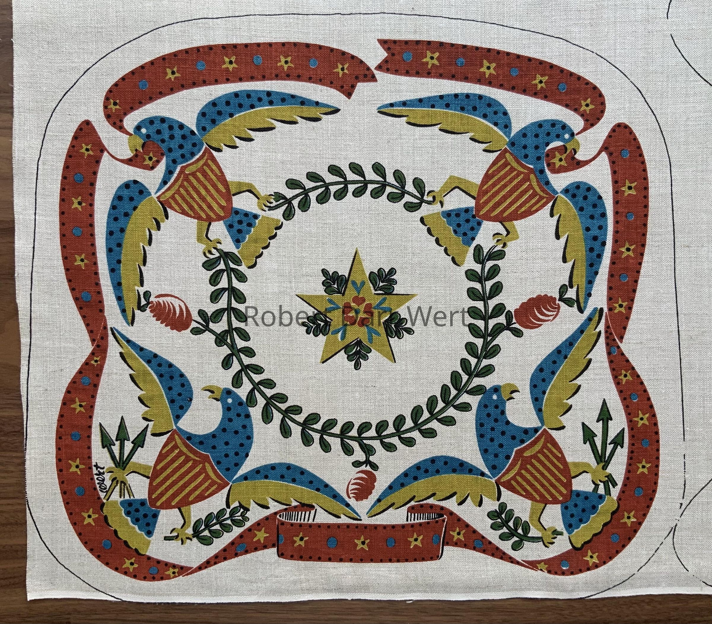 Seat cushion: four eagles inspired by appliqué quilt patterns are bordered by a furling red banner decked with blue dots and stars. At center is a five pointed star encircled by a trailing vine held in two eagles’ talons. The vine bears fruit drawn in the manner of painted tinware.