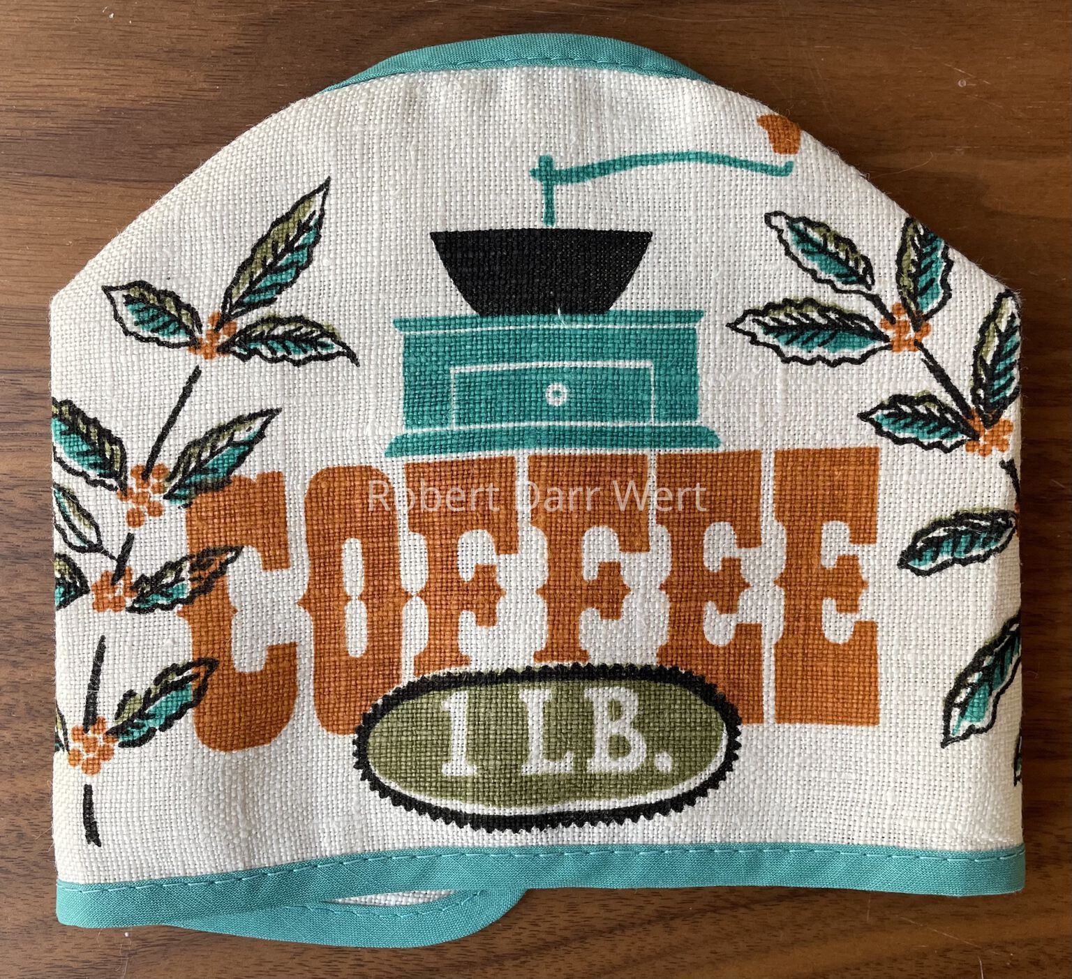 This bottle cover is from Wert’s Motif Gourmet collection, a line of decidedly design-forward printed kitchen goods that veer away from his usual Americana themes. Bottle cover was offered in orange and turquoise colorways. This example is in turquoise.
