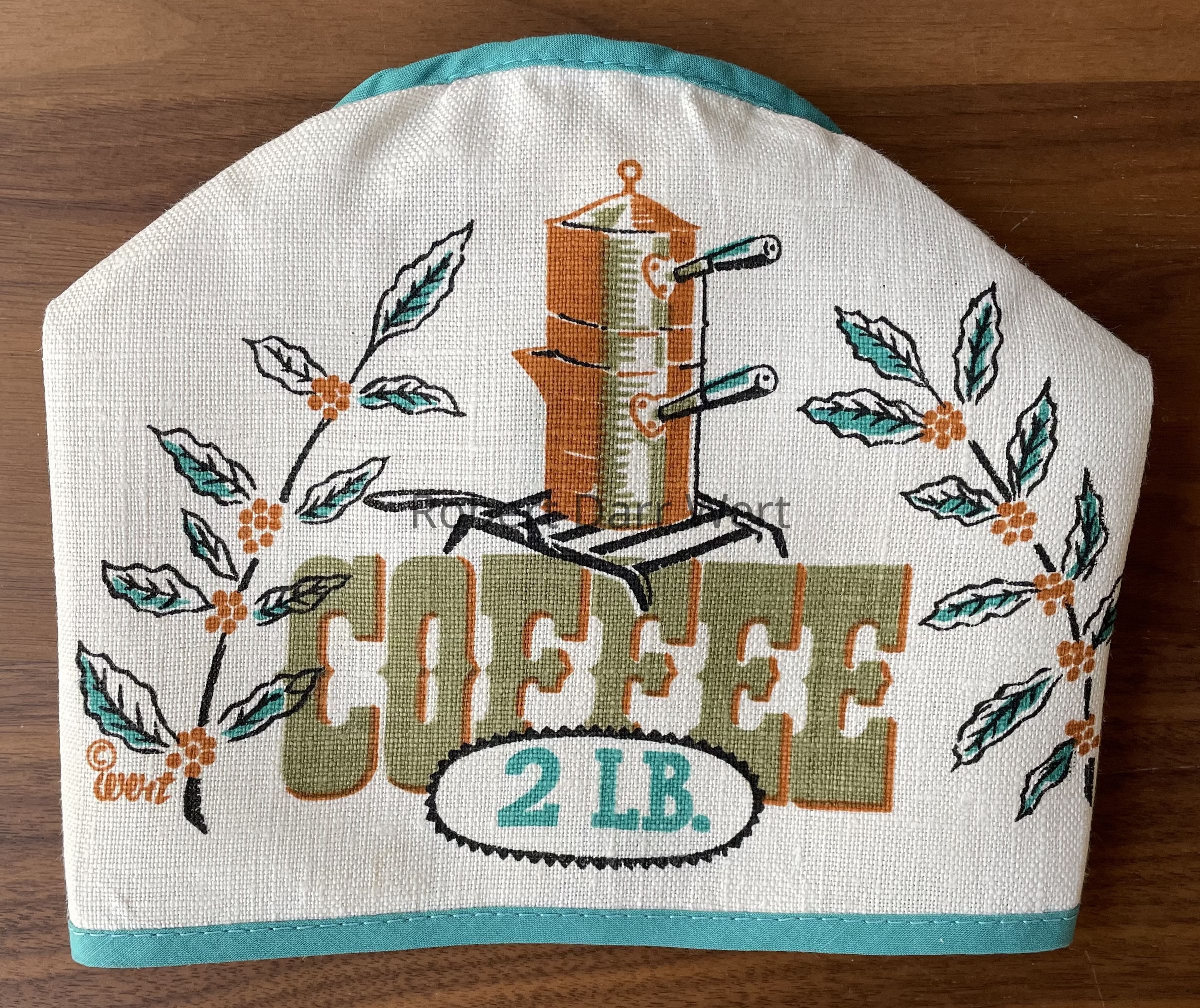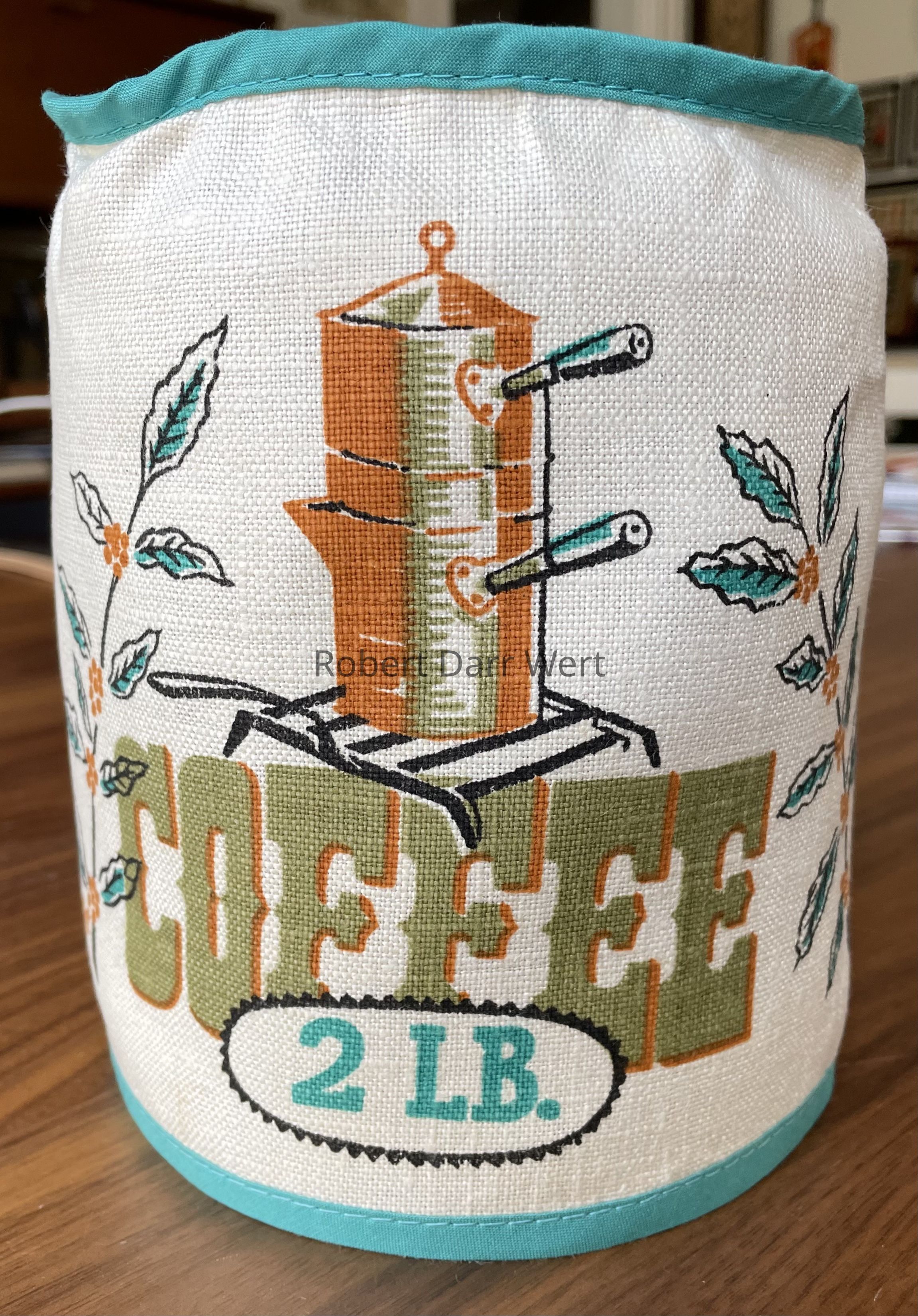 A coffee can cover with a four-color silkscreen print on off-white linen depicting an antique pour-over coffee maker on a gridiron atop the word “coffee”, flanked by berry laden branches of a coffee plant.