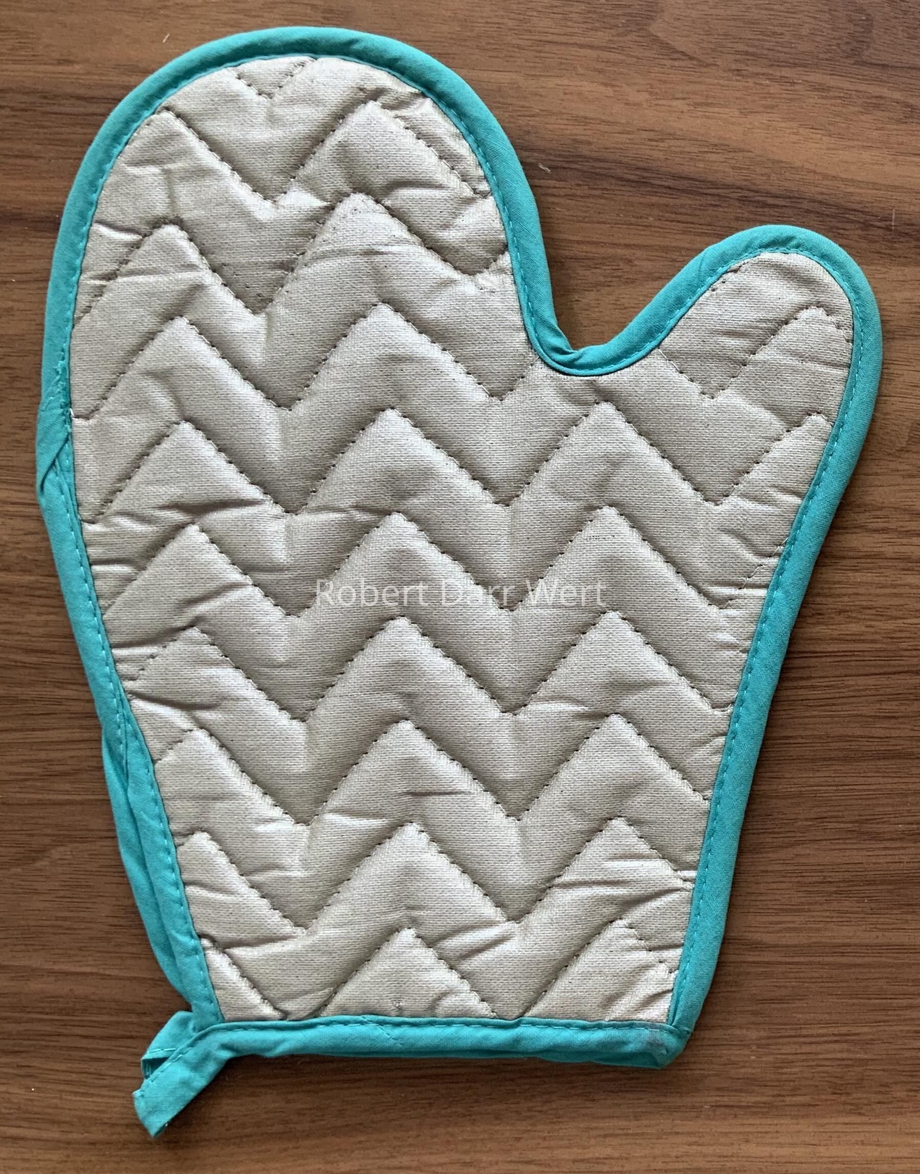 Edges are finished with turquoise bias tape which is sewn to form a hanging loop at lower right. The palm of the mitt is insulated and impregnated with an oven-proof silver coating.Made/Created