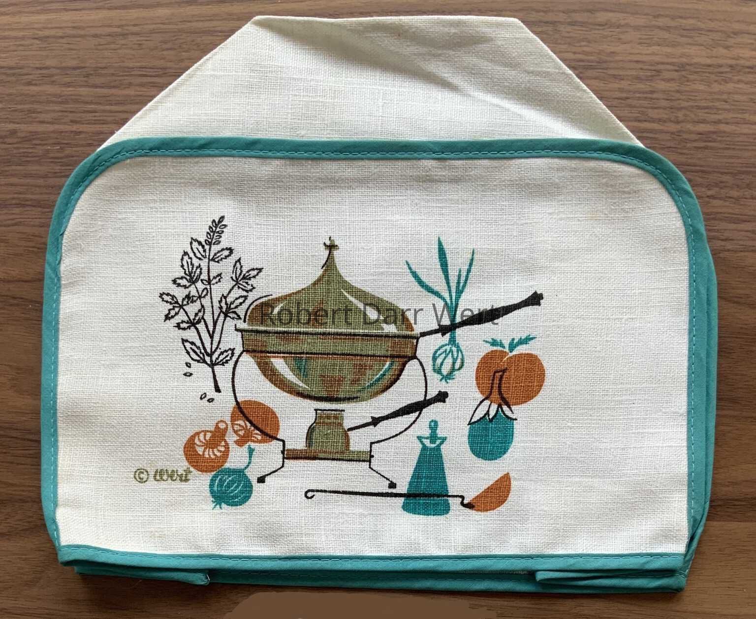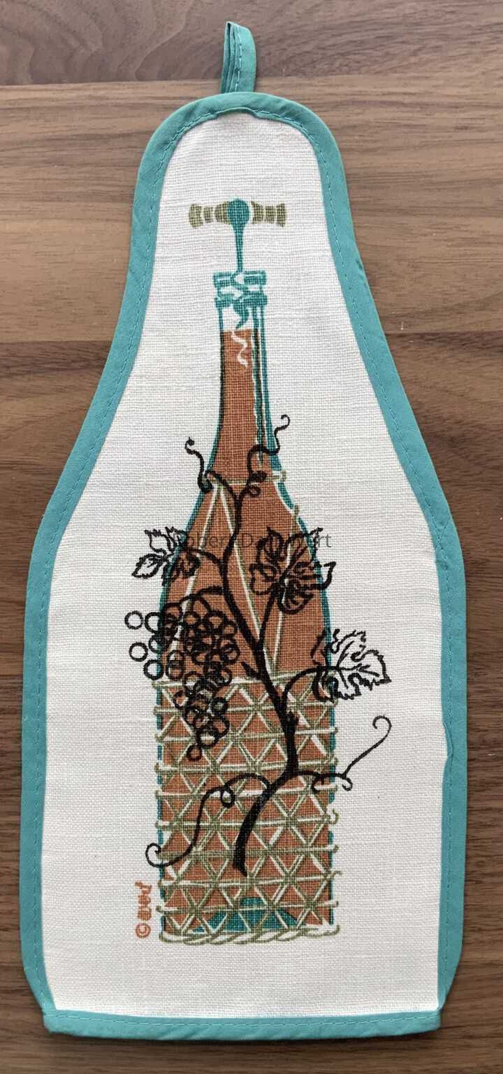 This oven mitt is part of Country Prints’ Motif Gourmet collection, a line of decidedly design-forward kitchen accessories that veer away from Wert’s typical Americana themes. The oven mitt was offered in turquoise and orange colorways. This example is in turquoise.