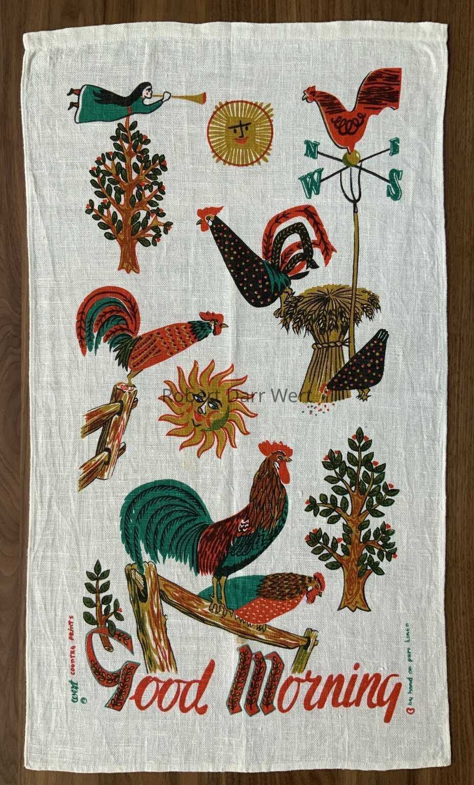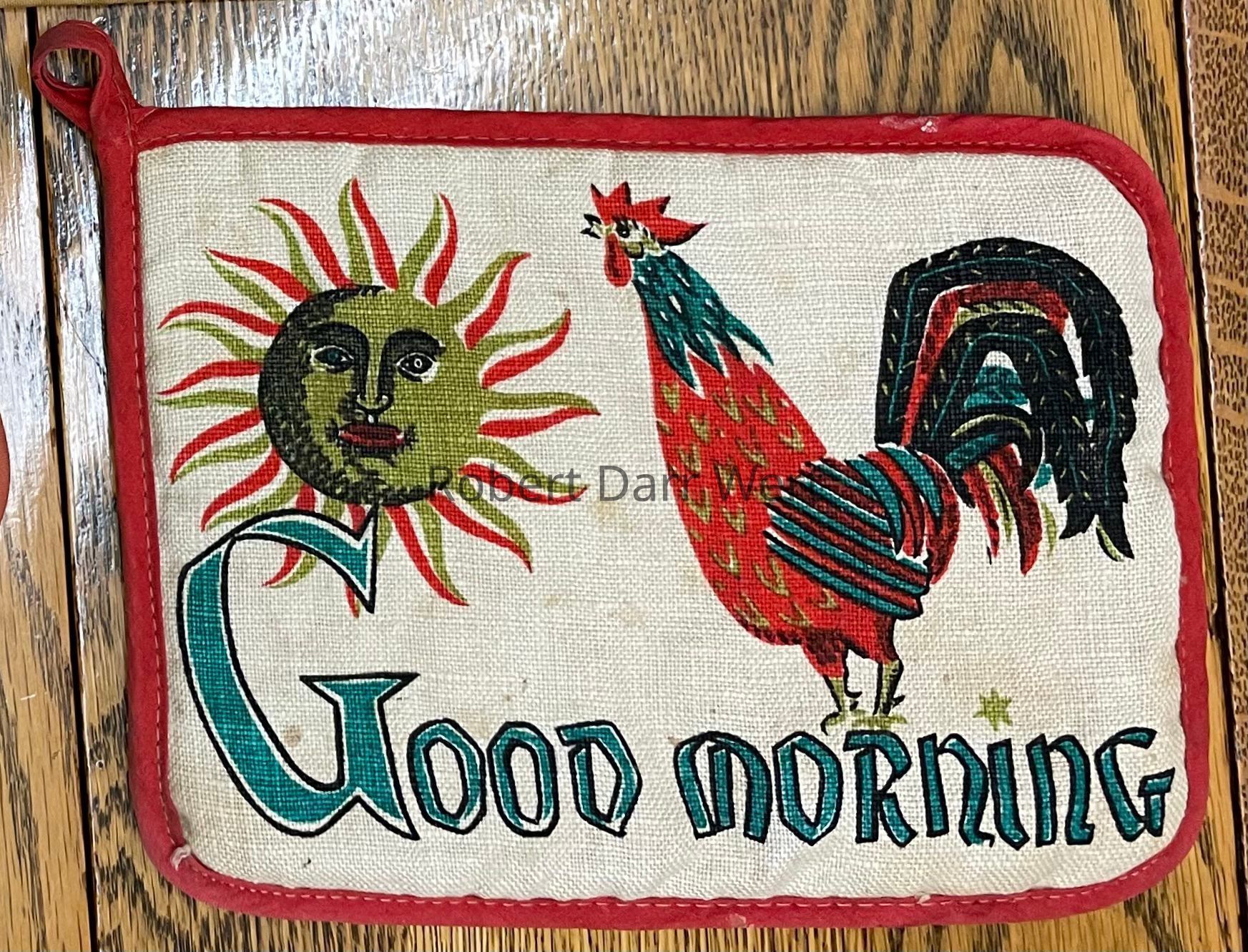 A potholder with a four-color silkscreen print on off-white linen depicting a rooster crowing at the sun while standing atop the greeting, “Good Morning”.