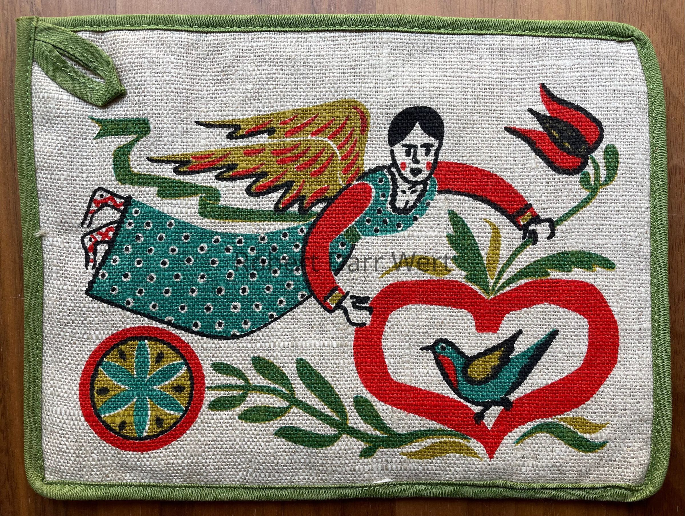 A four-color silkscreen print on unbleached linen depicting a calico-clad angel holding aloft a tulip and heart. A bird sits within a the heart, and a hex sign stands in as the flower head on a long stem. The potholder edges are bound with green bias tape, which also forms a hanging loop.
