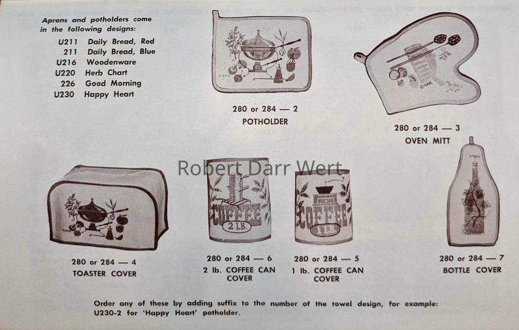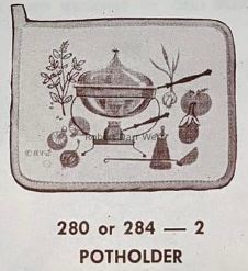The potholder is part of a suite of kitchen accessories designed to coordinate with Motif Gourmet Herbs 280 and Cheese 284 wall hangings, and the same print appears on both the potholders and toaster covers.