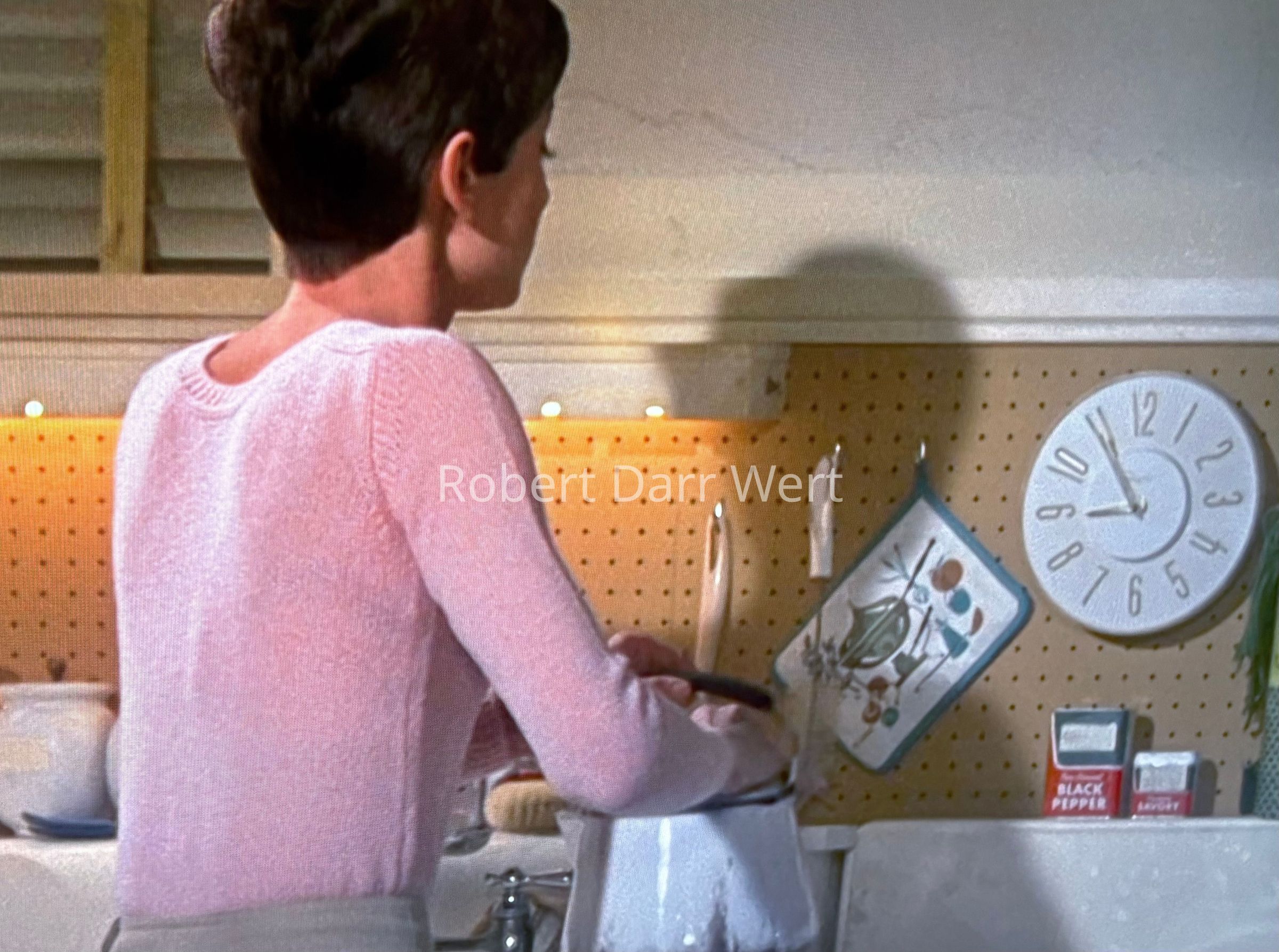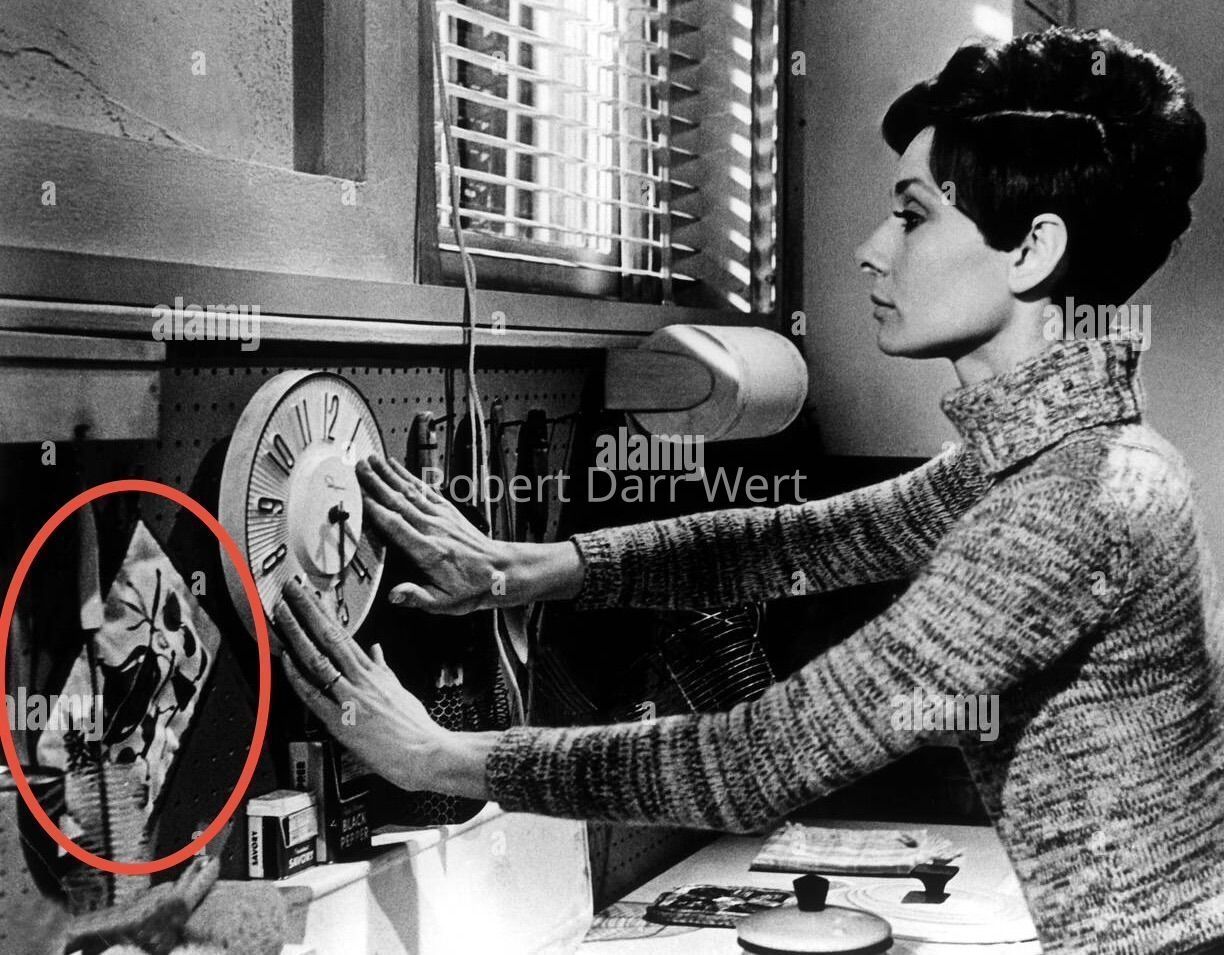 This potholder in the turquoise colorway was used as a prop in the kitchen of the 1967 Warner Bros. film “Wait Until Dark”, starring Audrey Hepburn and Richard Crenna; see images.Made/Created