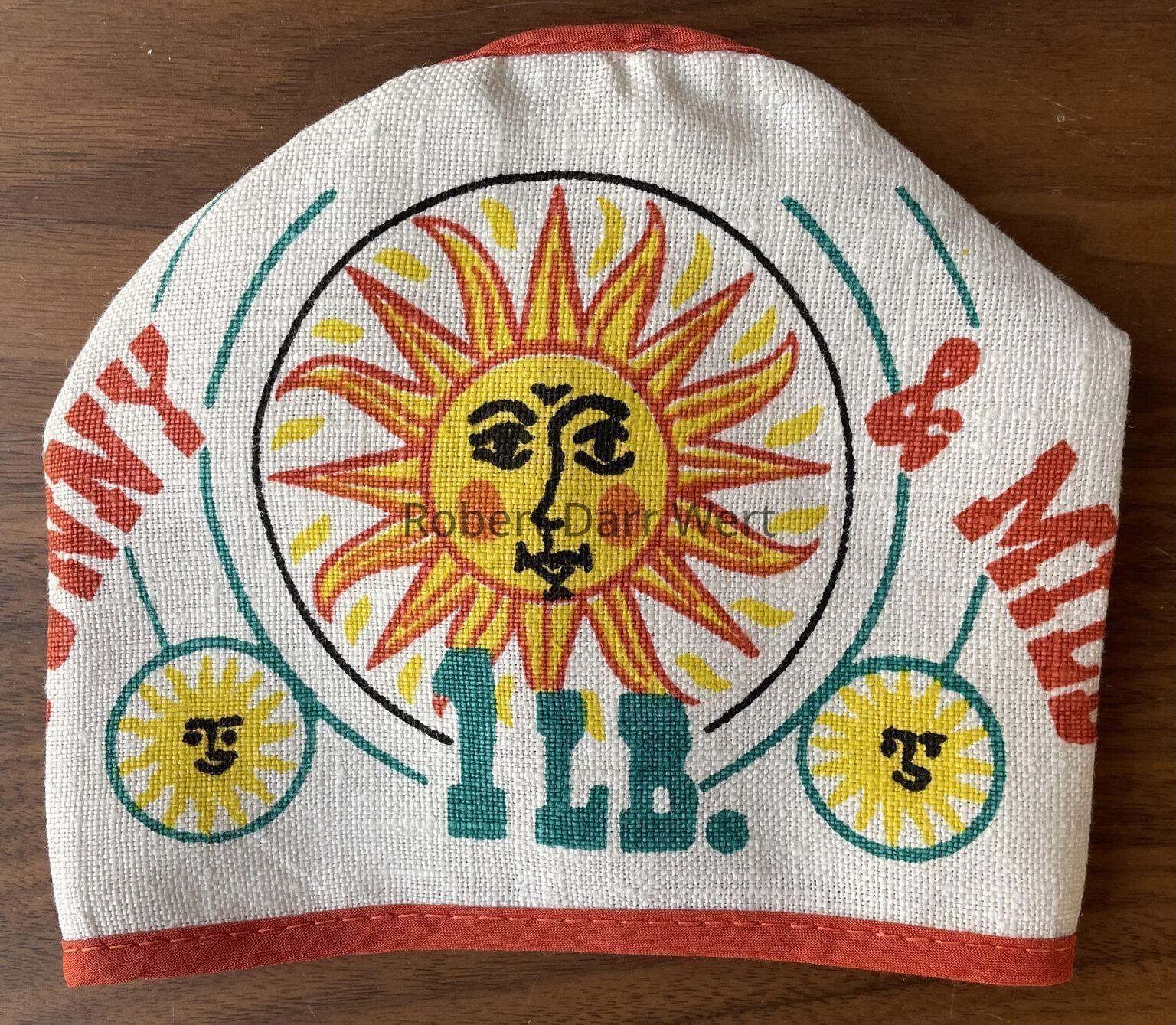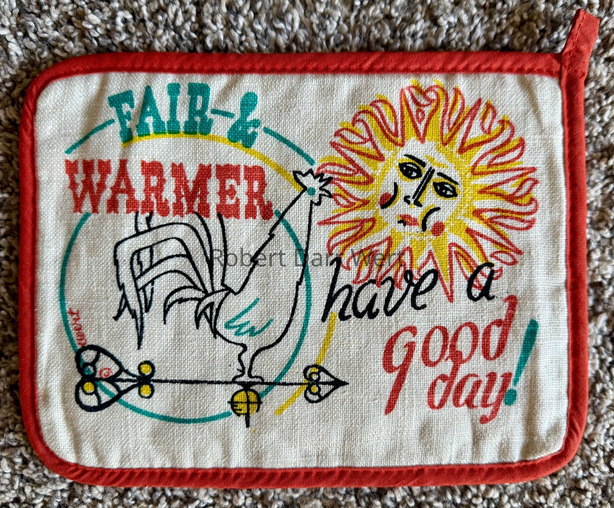 A four-color silkscreen print on off-white linen depicting a radiant sun, a rooster weathervane, a partial weather report (Fair & Warmer) and the theme “have a good day!”. Edges are bound in woven cotton seam binding to match the printing.