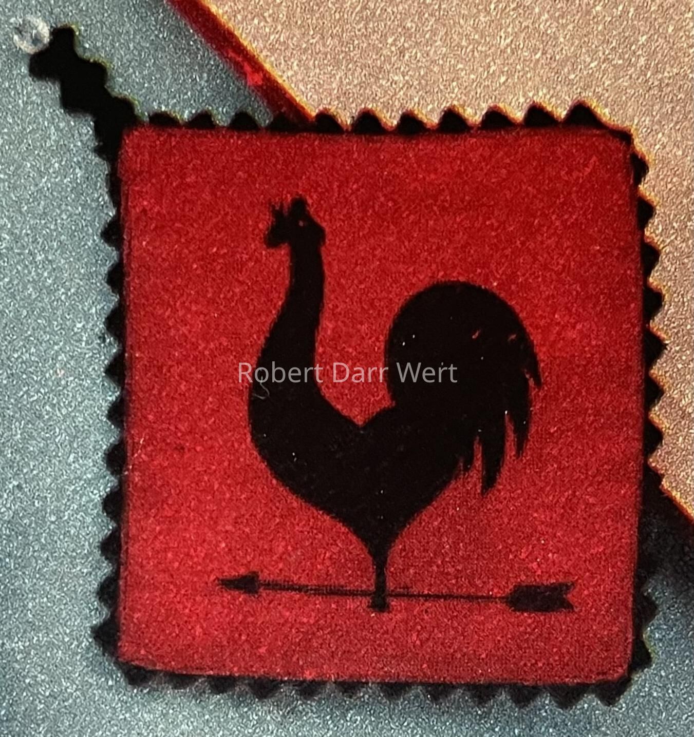 A one or two-color silkscreen print on a potholder depicting a rooster weathervane. Pot holder is edged in black rick rack, which also forms a hanging loop.Made/Created