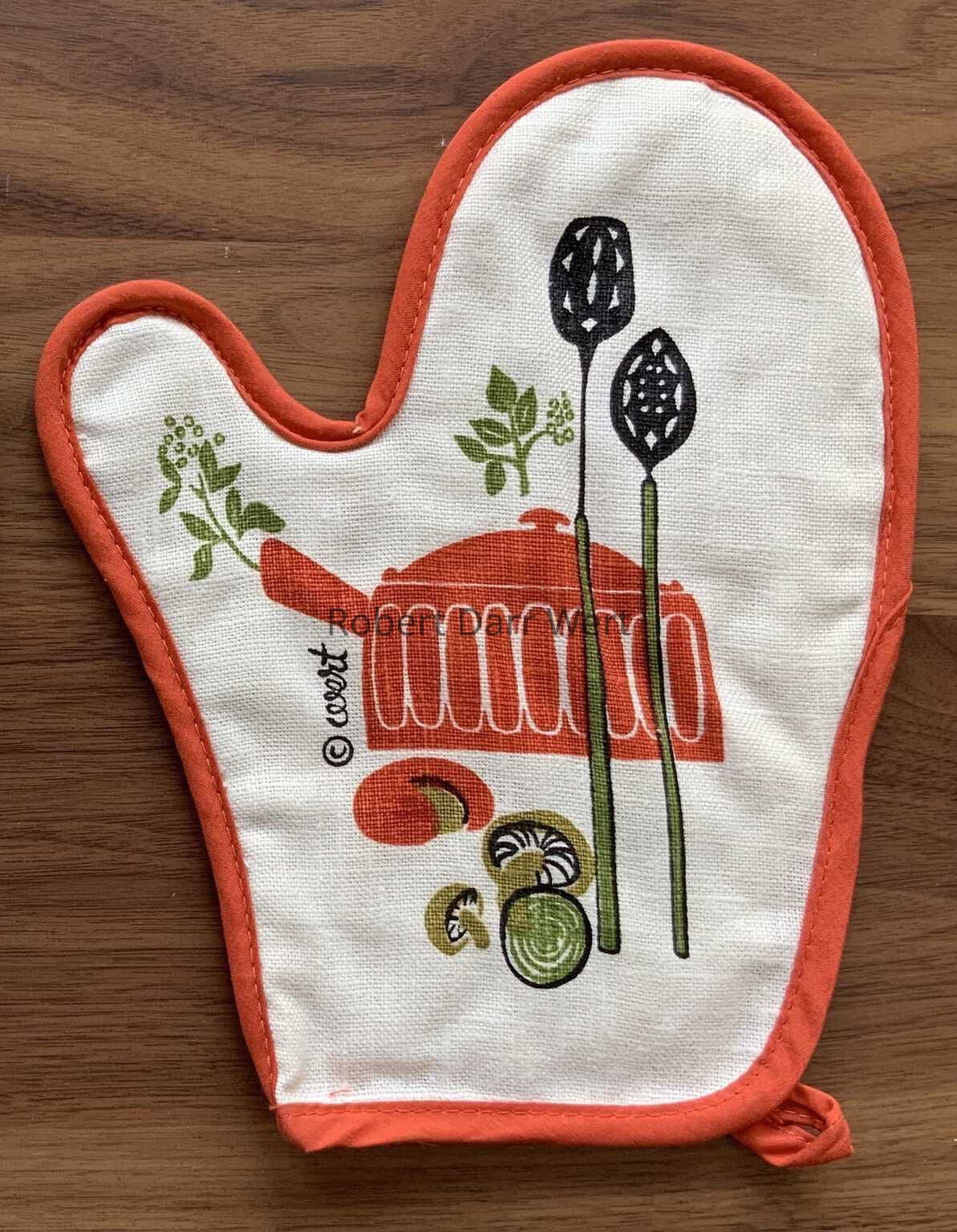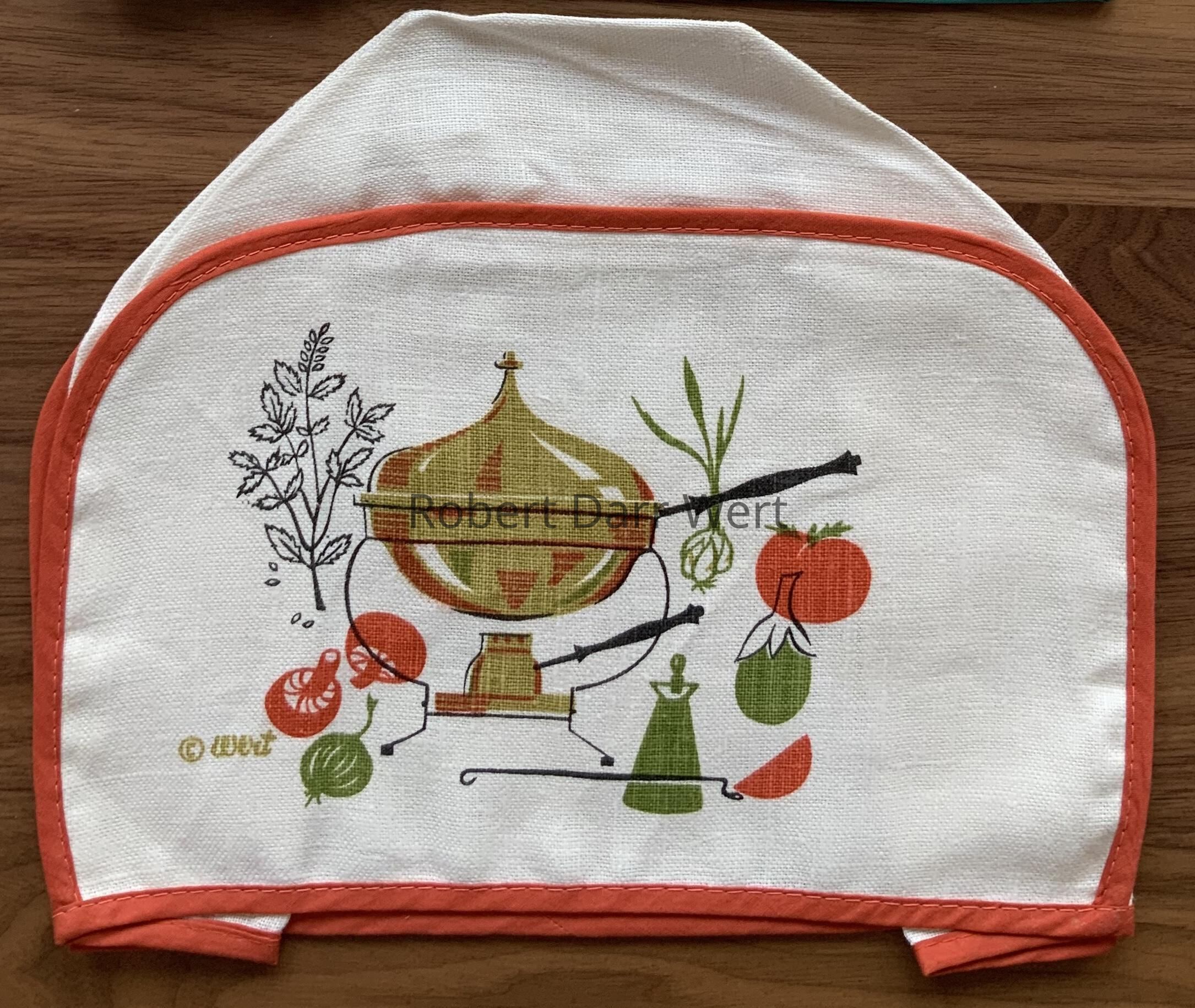 This toaster cover is part of Country Prints’ Motif Gourmet collection, a line of decidedly design-forward kitchen accessories that veer away from Wert’s usual Americana themes. The toaster cover was offered in turquoise and orange colorways. This example is in orange.