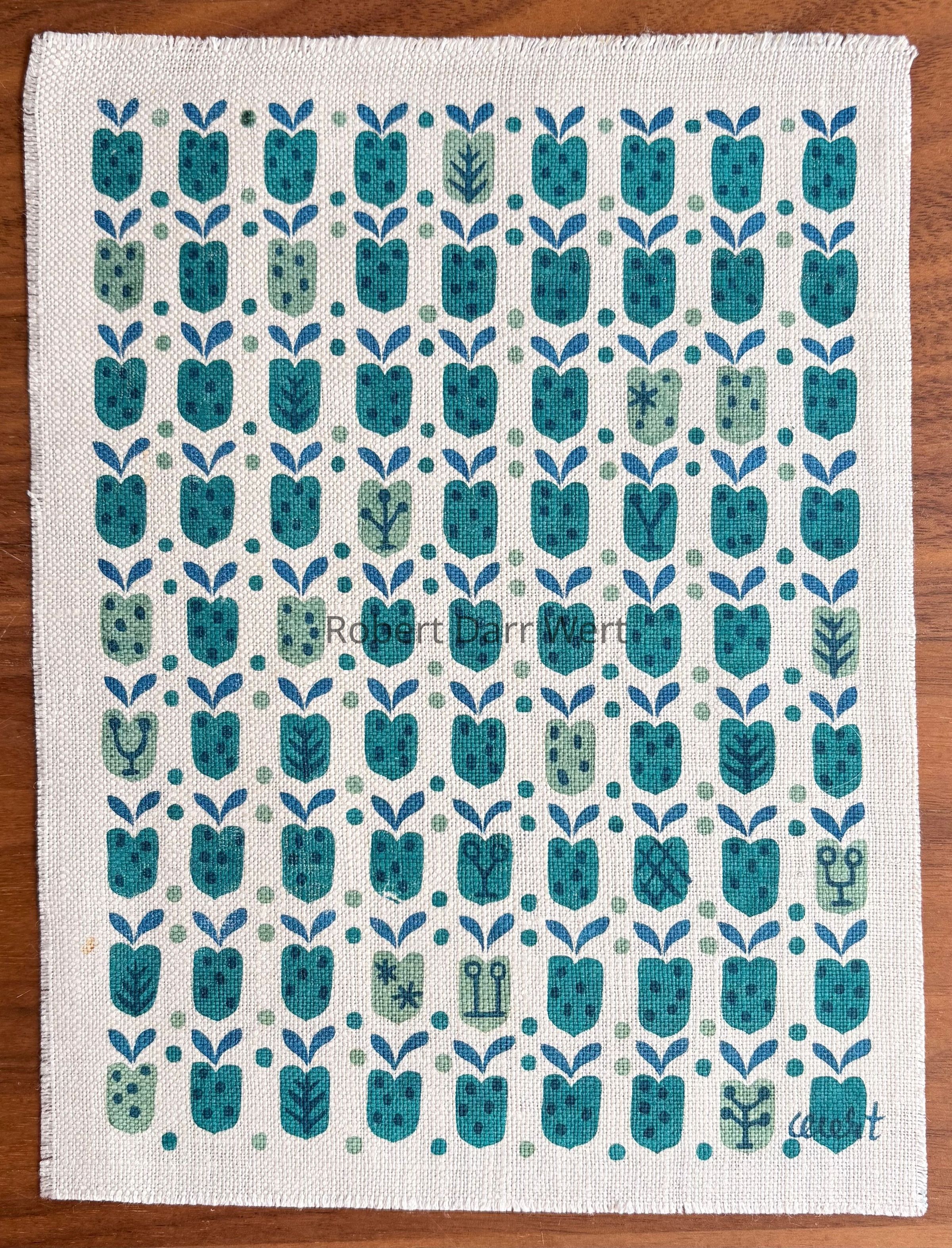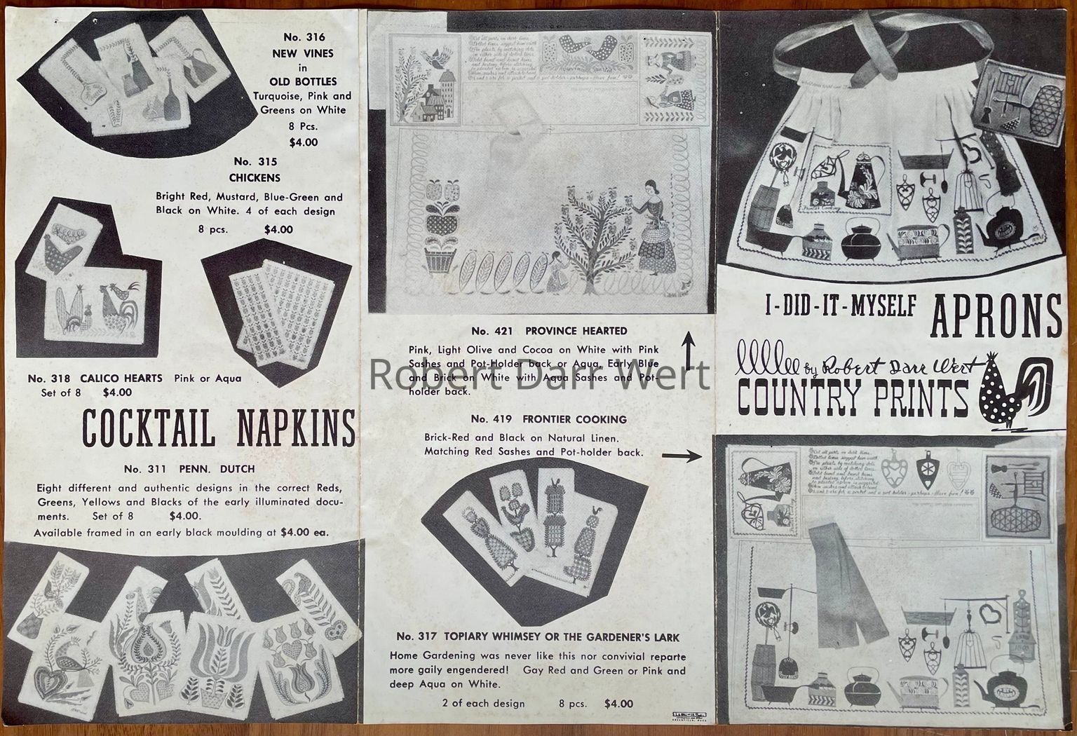 These cocktail napkins appear in the c.1955 brochure “I-Did-It-Myself Aprons by Robert Darr Wert/Country Prints” listed in two colorways: pink and aqua.