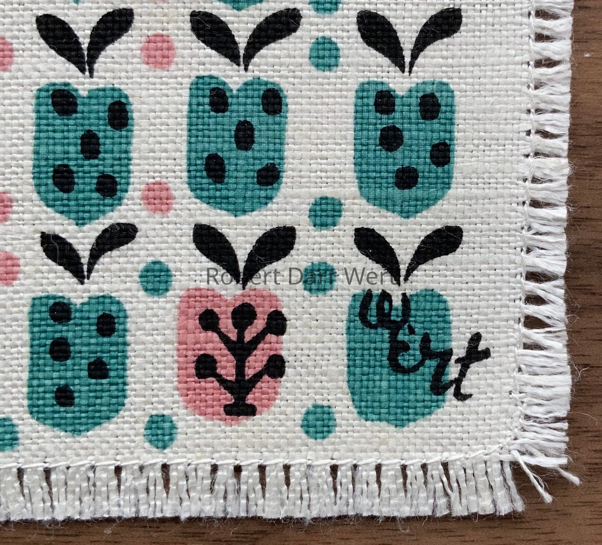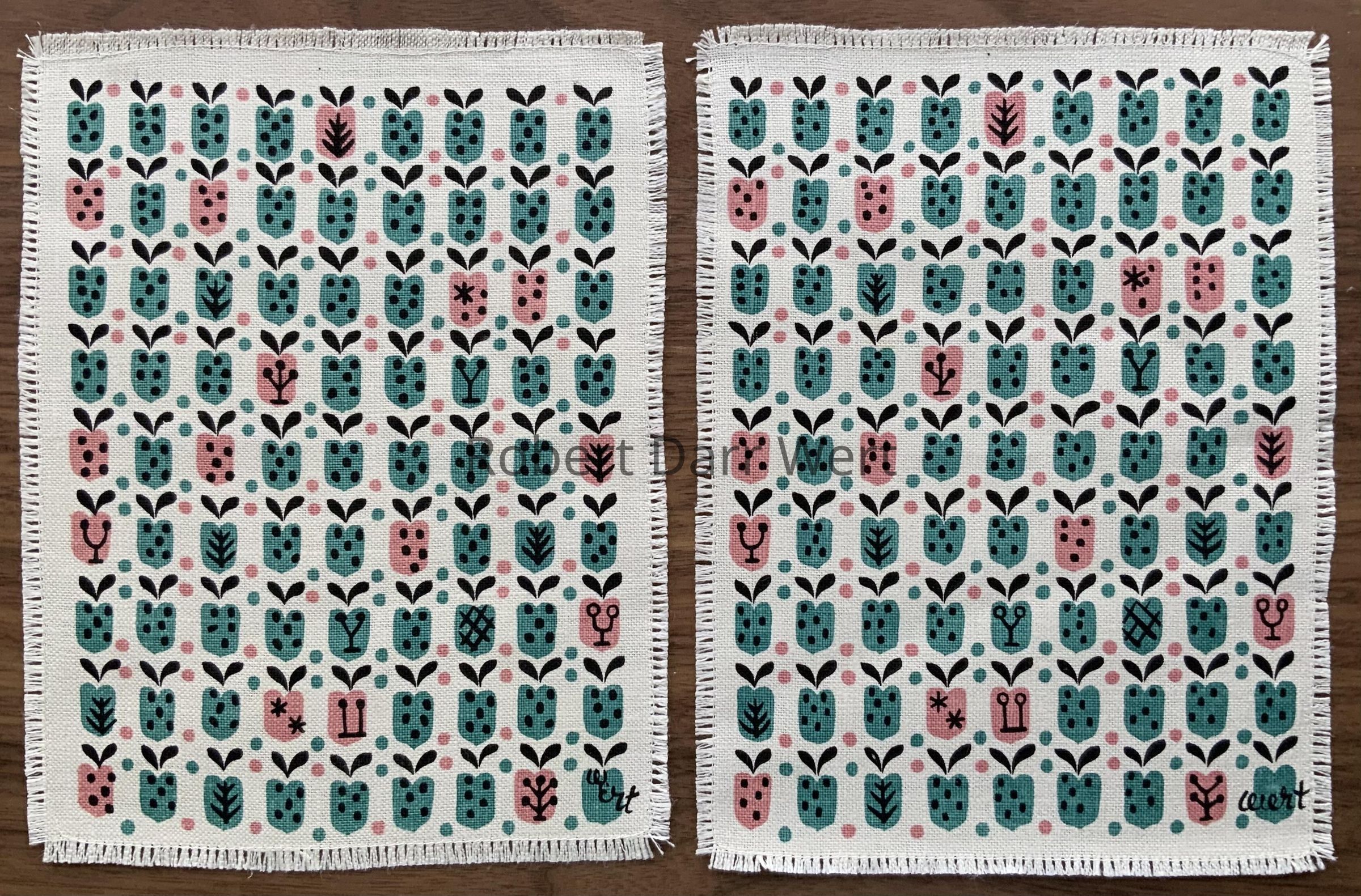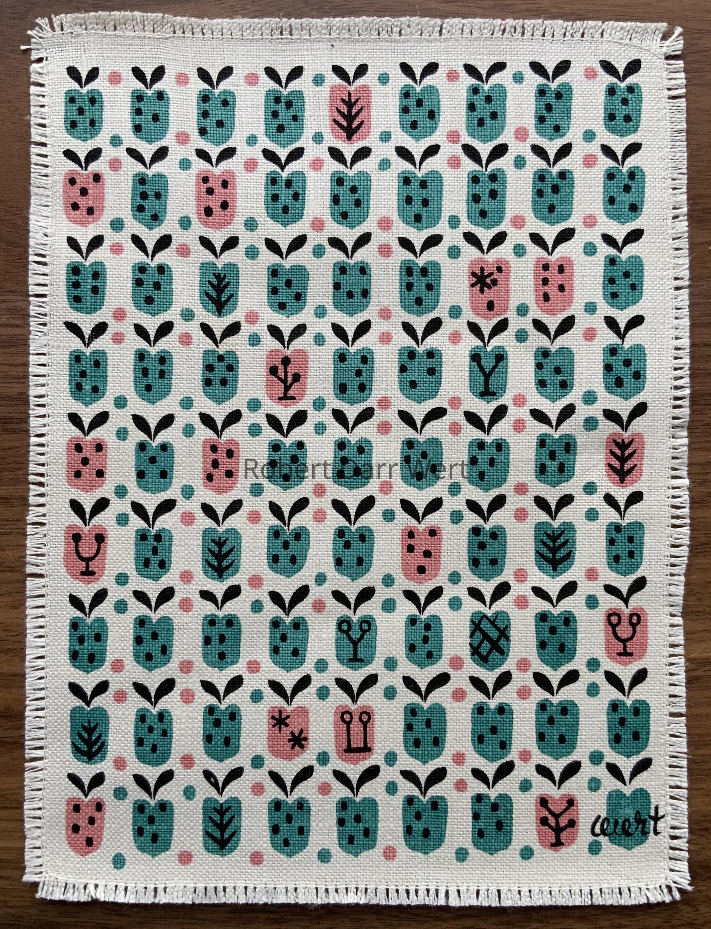 A three-color silkscreen print on off-white linen depicting heart shaped fruits, as might be found on calico fabric prints.