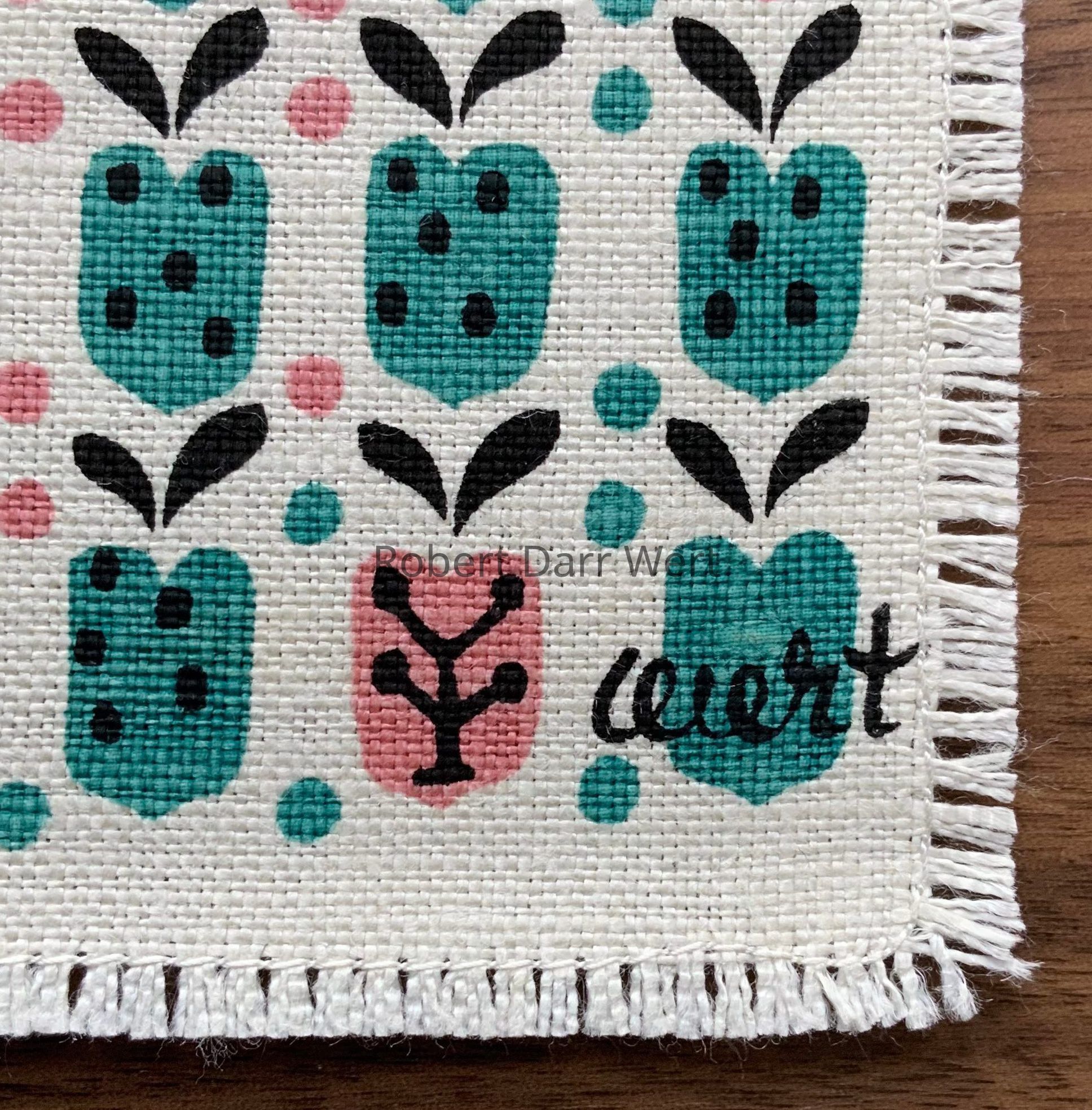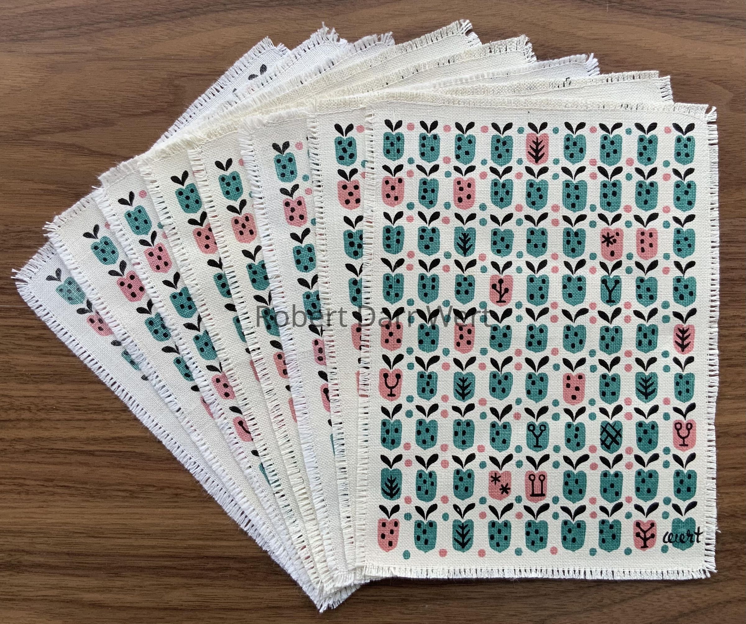 These cocktail napkins appear in the c.1955 brochure “I-Did-It-Myself Aprons by Robert Darr Wert/Country Prints”; see images.