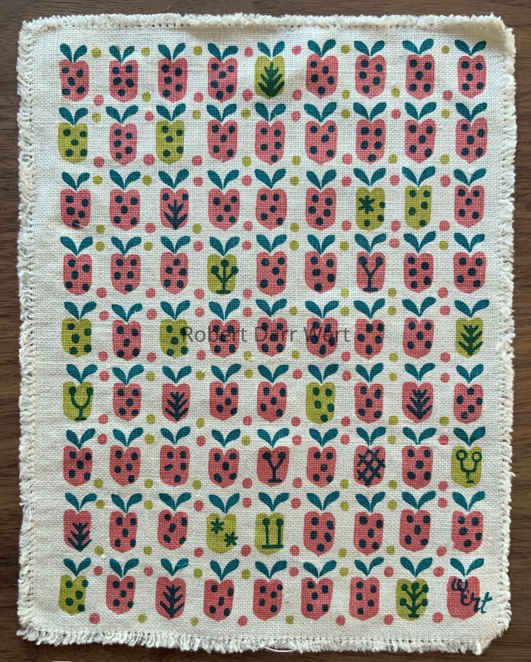 A three-color silkscreen print depicting heart shaped fruits, as might be found on calico fabric prints.