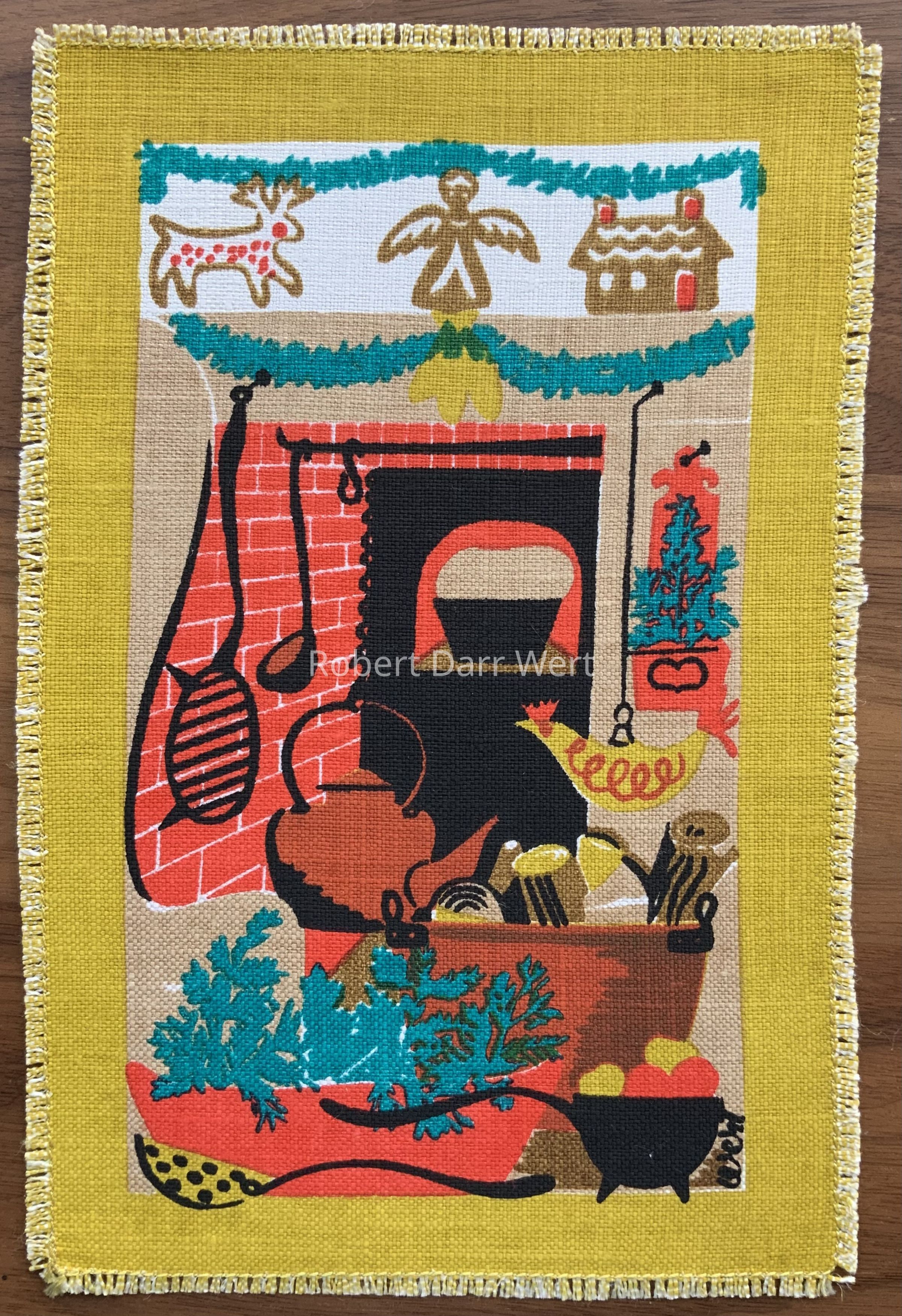 3. Another exploration of “Christmas Kitchen”, featuring baked goods, cooking implements and holiday decorations set against a cooking fireplace with an oven, and holiday greens.