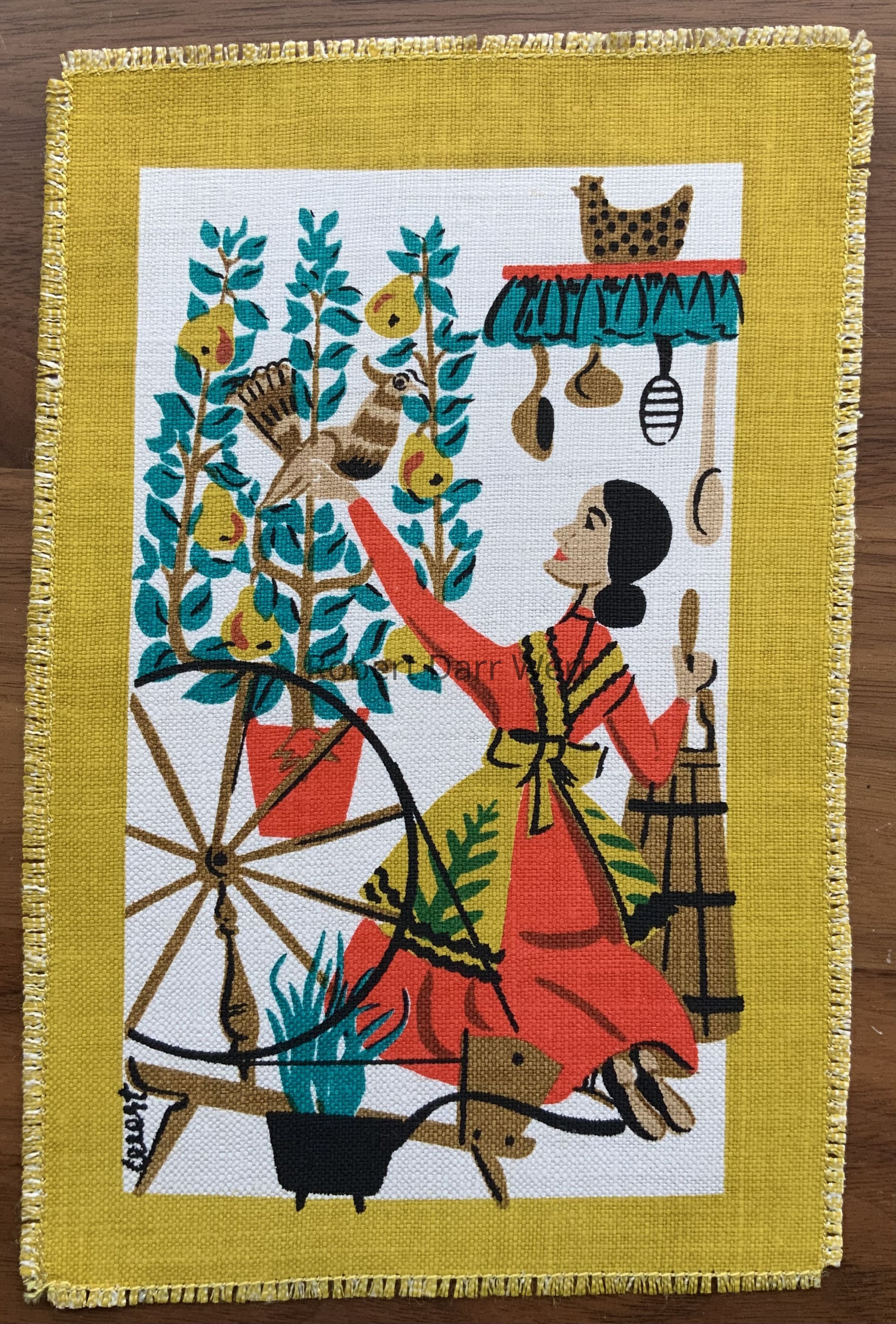 4. A reference to the “Twelve Days of Christmas”, with a woman kneeling while churning butter and reaching into an espaliered pear tree to hold a partridge.