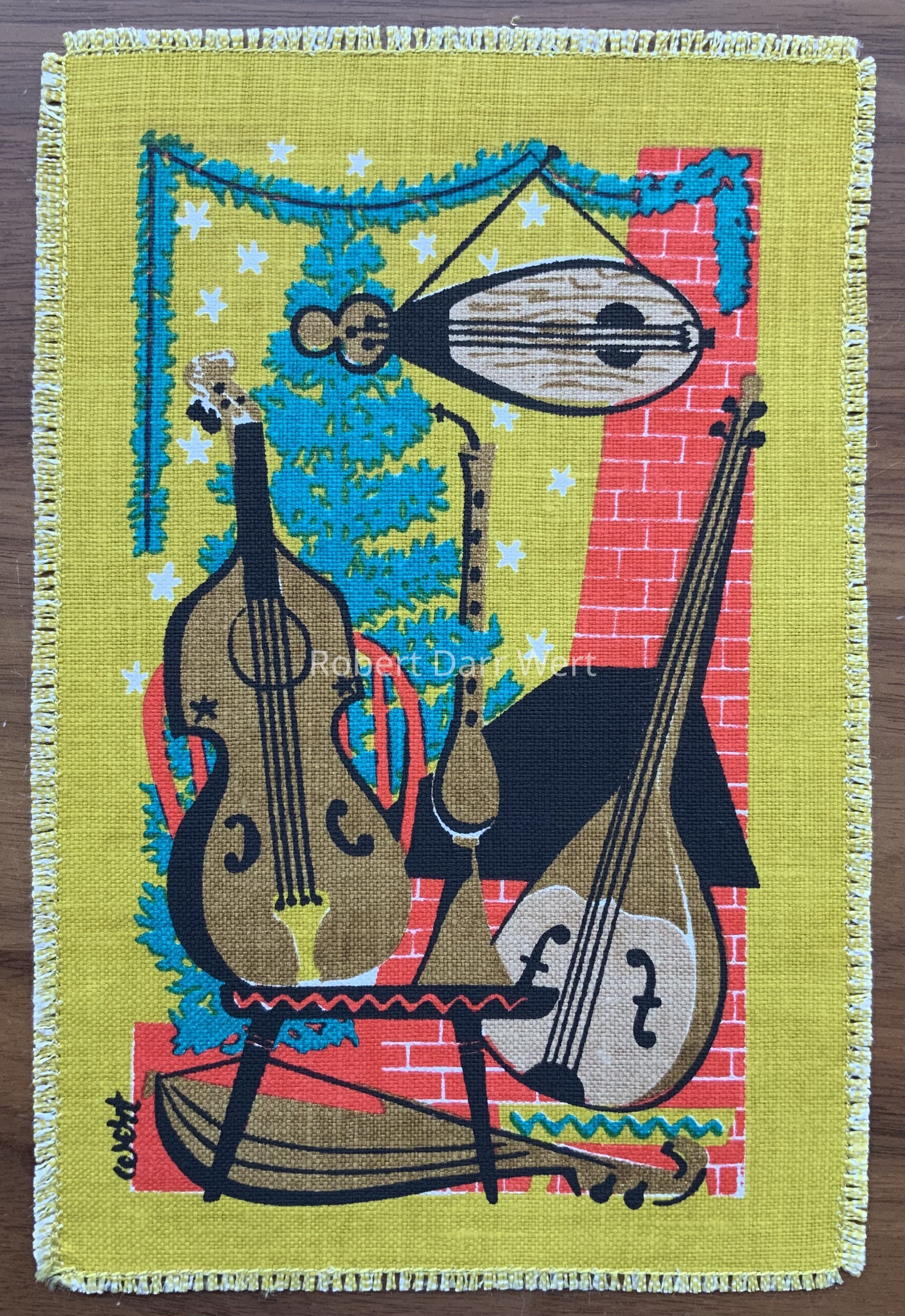 1. Early stringed and woodwind instruments set against a brick fireplace along with holiday greens.