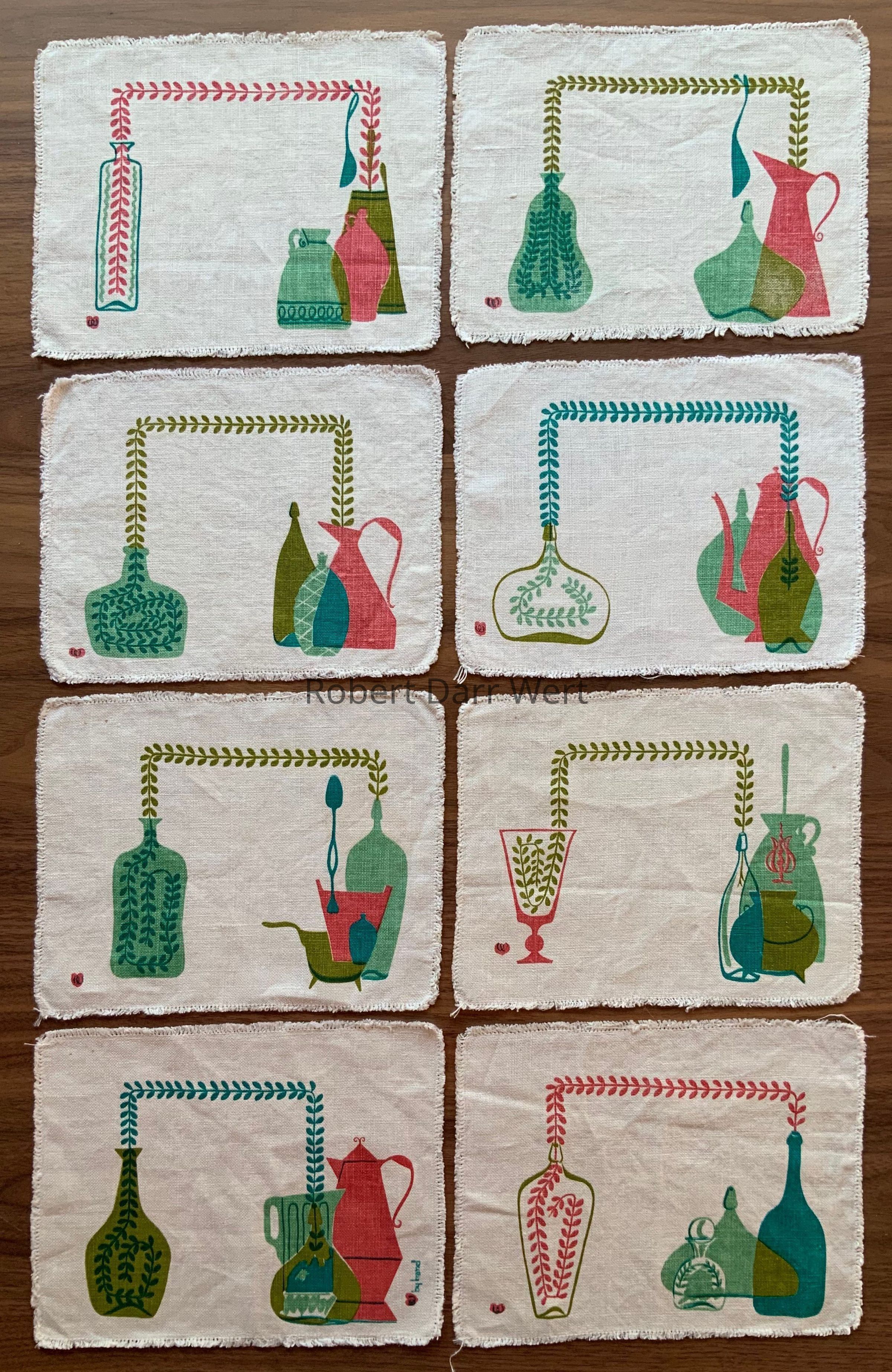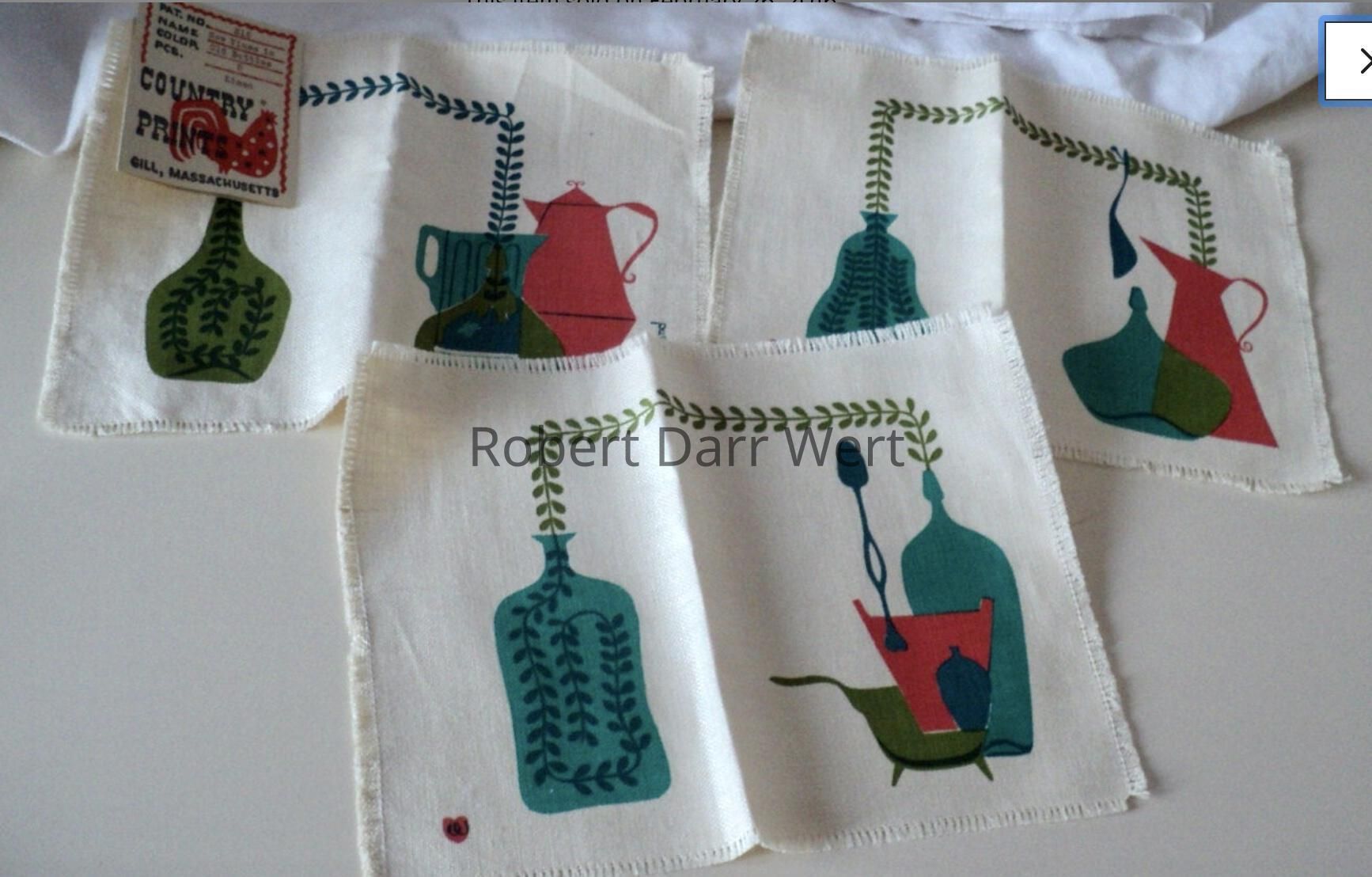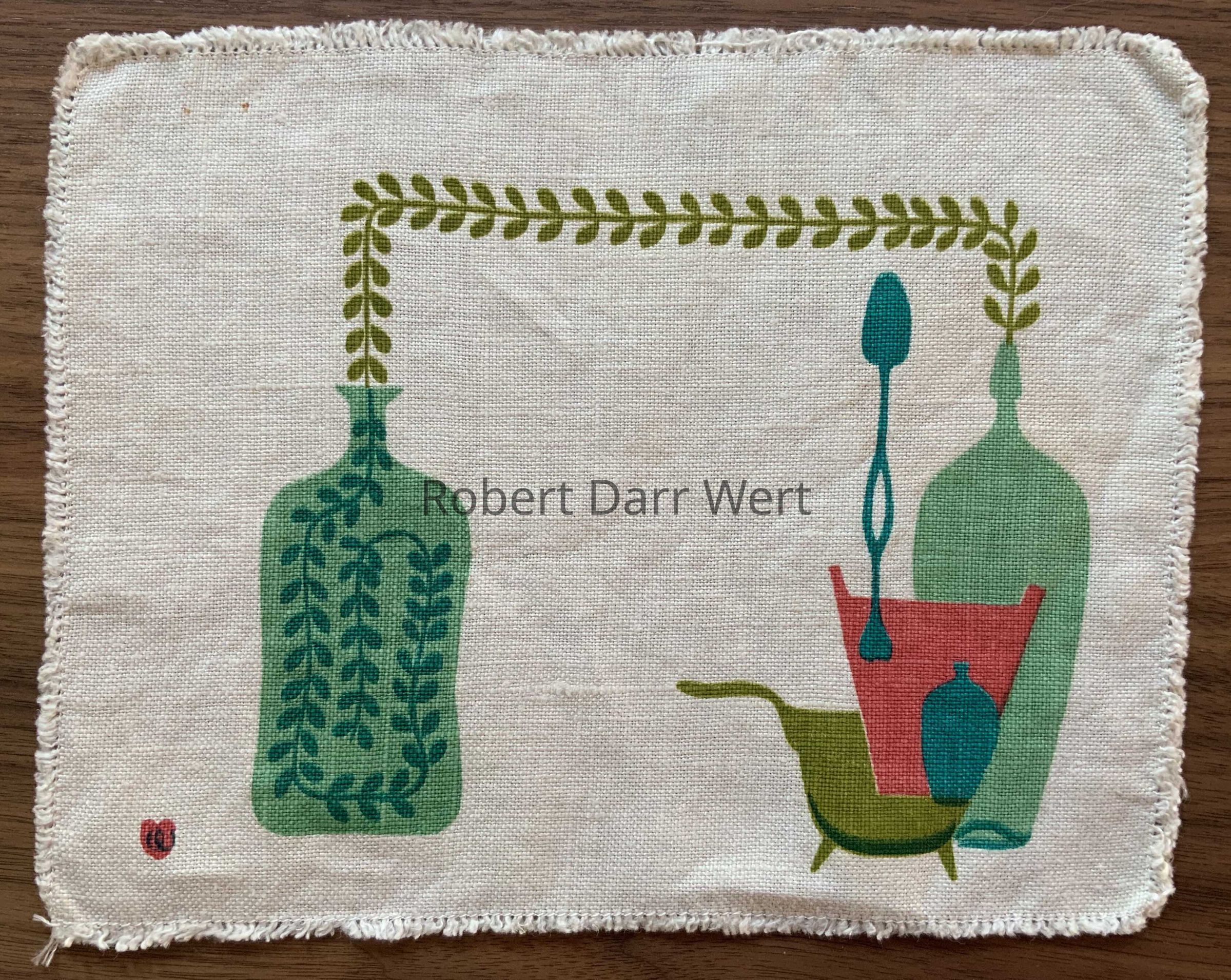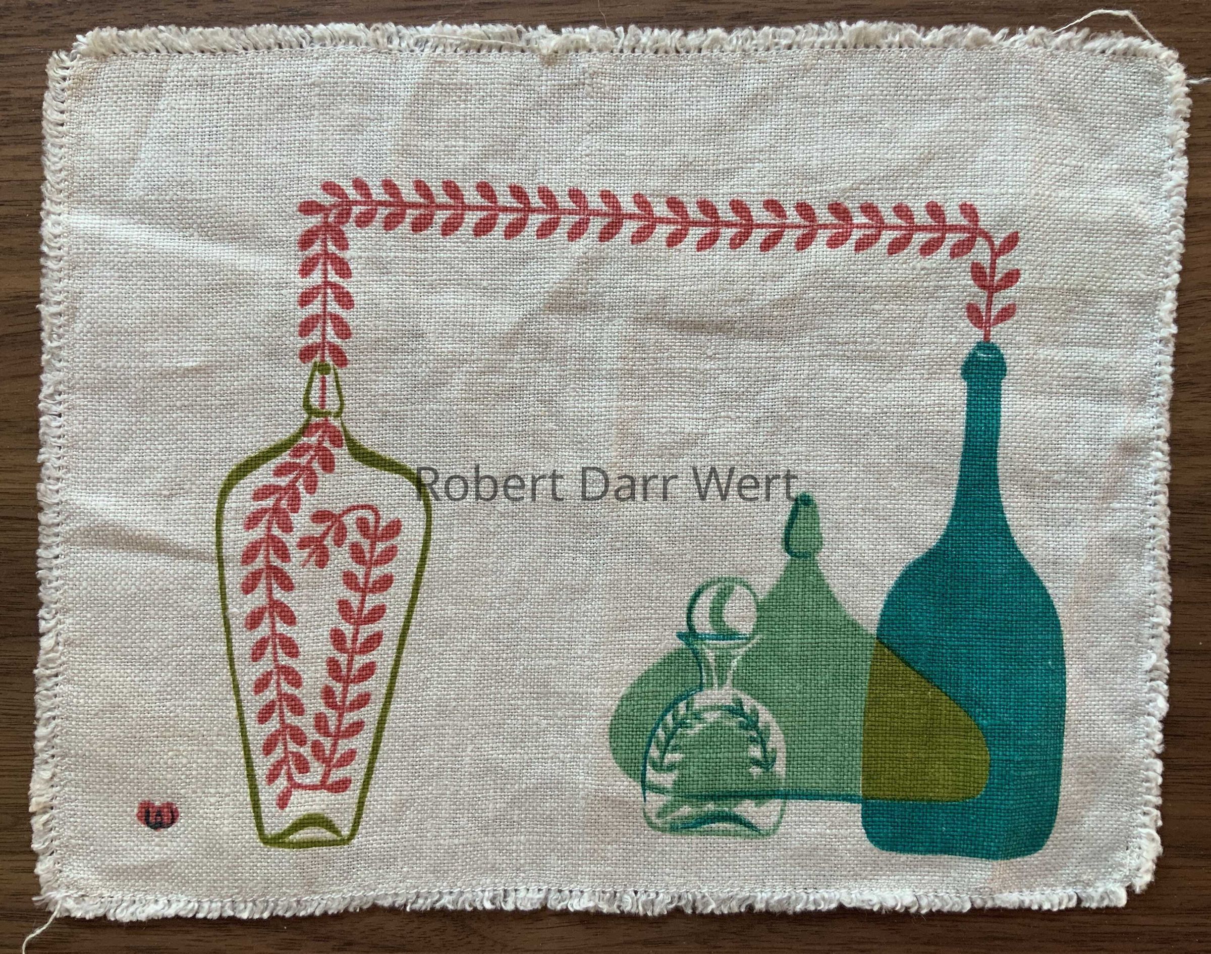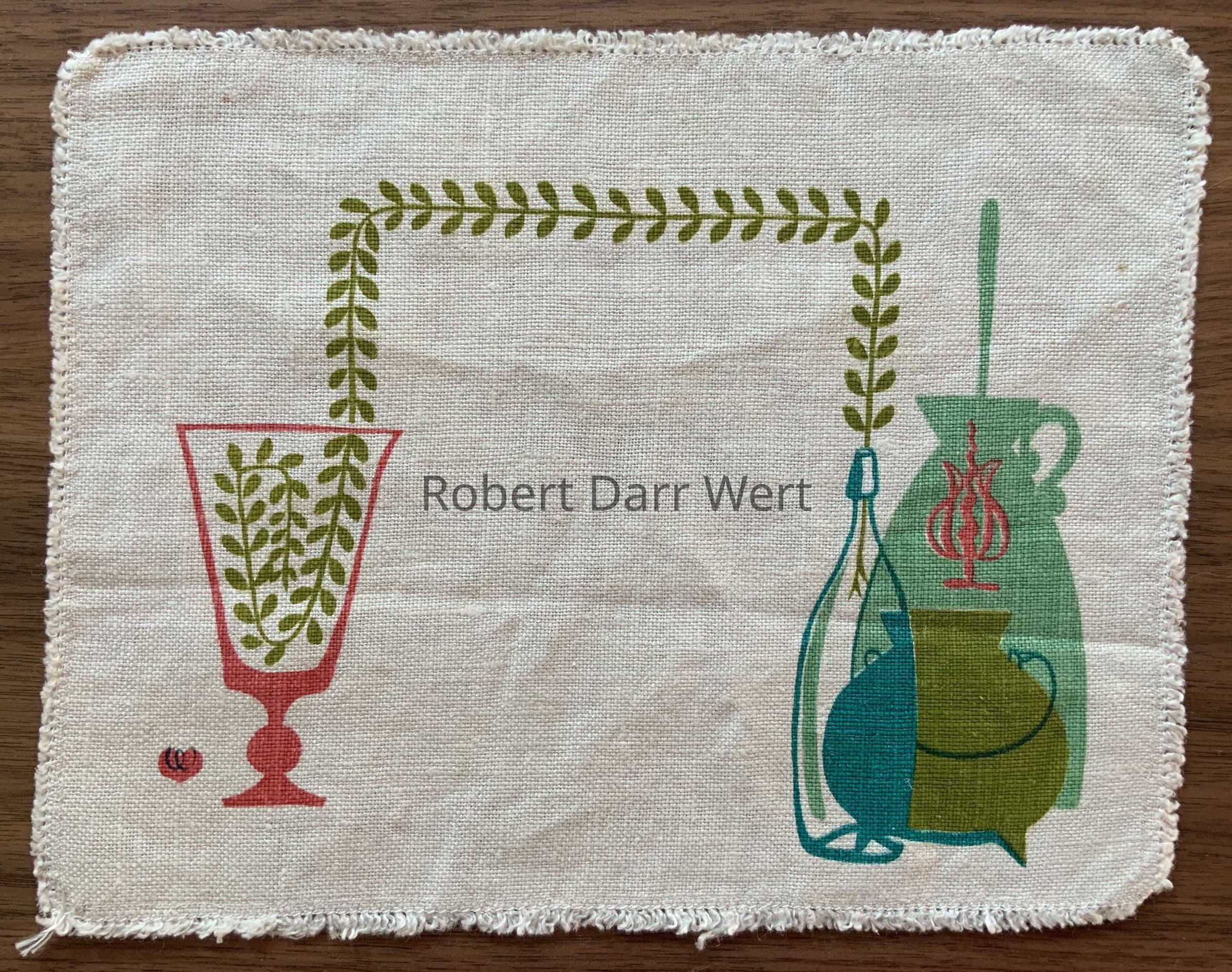 These cocktail napkins appear in the c.1955 brochure “I-Did-It-Myself Aprons by Robert Darr Wert/Country Prints”, and is described in a c.1955 price list, “ 316 New Vines in Old Bottles — Enough said, in pink, turquoise, light aqua and bottle green on white linen, 7 x 9…Set of eight each different.”