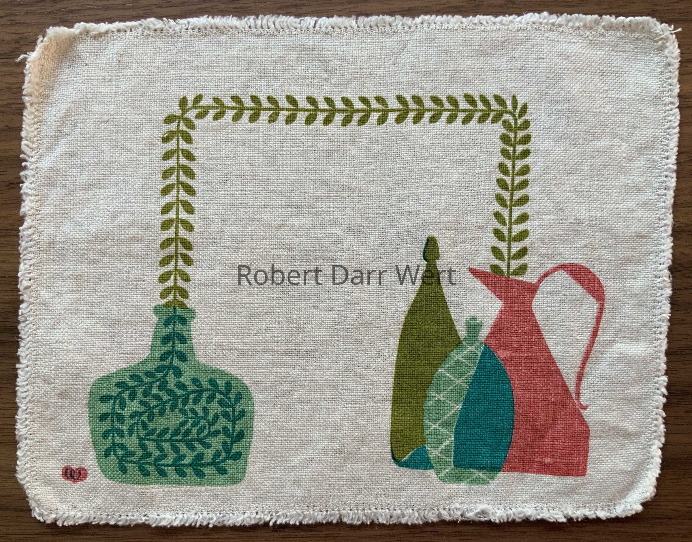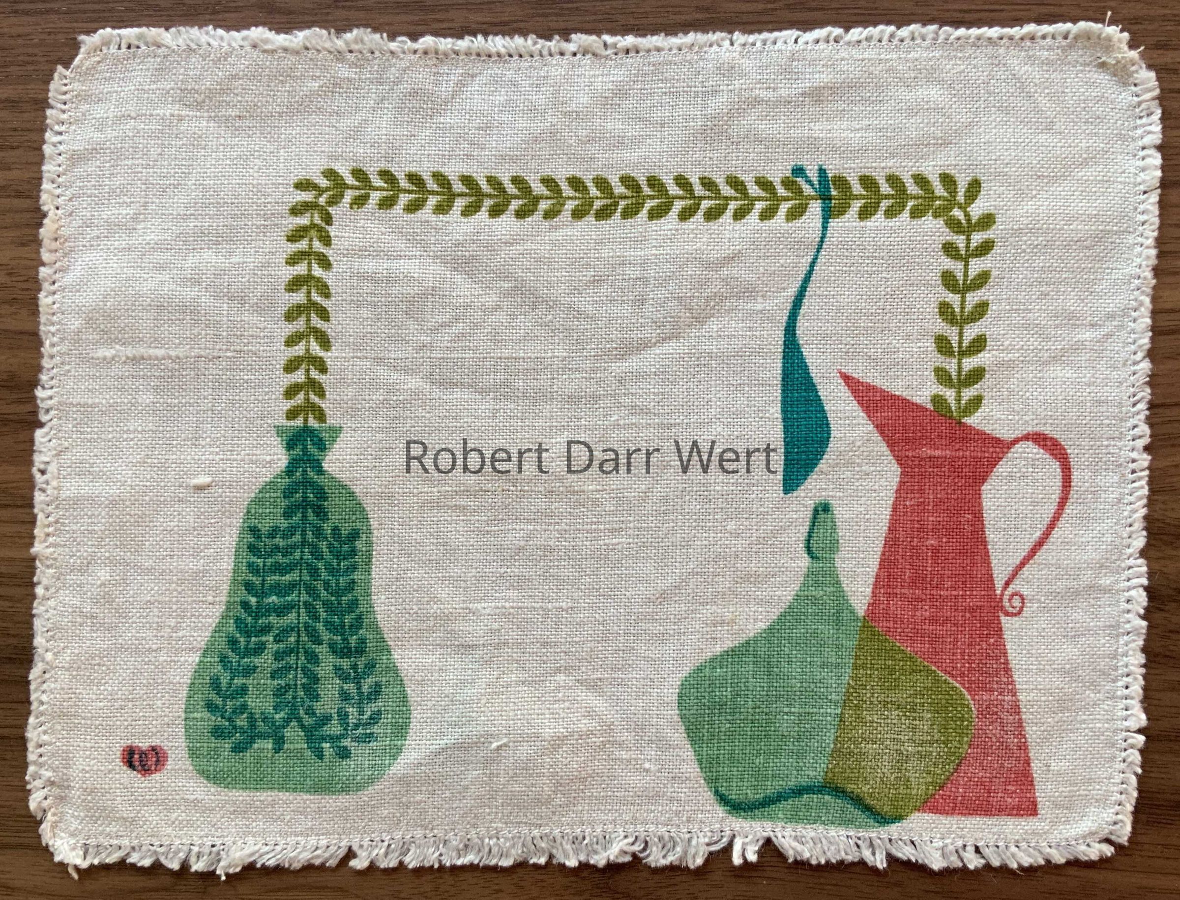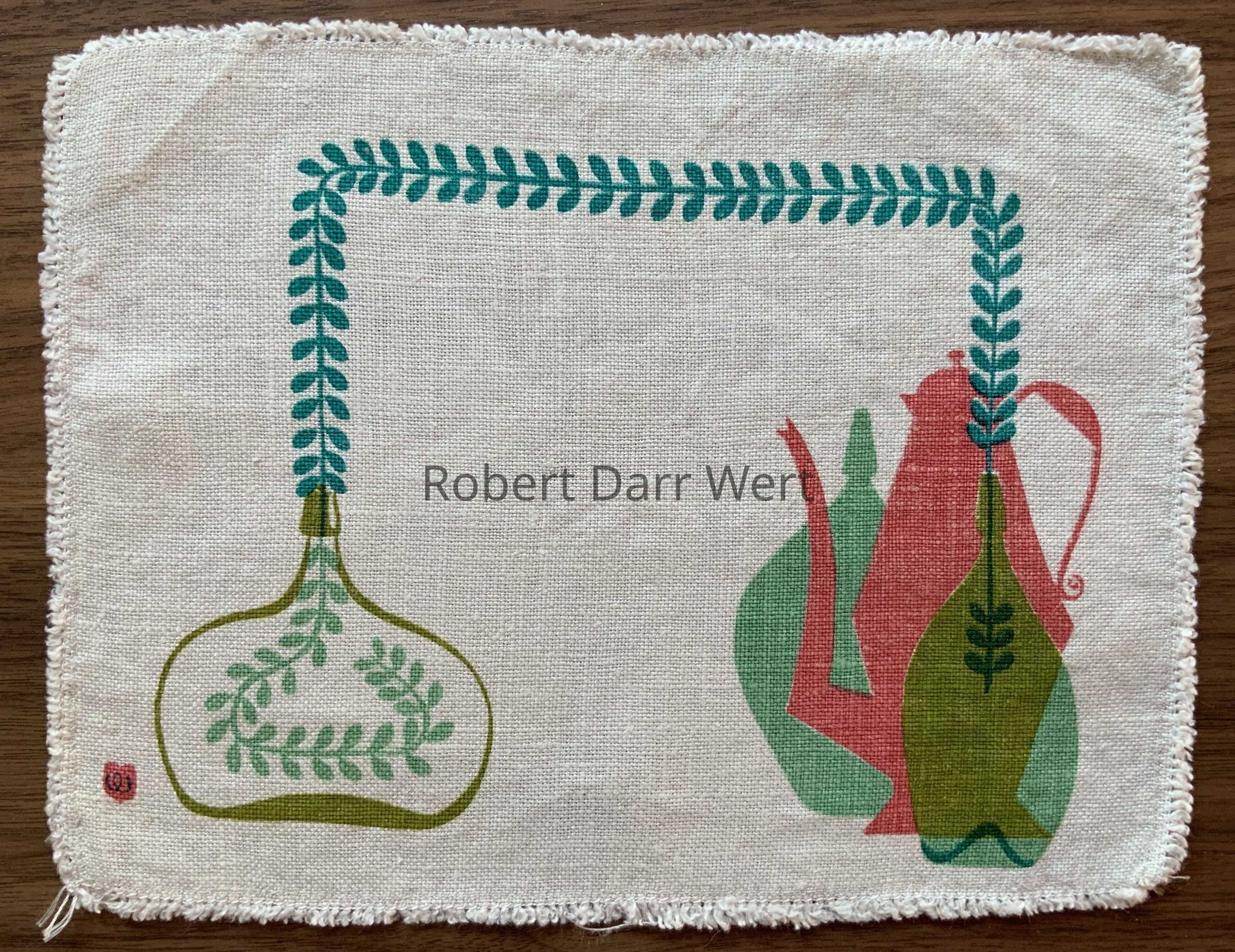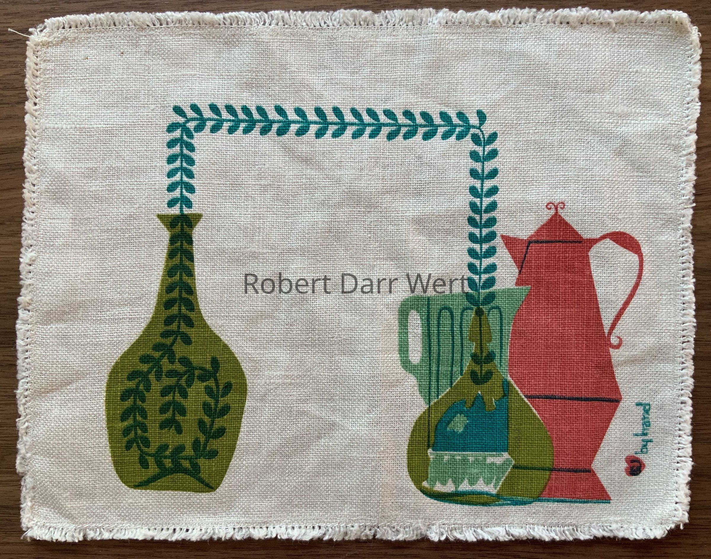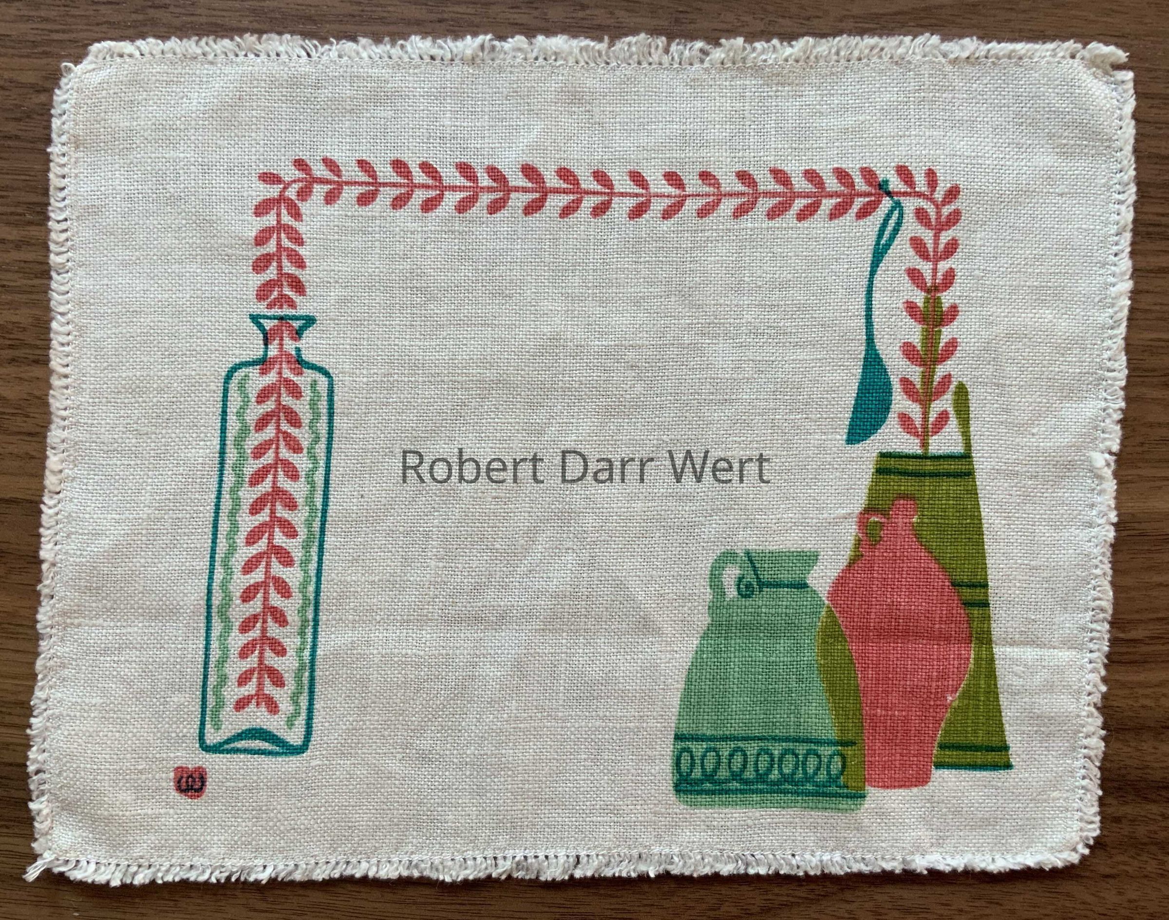 These cocktail napkins appear in the c.1955 brochure “I-Did-It-Myself Aprons by Robert Darr Wert/Country Prints”, and is described in a c.1955 price list, “ 316 New Vines in Old Bottles — Enough said, in pink, turquoise, light aqua and bottle green on white linen, 7 x 9…Set of eight each different.”