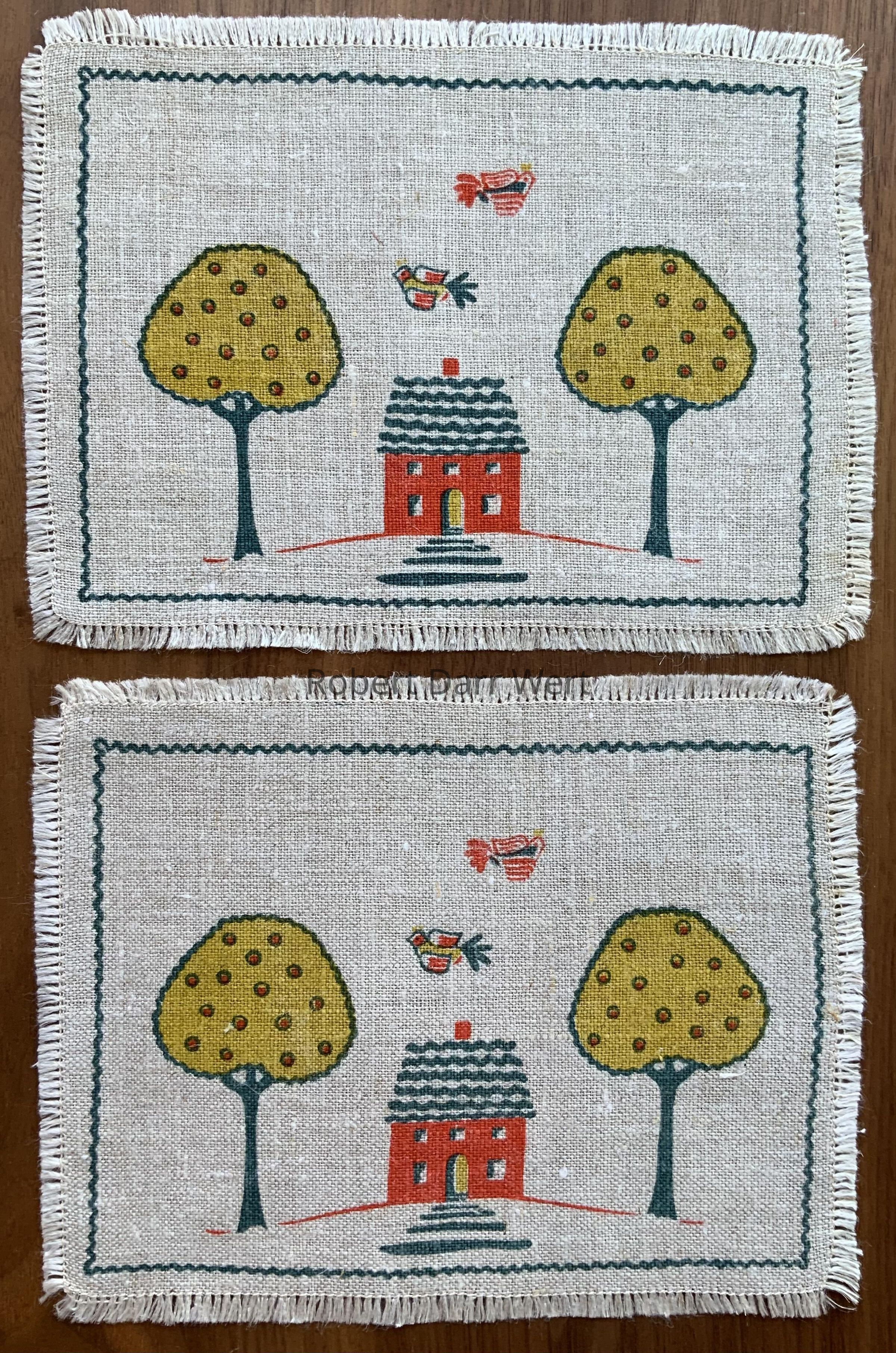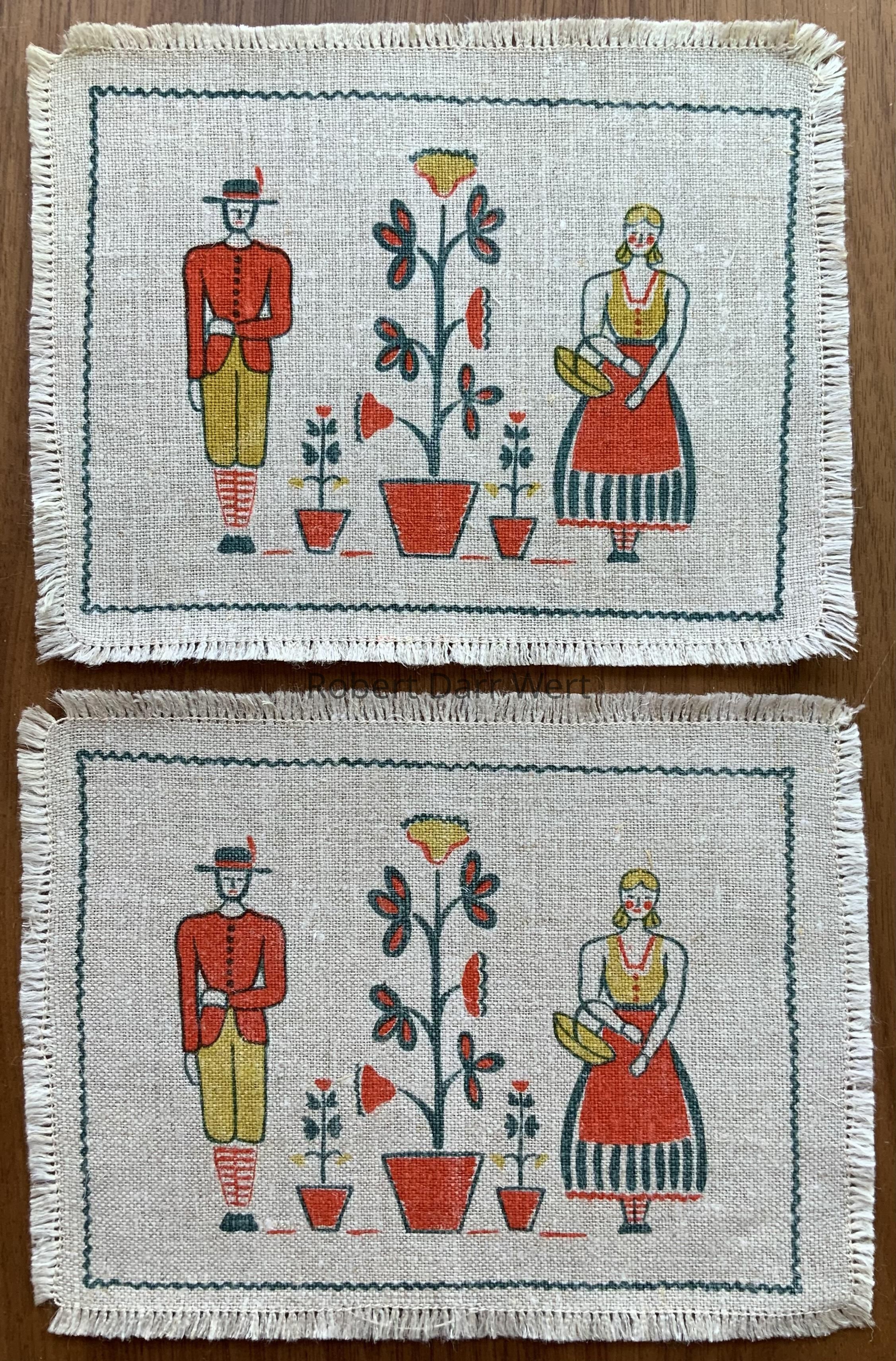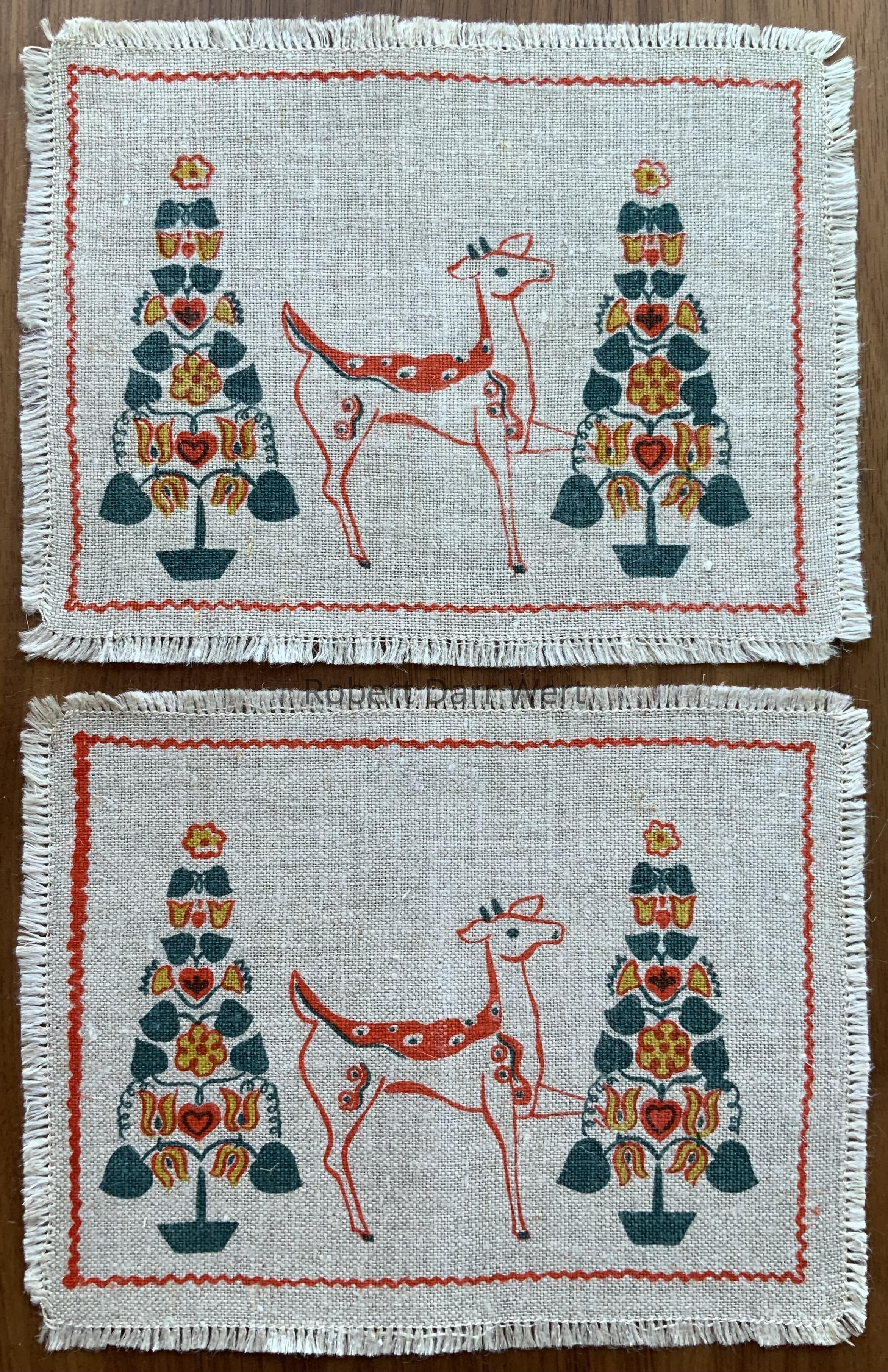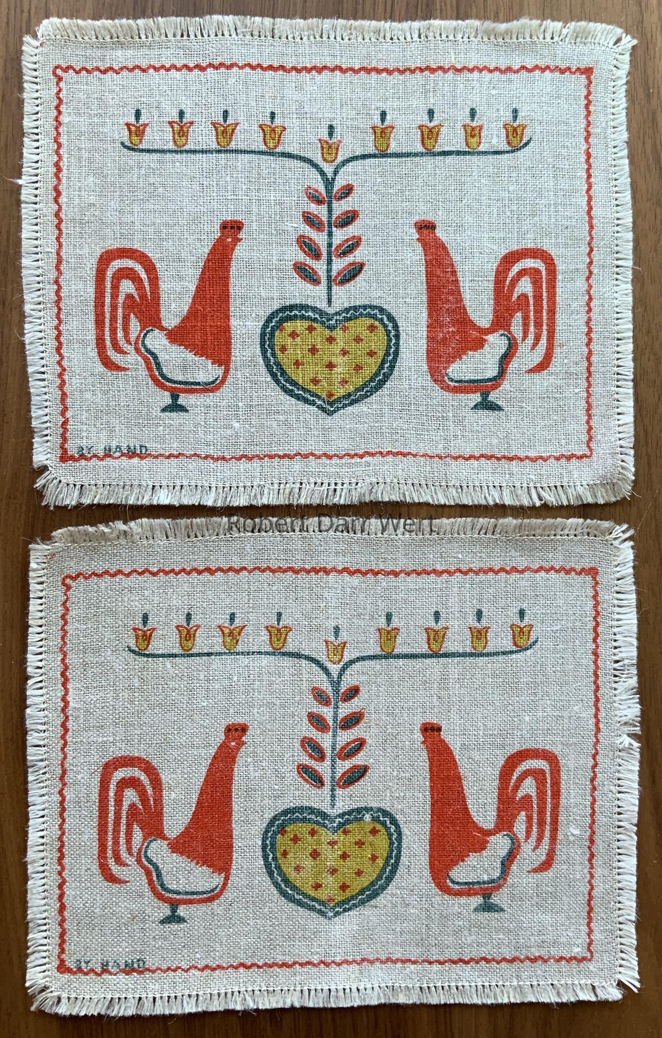 A set of eight cocktail napkins, two each of four designs. Each design is a three-color silkscreen print on natural linen. The compositions are influenced by both Pennsylvania “Dutch” and Scandinavian folk art. The set is unsigned, except for Wert’s “by hand” tag line.
