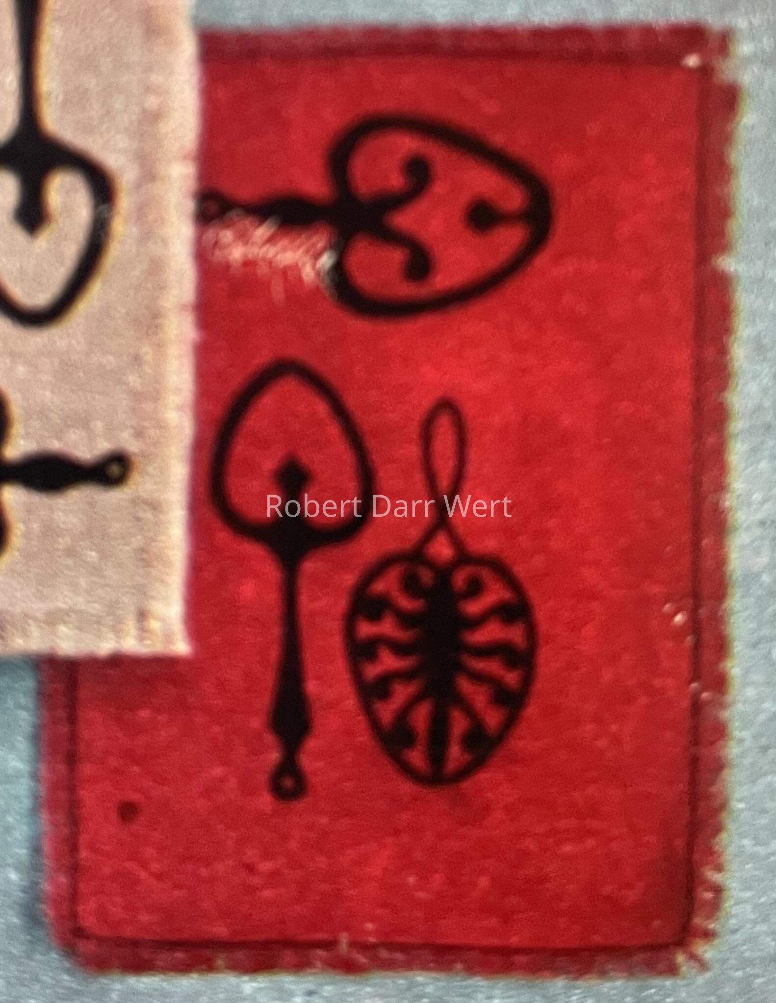A one-color silkscreen print on red dyed linen depicting cast iron trivets.