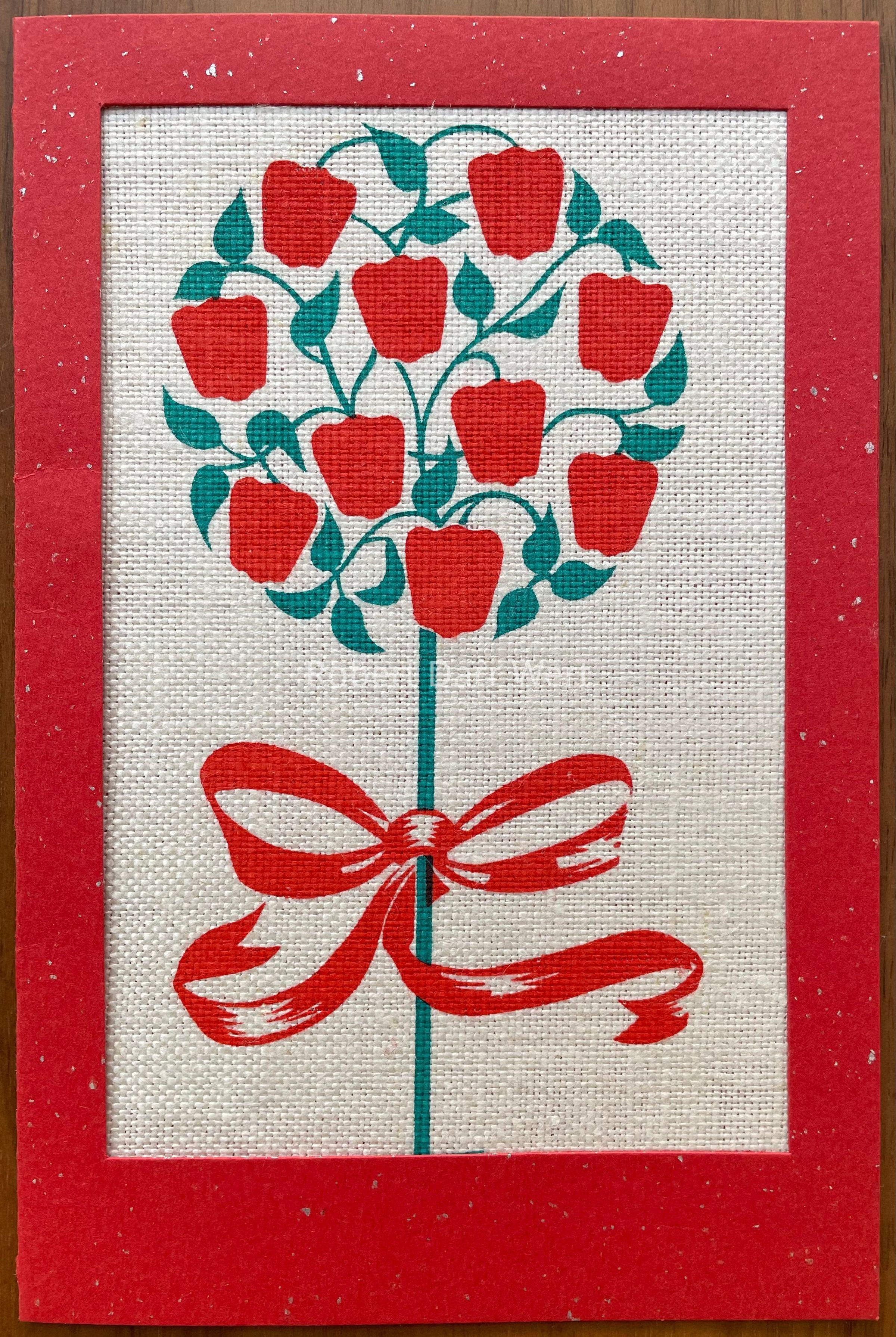 A notecard with a two-color silkscreen print on off-white linen affixed within a die cut notecard of red cardstock accented with silver flecks. The print features a stylized apple tree tied with a red bow on the trunk.
