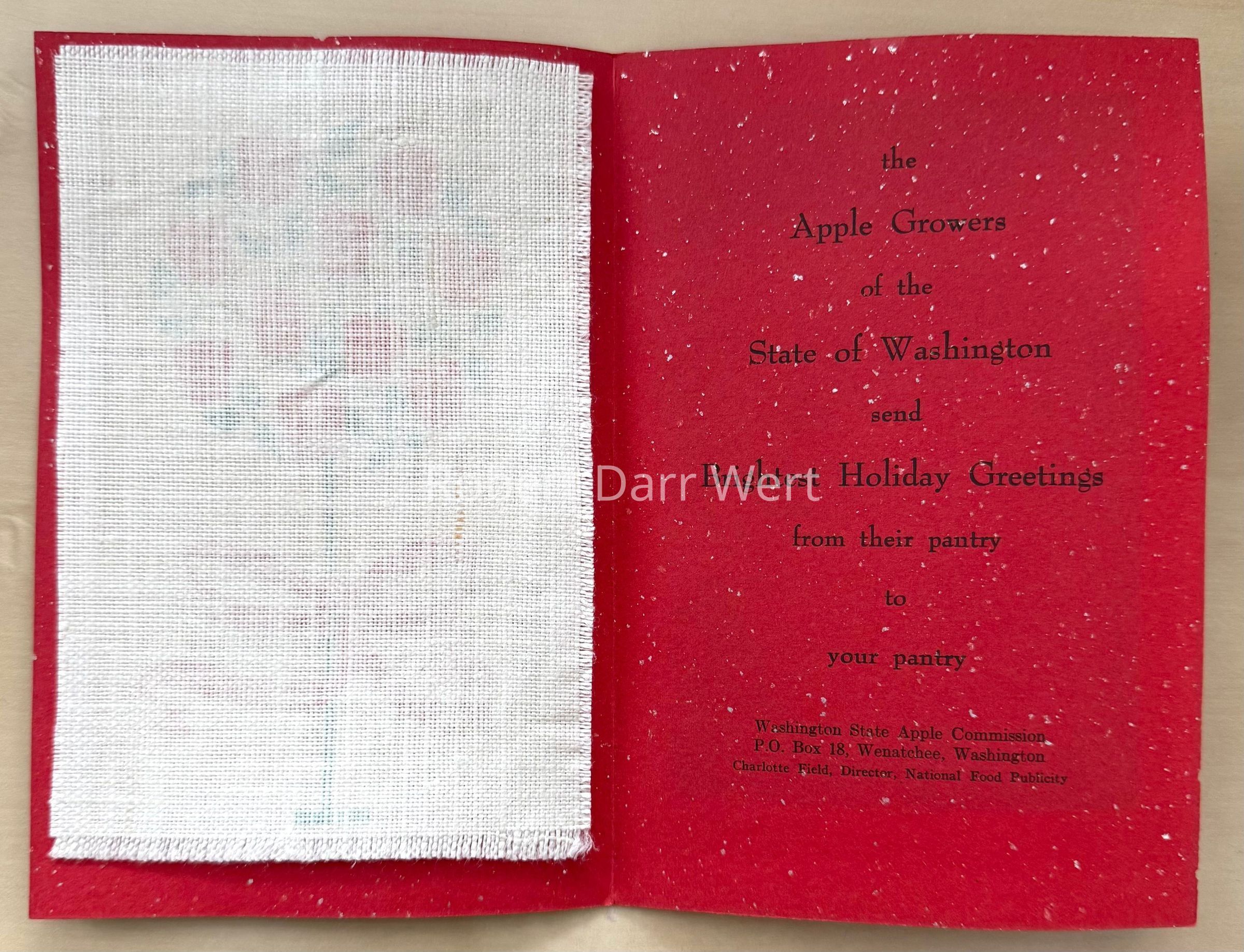 Another example of this card in the collection of Kathryn Zentner bears a holiday greeting from the Apple Commission on the interior; see photos.Made/Created