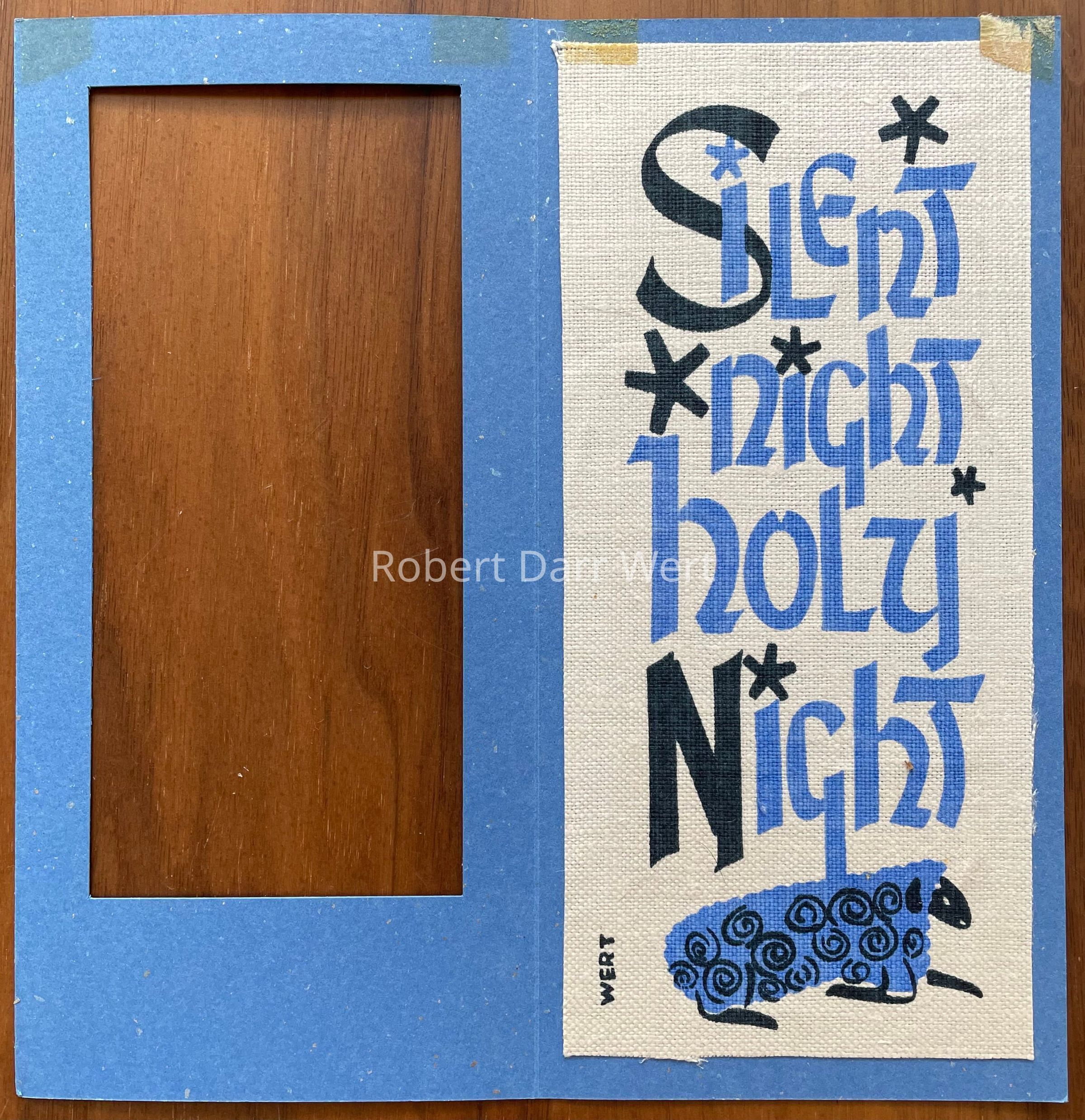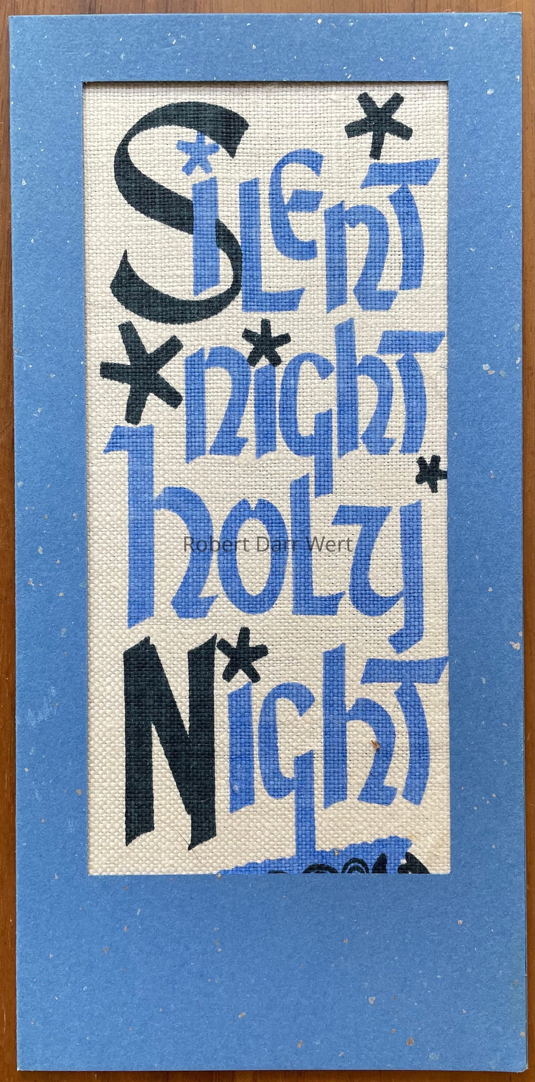 A two-color silkscreen print on off-white linen mounted within a matted single-fold greeting card of blue cardstock accented with silver flecks. The print features the first line of the traditional Christmas song, “Silent Night”. A sheep lies at the base of the composition.