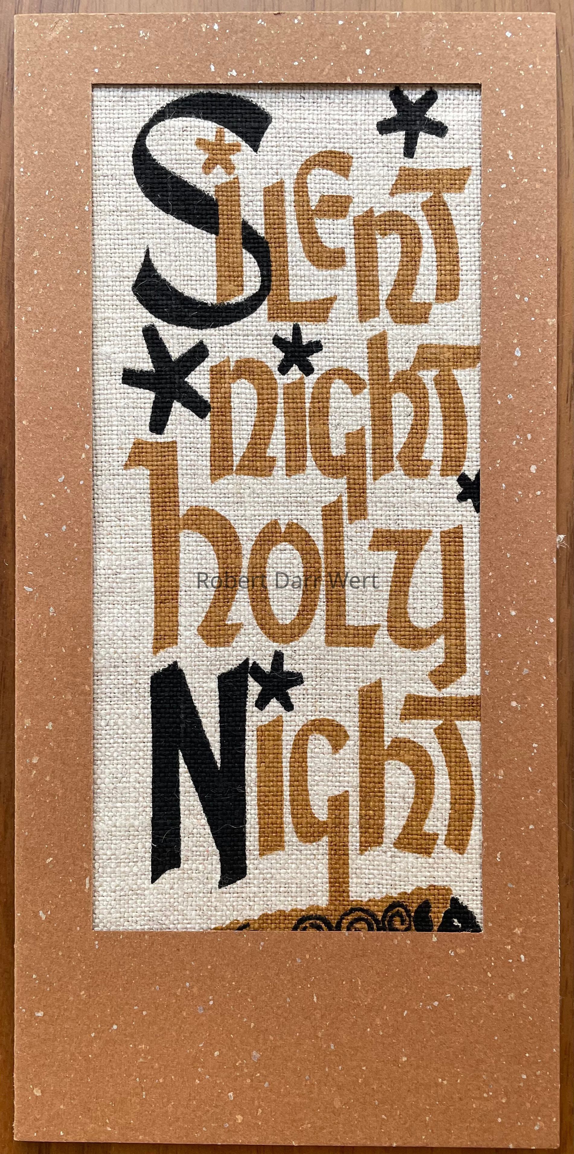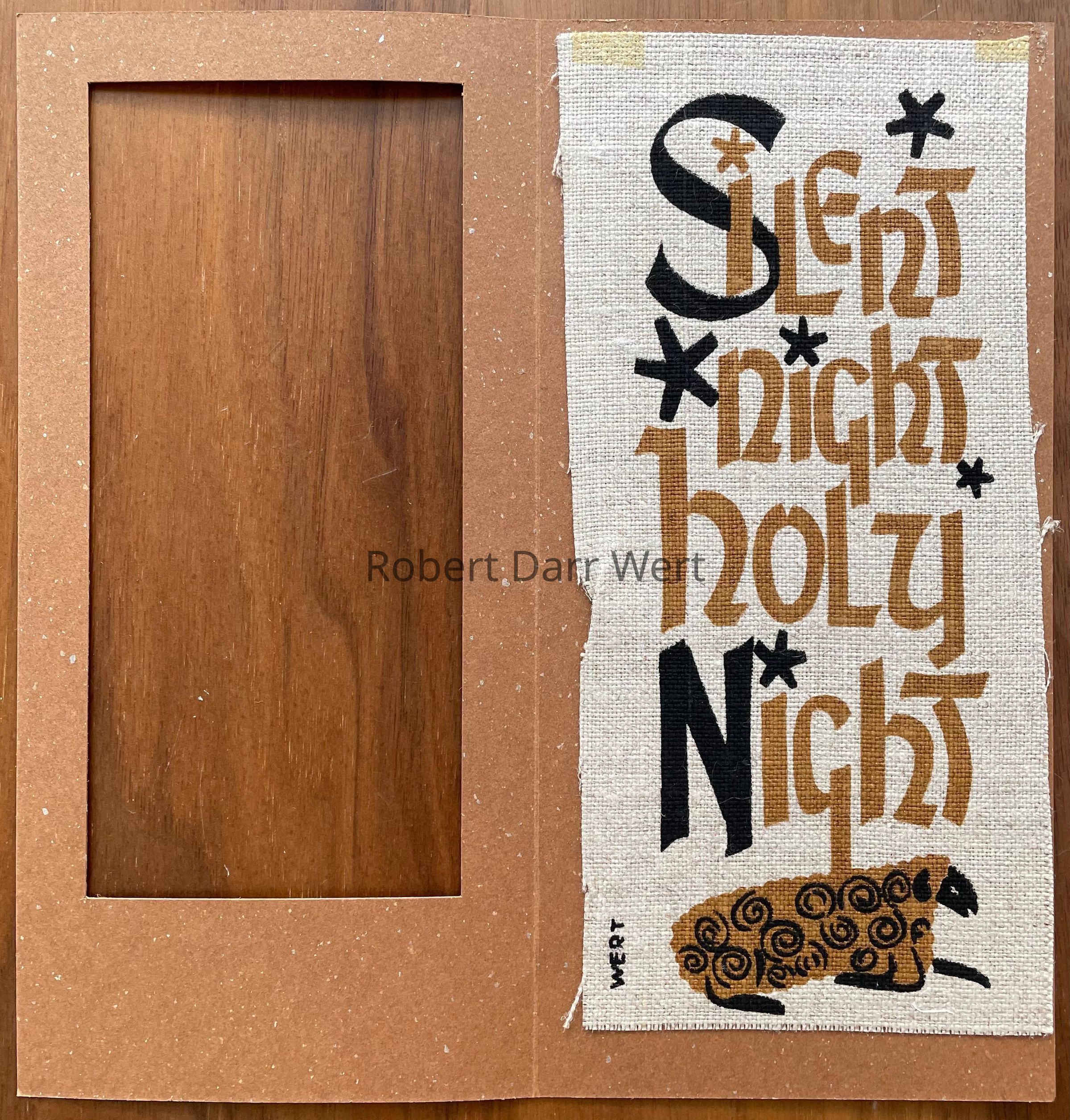 A two-color silkscreen print on natural linen mounted within a matted single-fold greeting card of brown cardstock accented with silver flecks. The print features the first line of the traditional Christmas song, “Silent Night”. A sheep lies at the base of the composition.