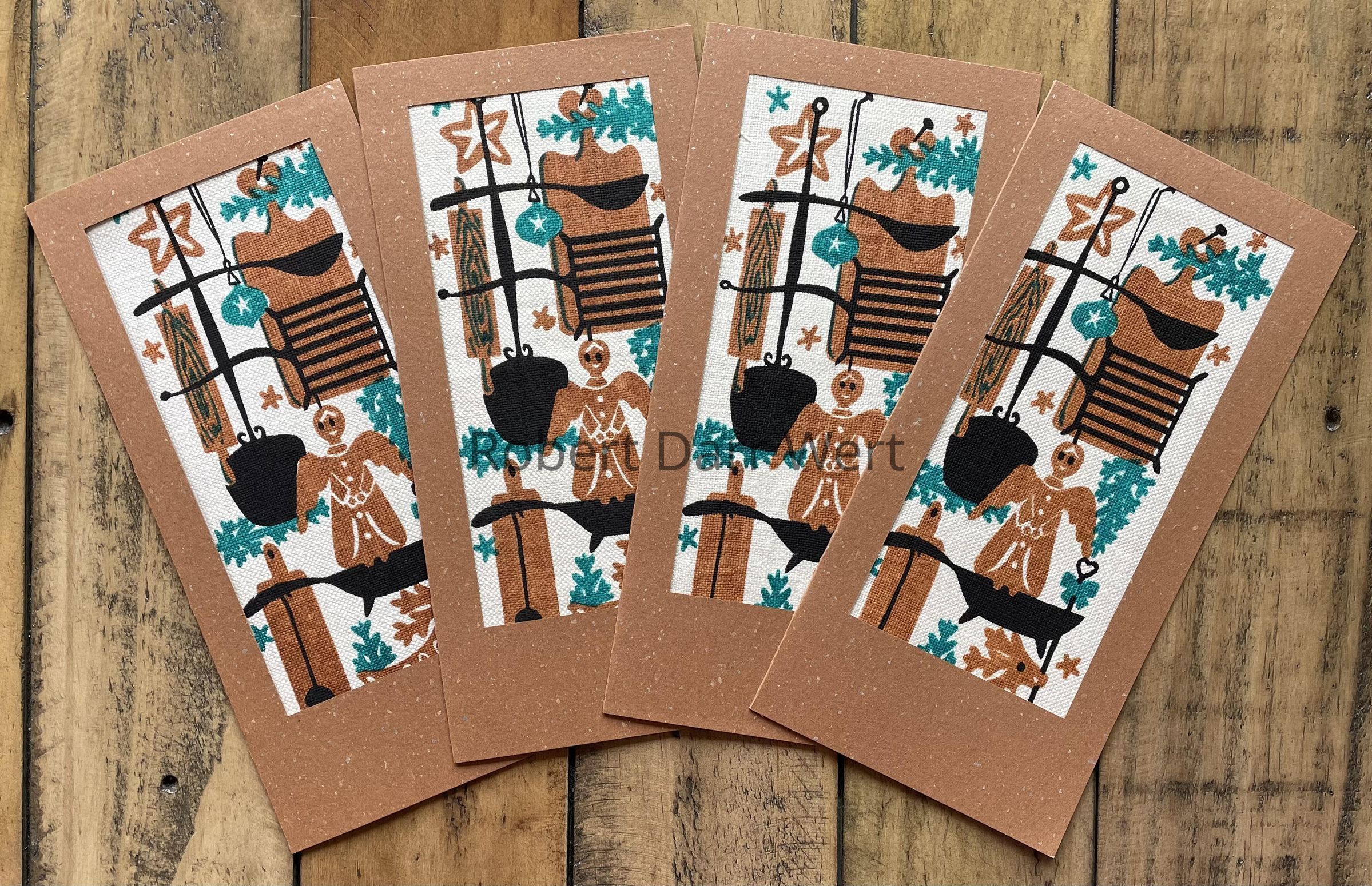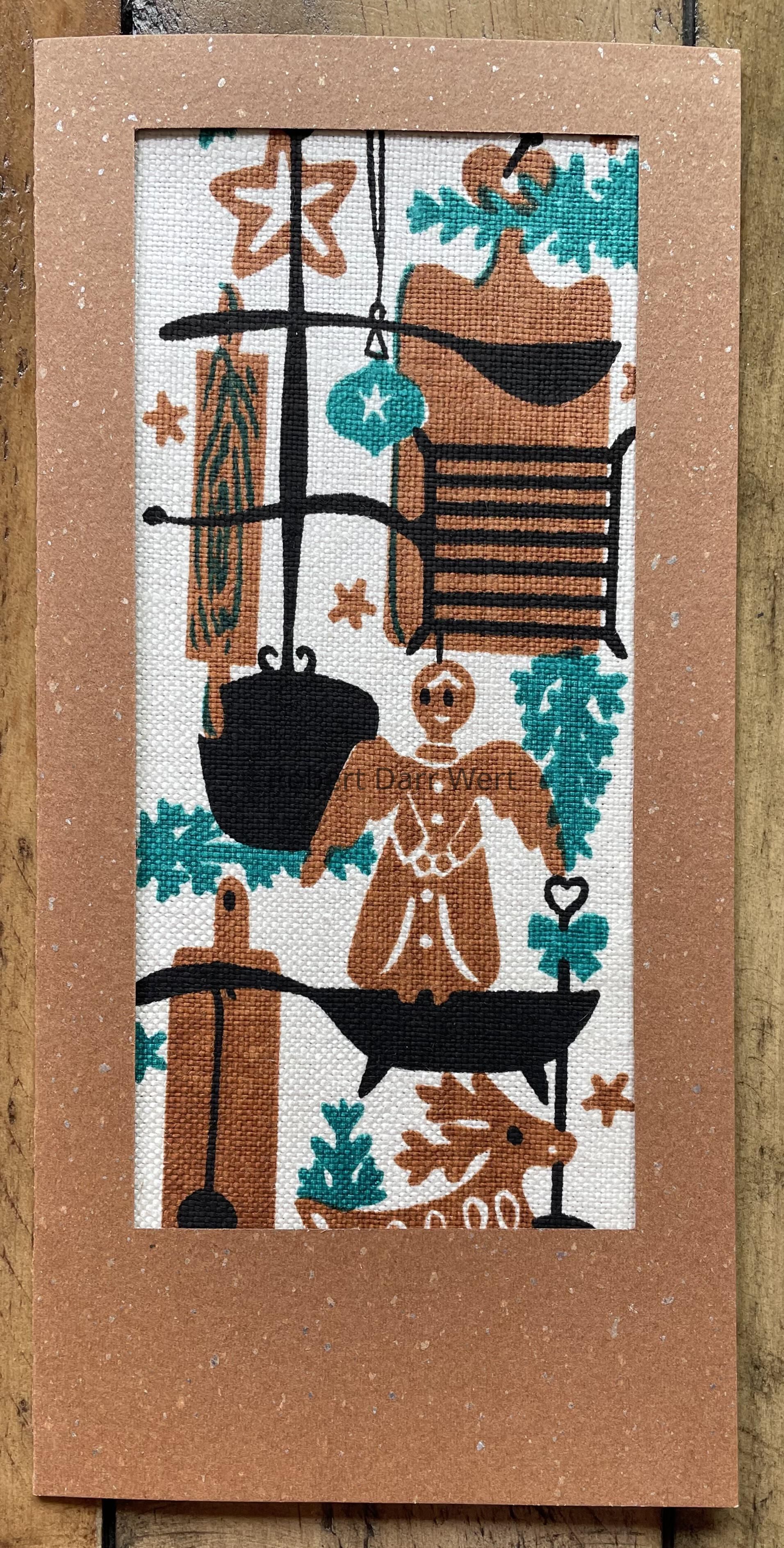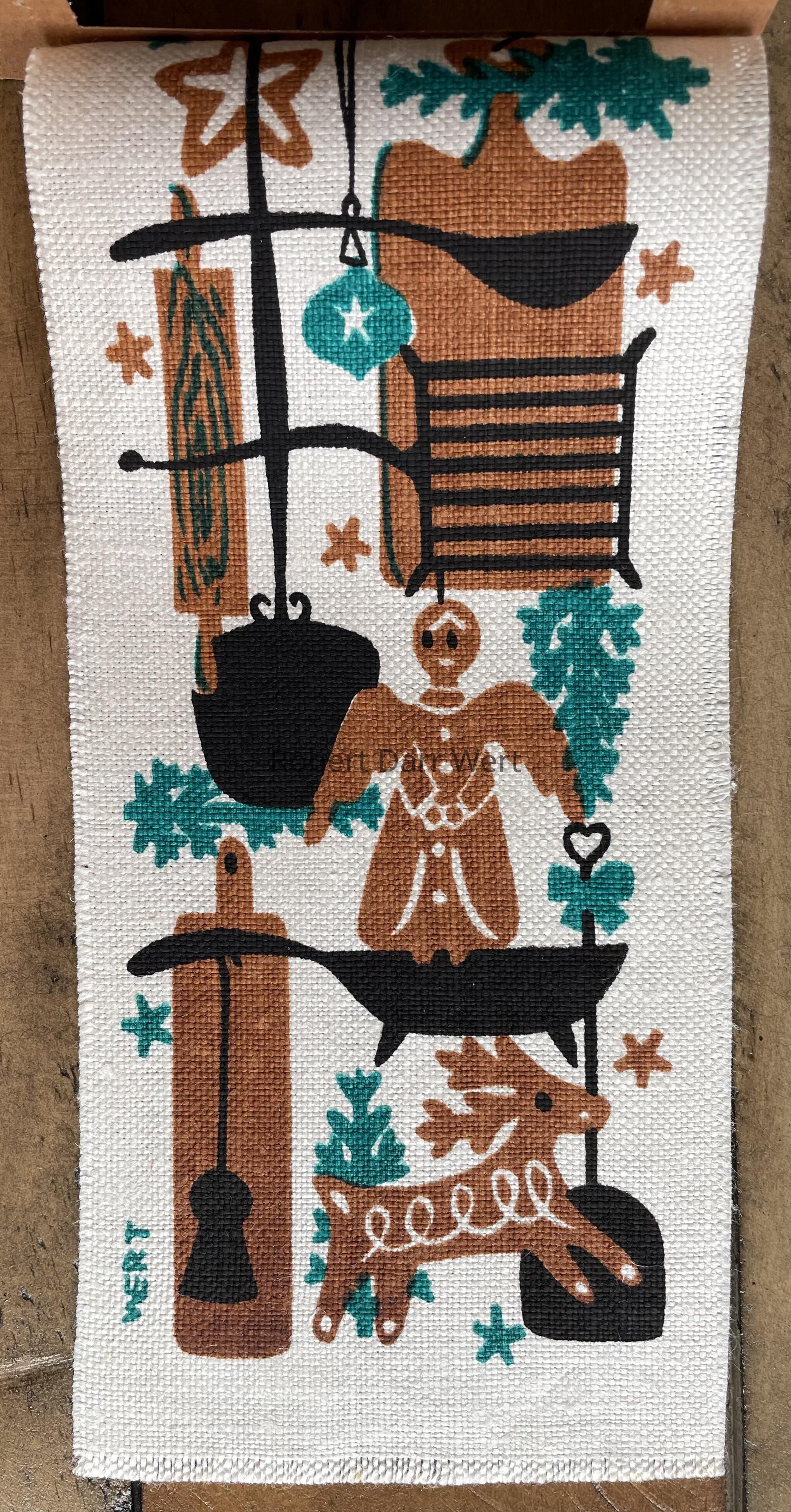 The subject of the print is aligned with Wert’s “Holiday Kitchen” wall hangings, a theme he explored many times with delightful results. Cooking implements, decorated gingerbread cookies, a glass ornament, and pine boughs complete the composition.