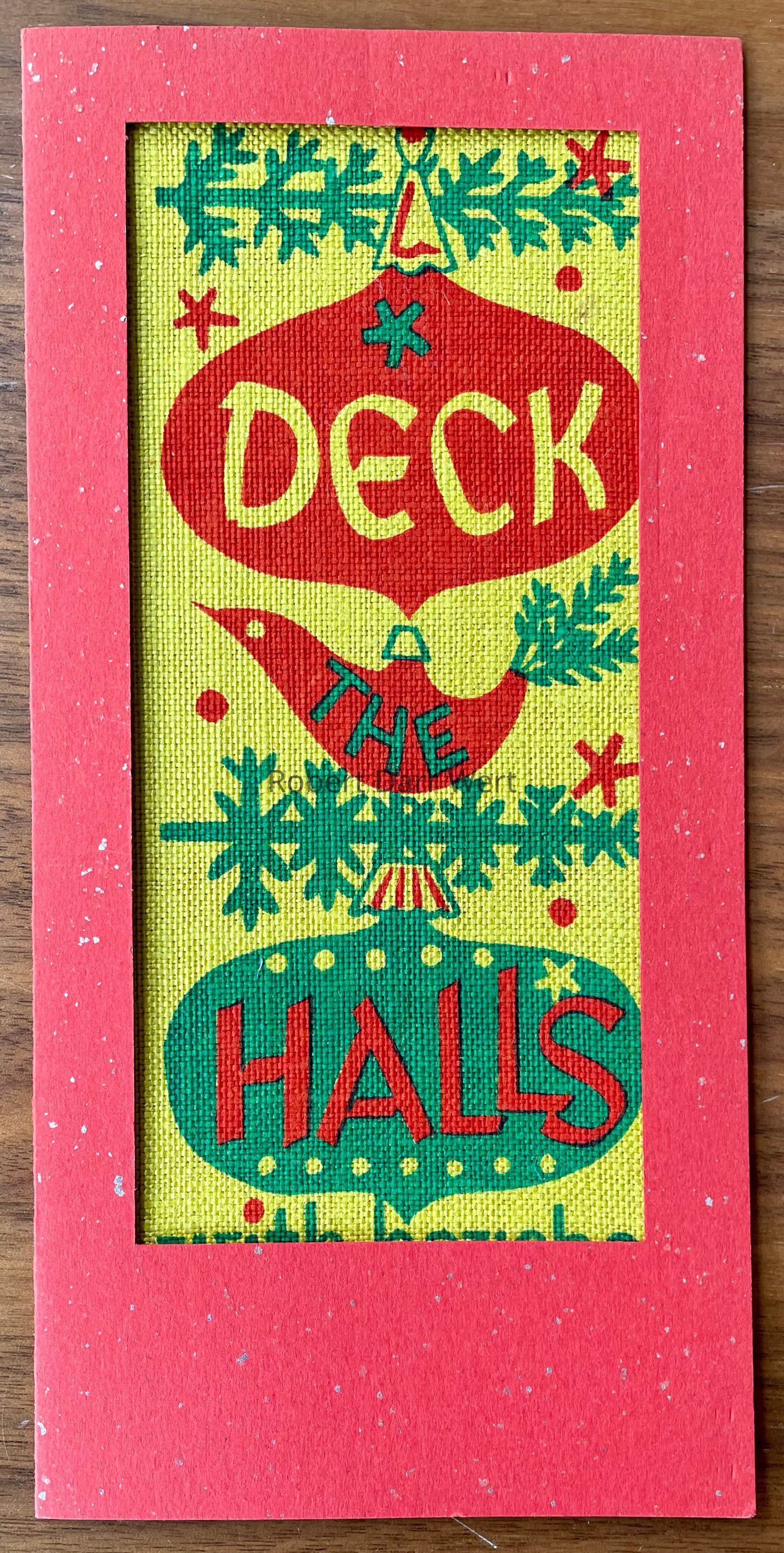 A two-color silkscreen print on dyed yellow linen depicting three glass Christmas ornaments hanging from pine boughs. The ornaments are emblazoned with “DECK THE HALLS”, followed by “with boughs of holly”, the first line of the traditional Christmas carol, “Deck the Halls”.