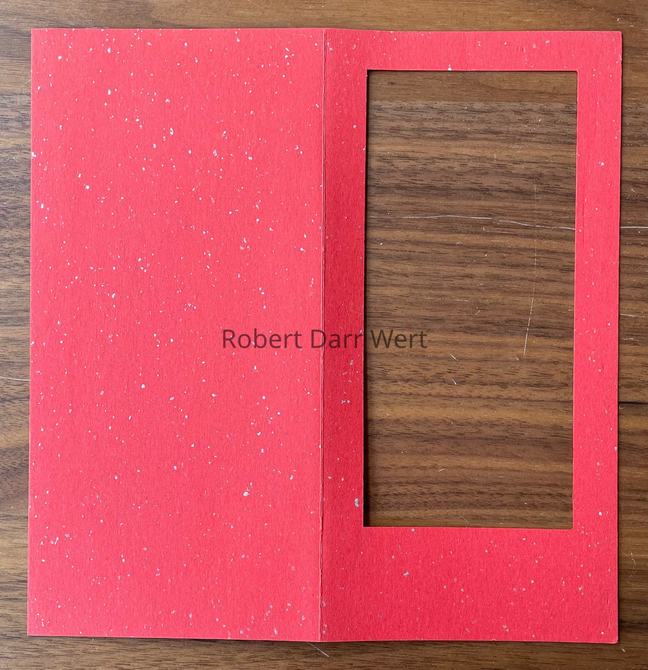 The linen print is affixed with glue to the back inside face of a red notecard with silver flecks.Made/Created