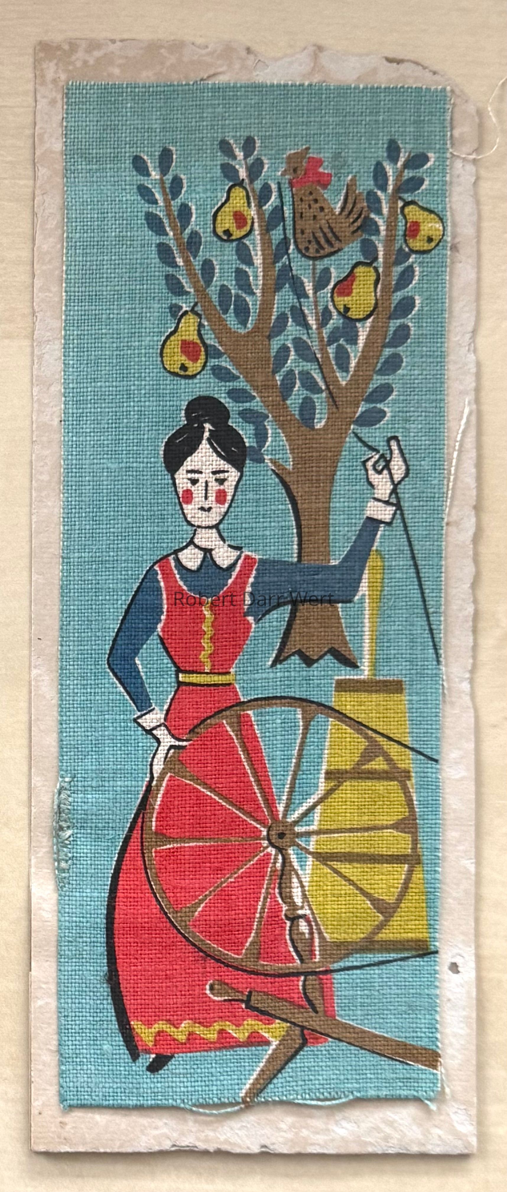 A six screen silkscreen print on white linen depicting the first day of Christmas from the traditional song “The Twelve Days of Christmas”. A woman in eighteenth century dress spins thread at a spinning wheel, her thread being held aloft by the partridge in the pear tree beyond. A butter churn stands next to the woman.